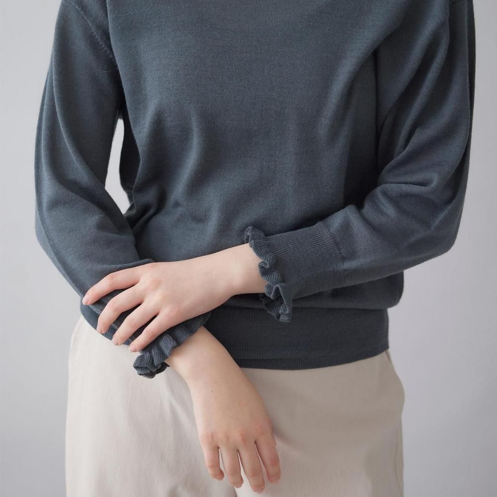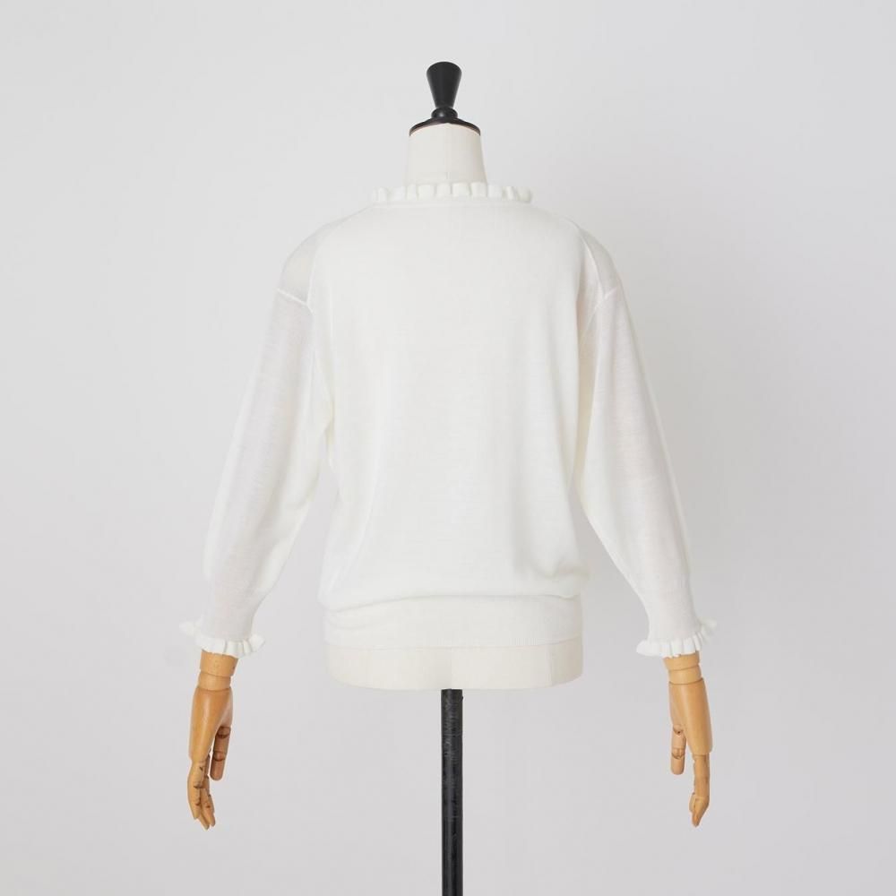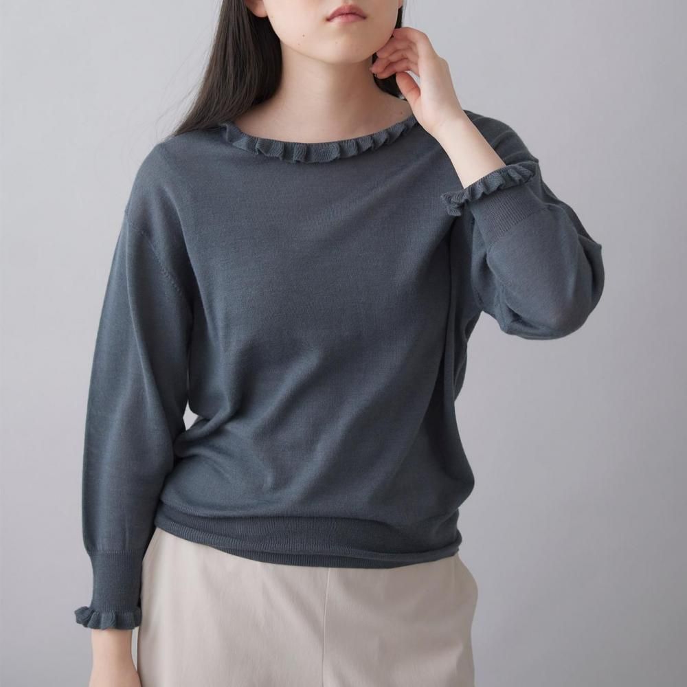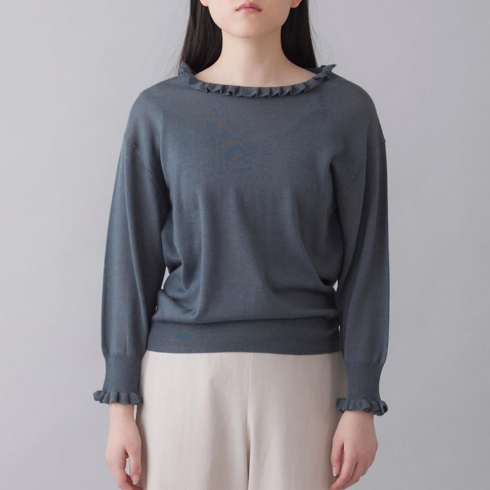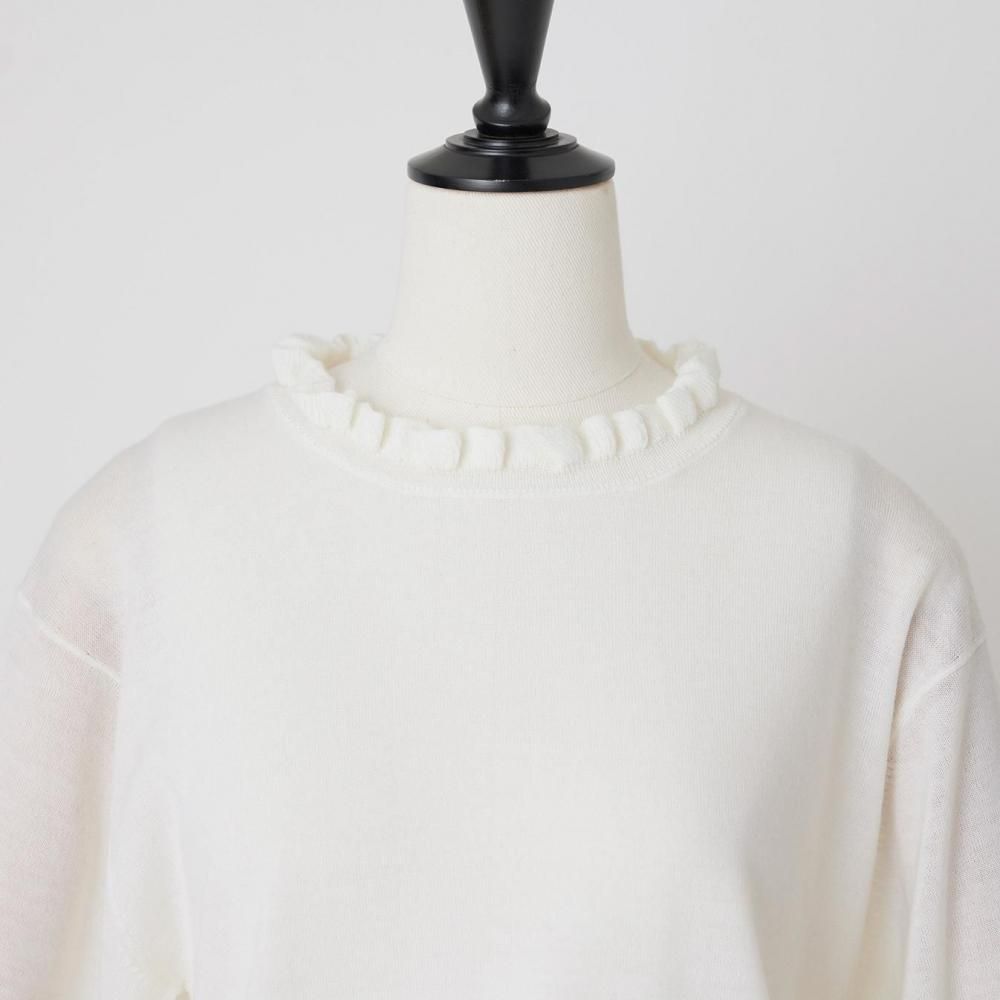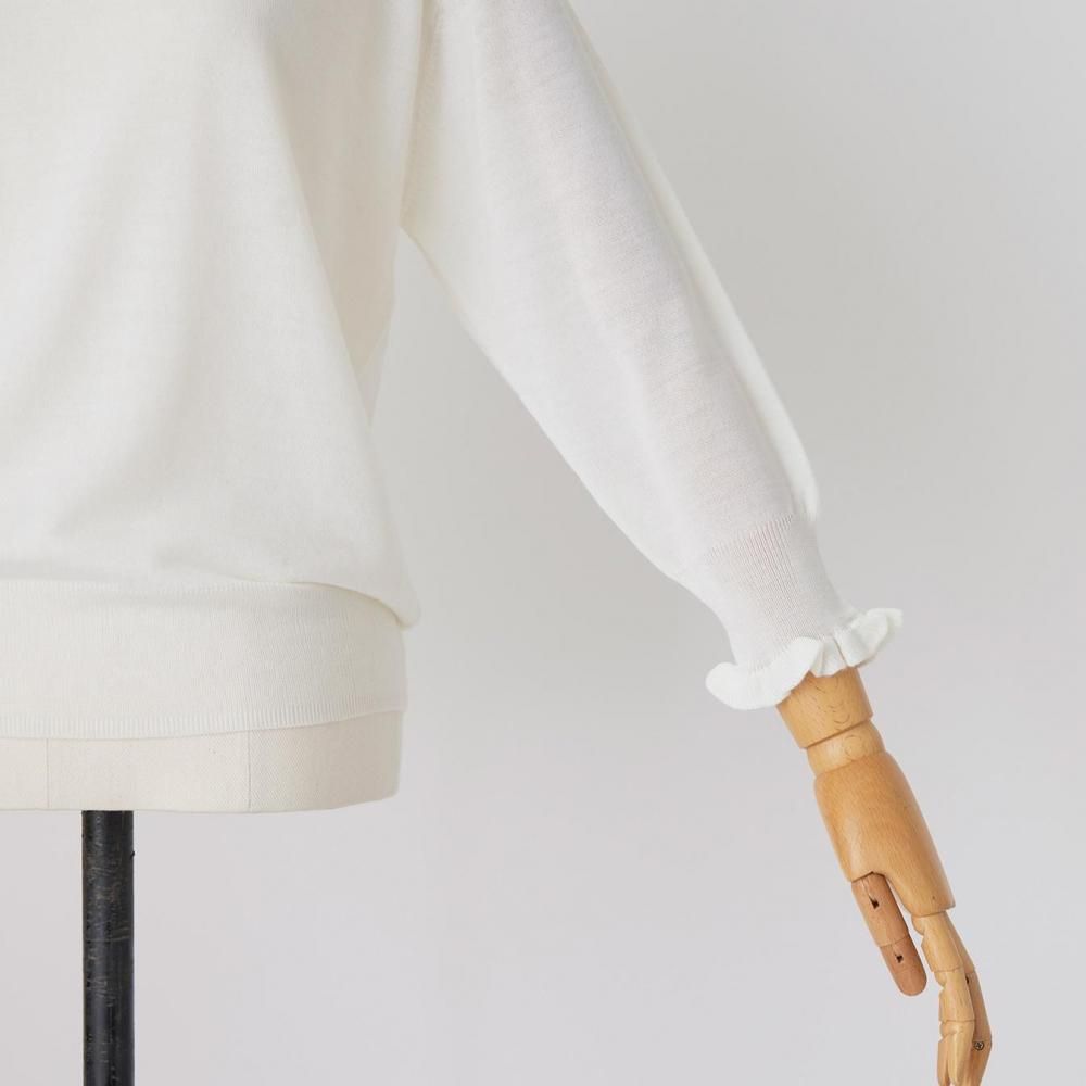 襟元と袖口にあしらったラッフルがさりげなく華やかさを添えるニットプルオーバー。