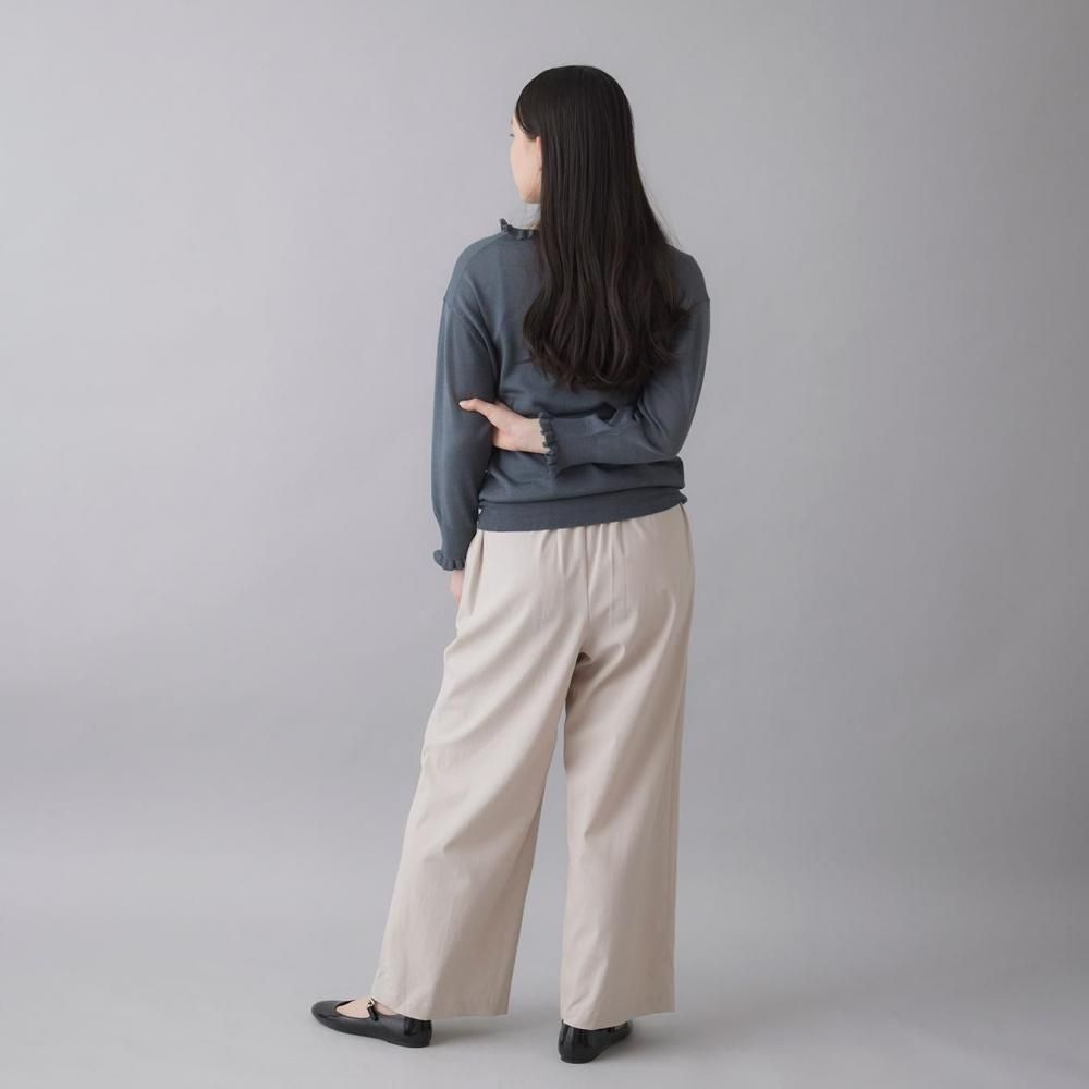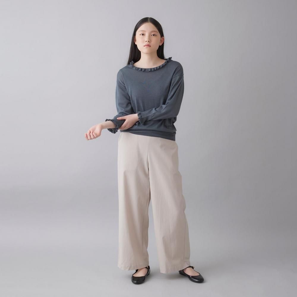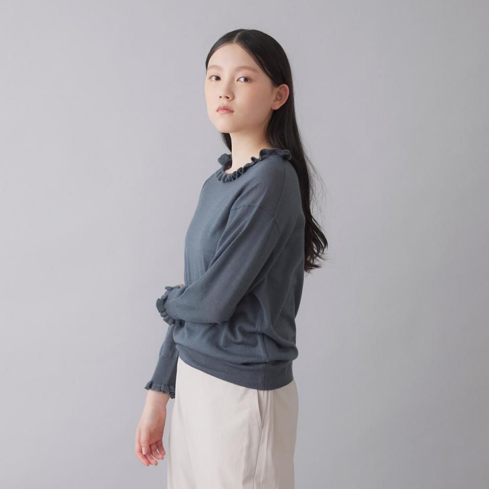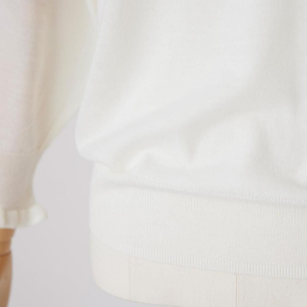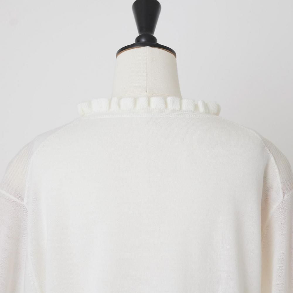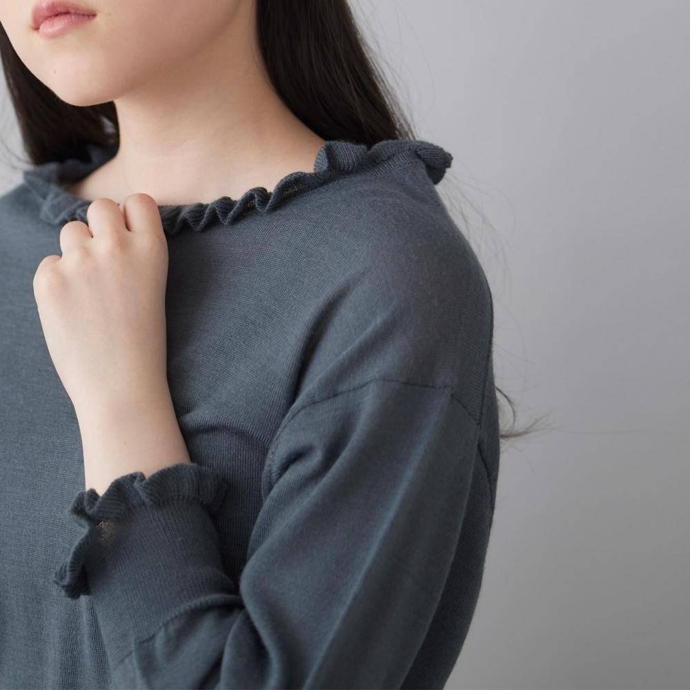 襟元と袖口にあしらったラッフルがさりげなく華やかさを添えるニットプルオーバー。