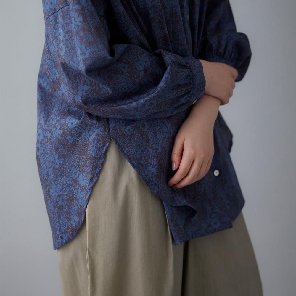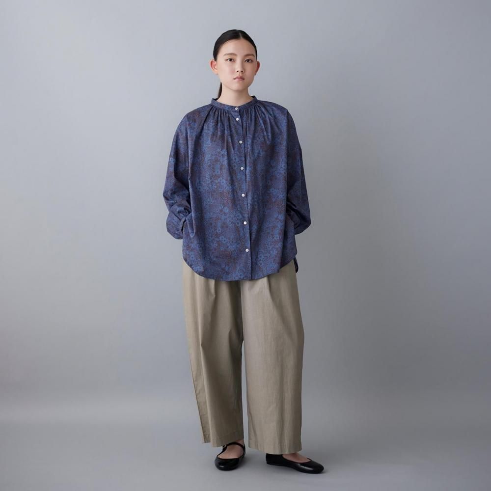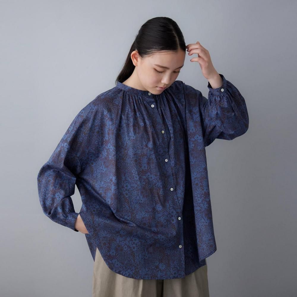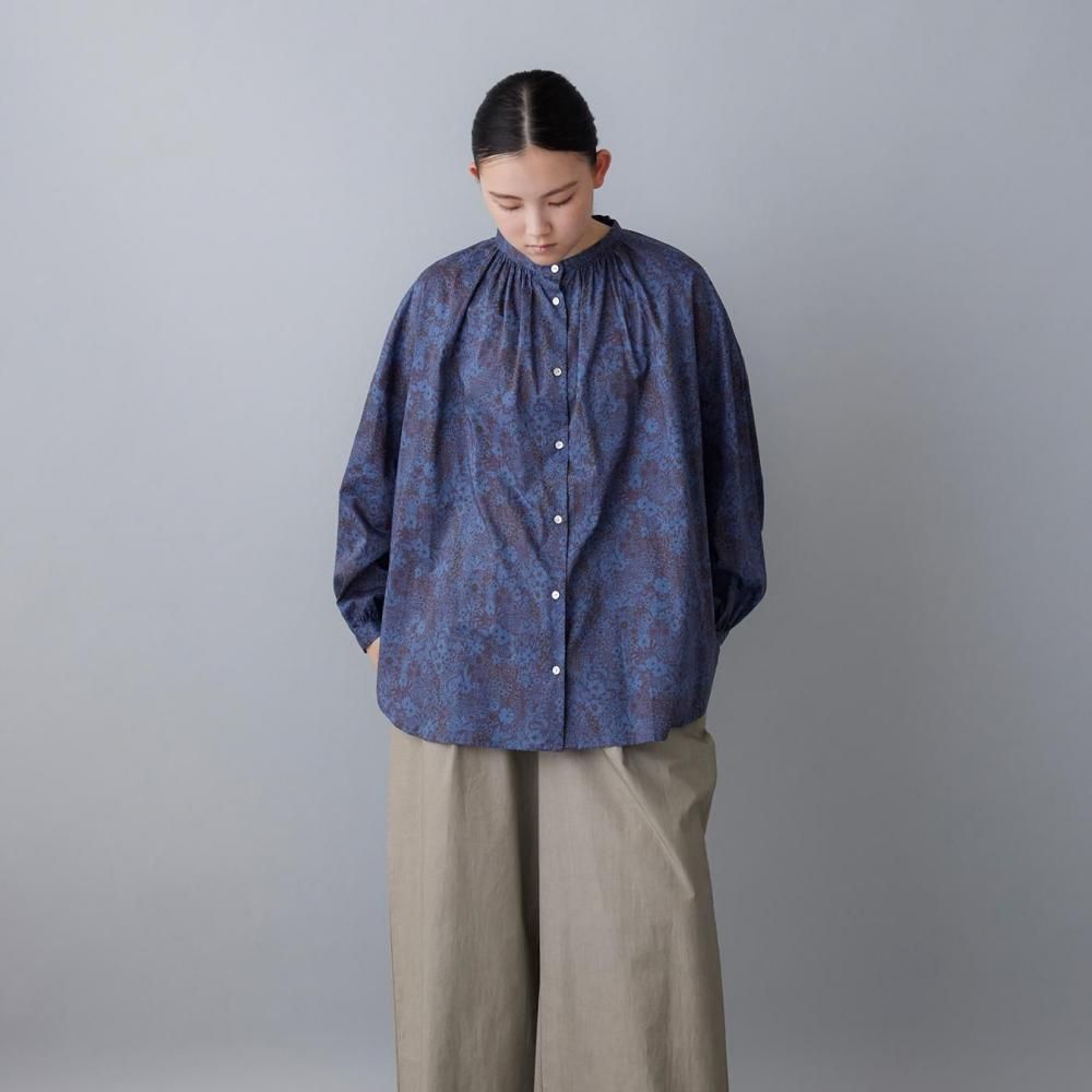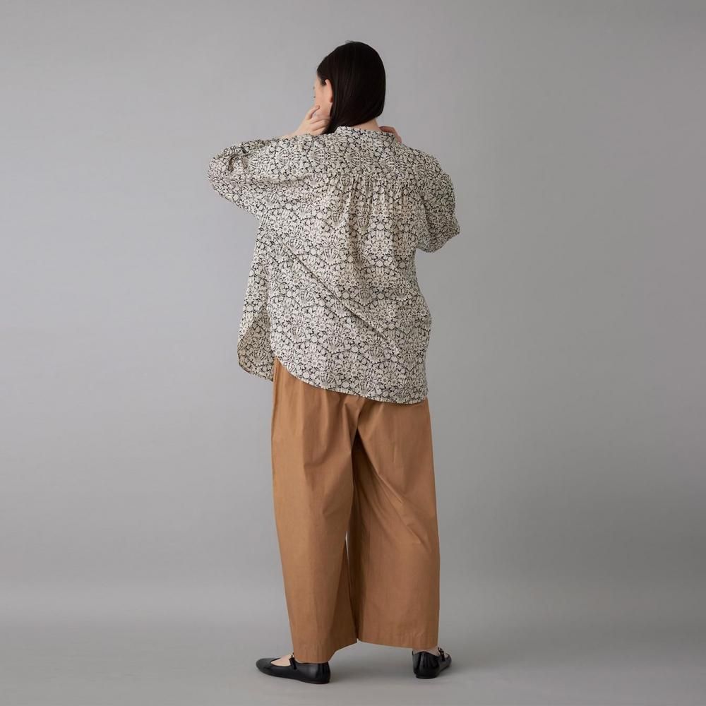 前身頃は襟下から、後ろ見頃は背中から、たっぷりとギャザーを施したブラウス。