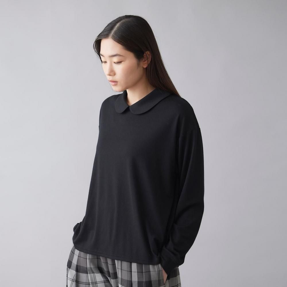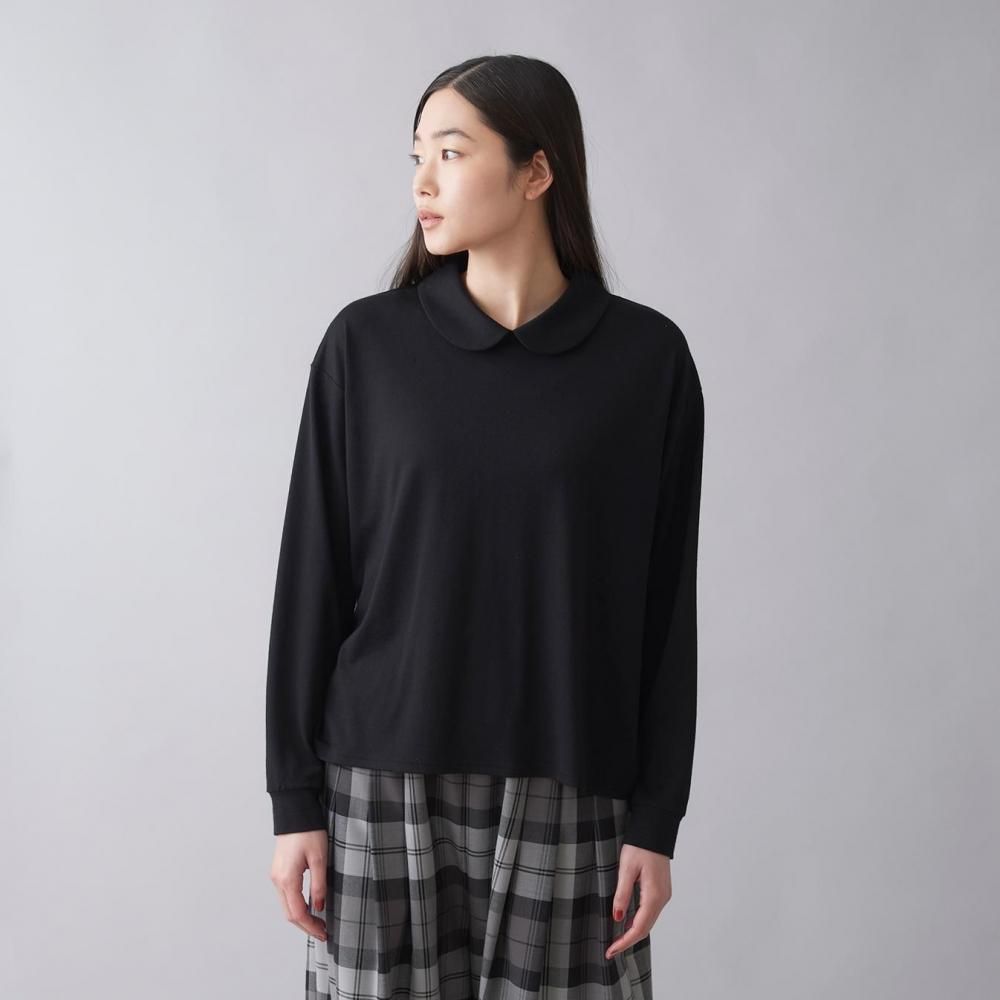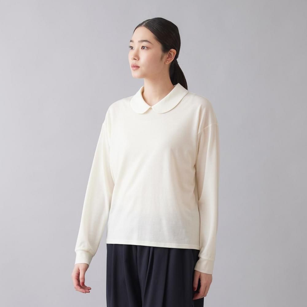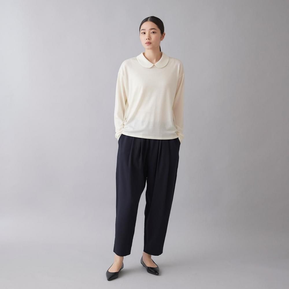 やわらかな丸襟が顔まわりをやさしく包み、女性らしい印象に。