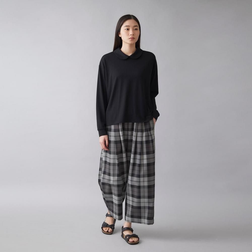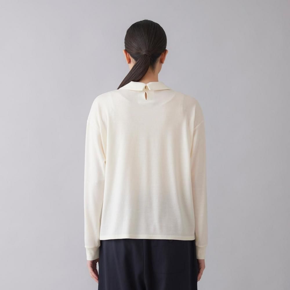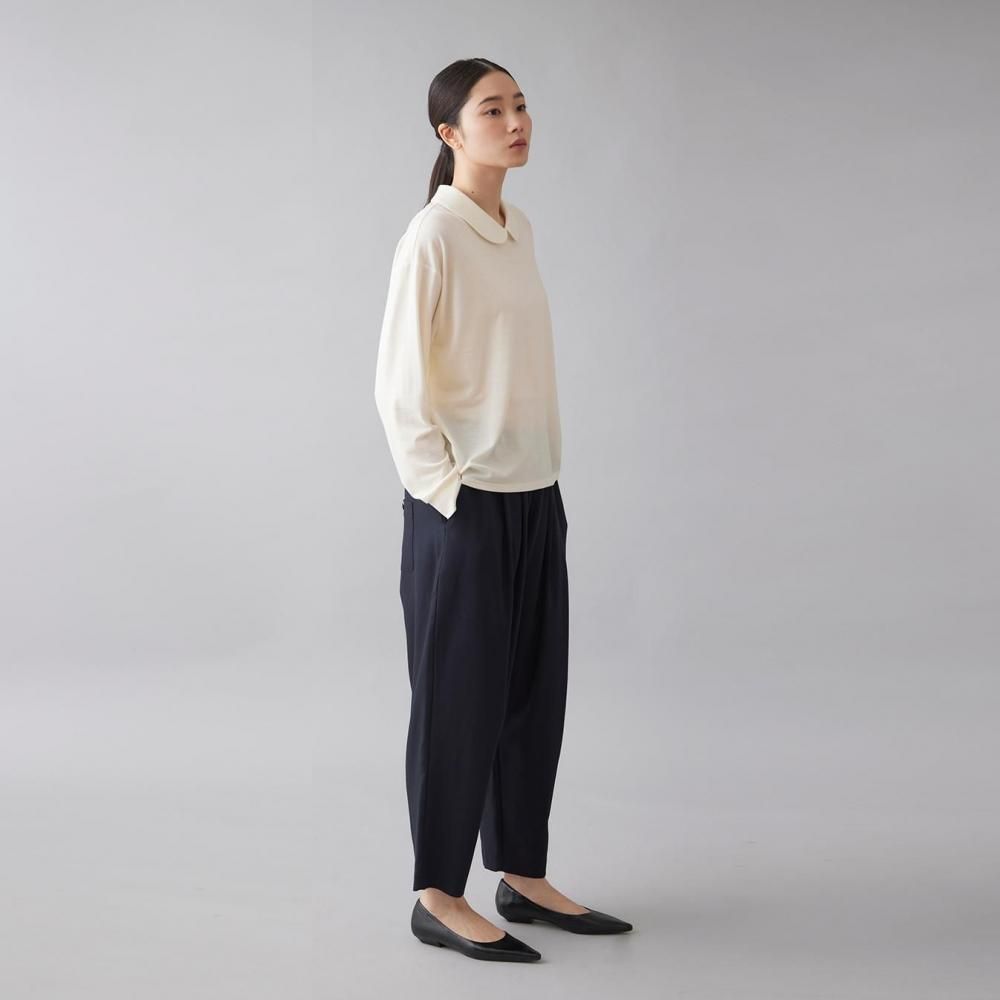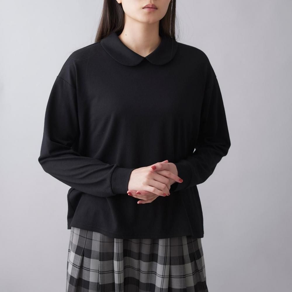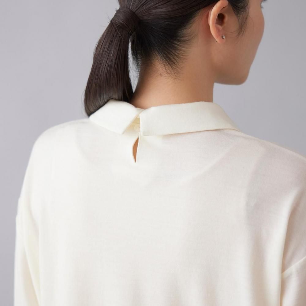 やわらかな丸襟が顔まわりをやさしく包み、女性らしい印象に。