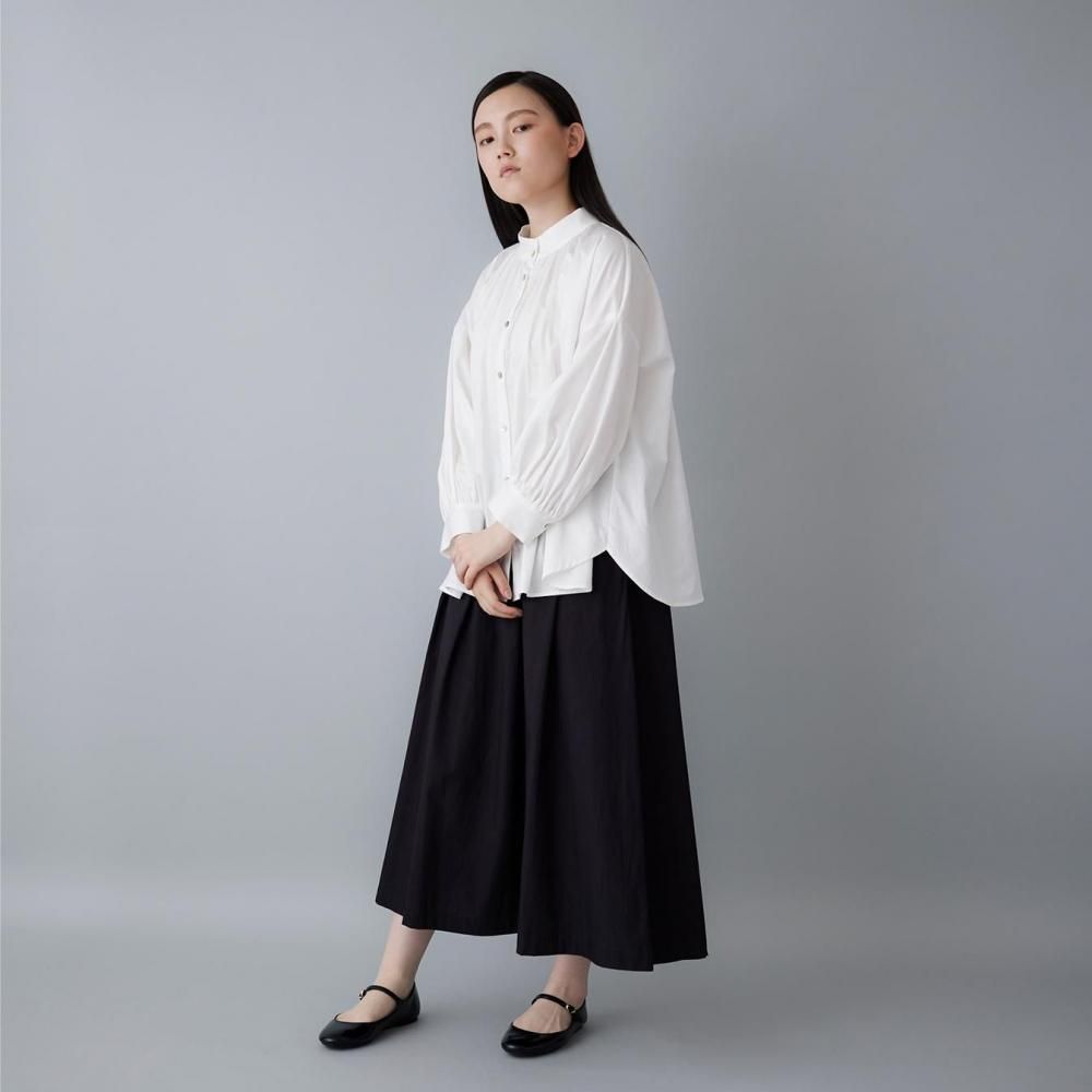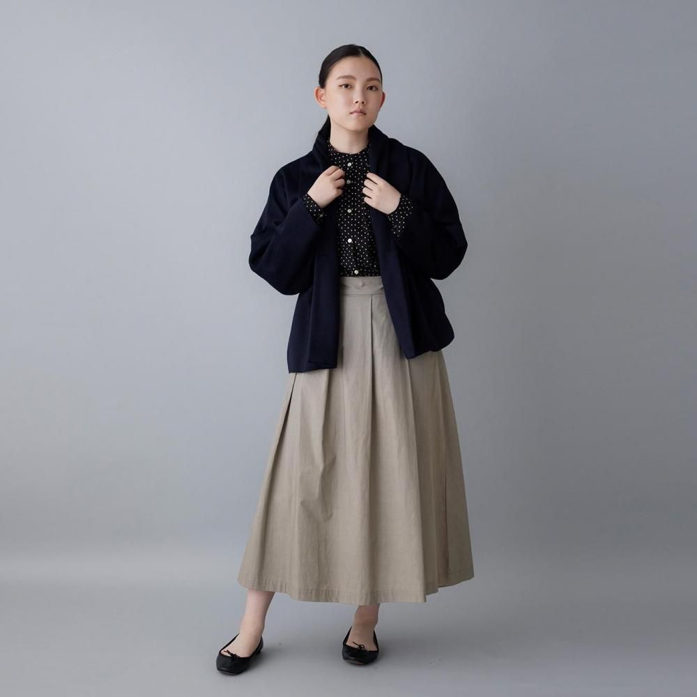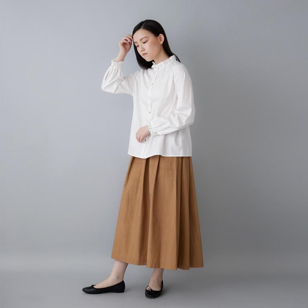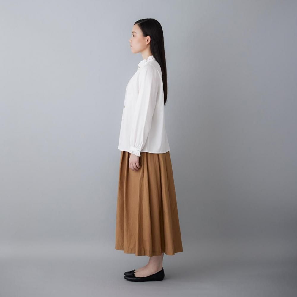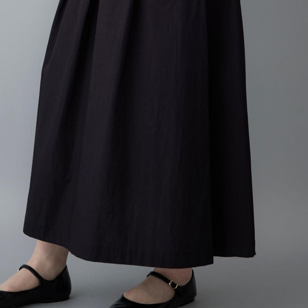ウエストまわりに施したタックが、自然なボリュームを生み出しながらも広がりすぎず、軽やかに揺れる生地感が、歩くたびに女性らしいニュアンスを添えます。