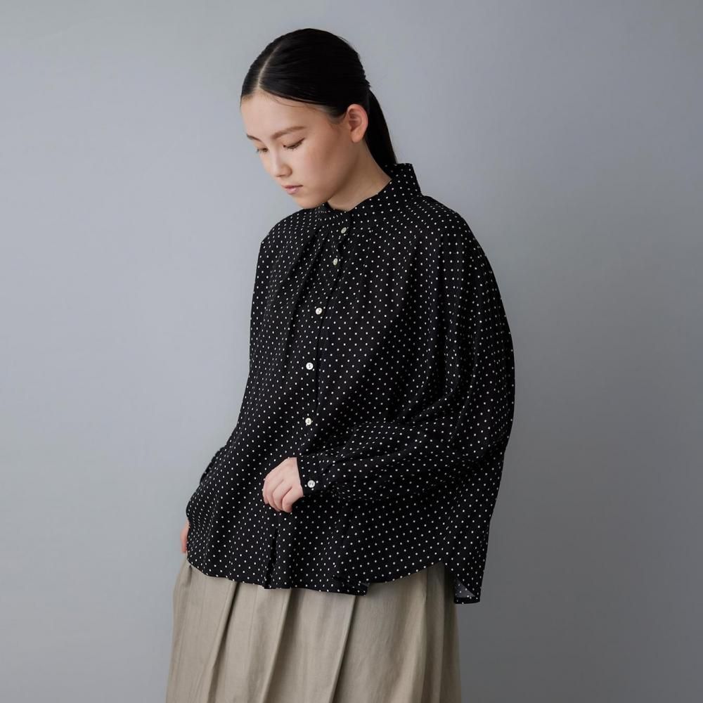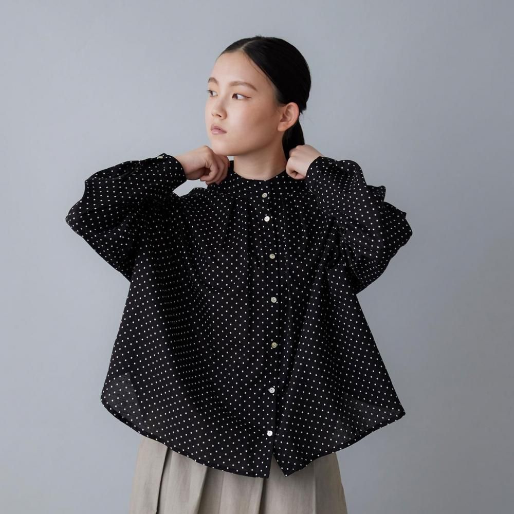 utilitéオリジナルプリントのスクエアドットが上品さを映す、スタンドカラーシャツです。