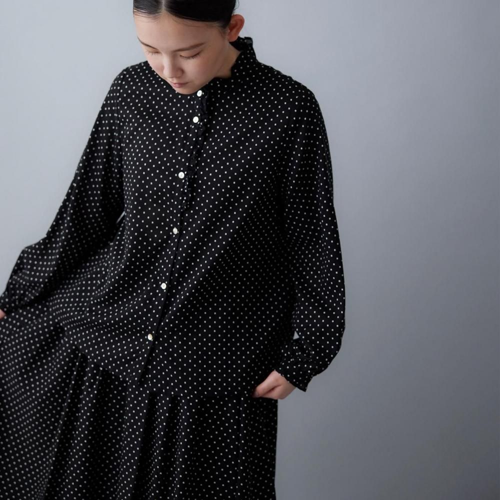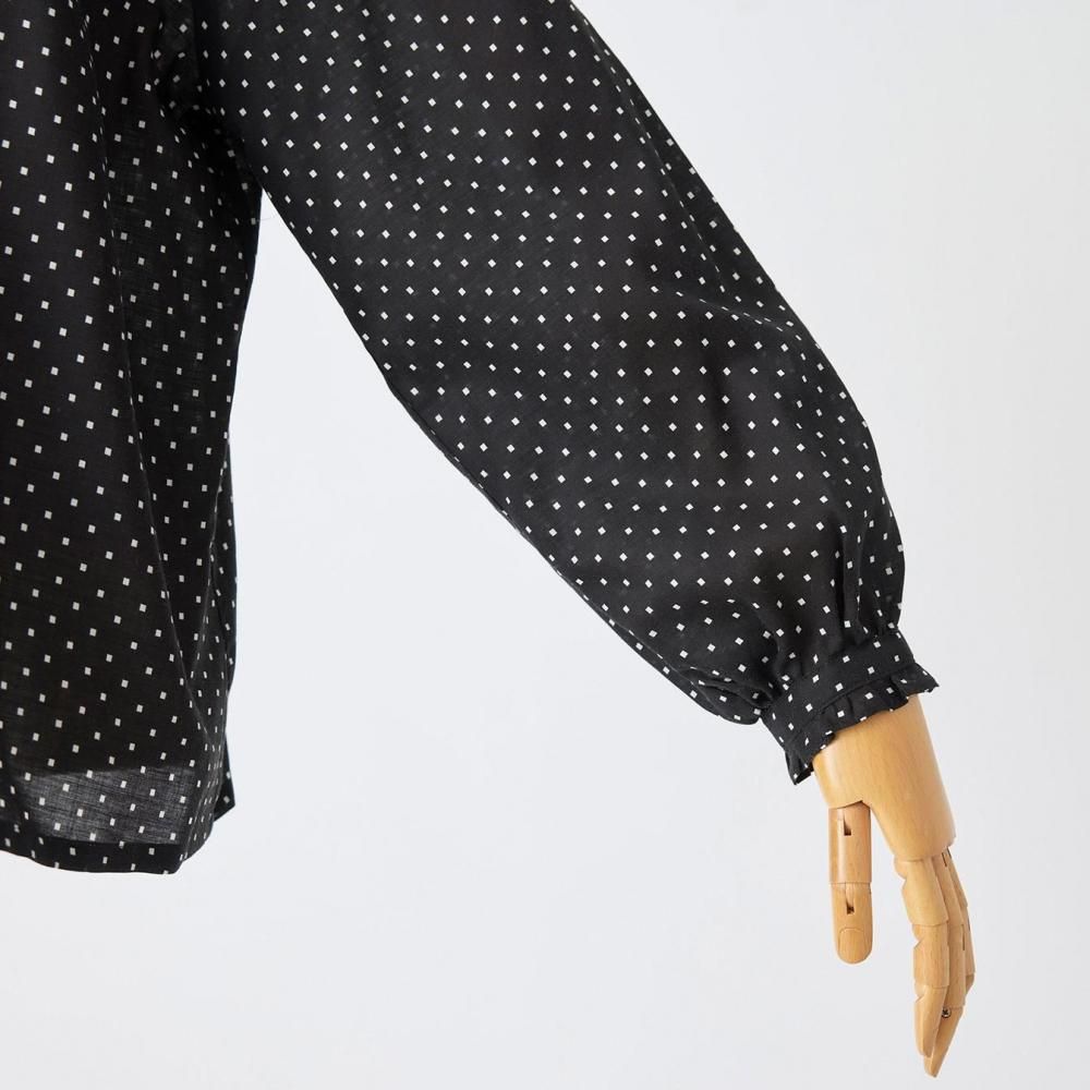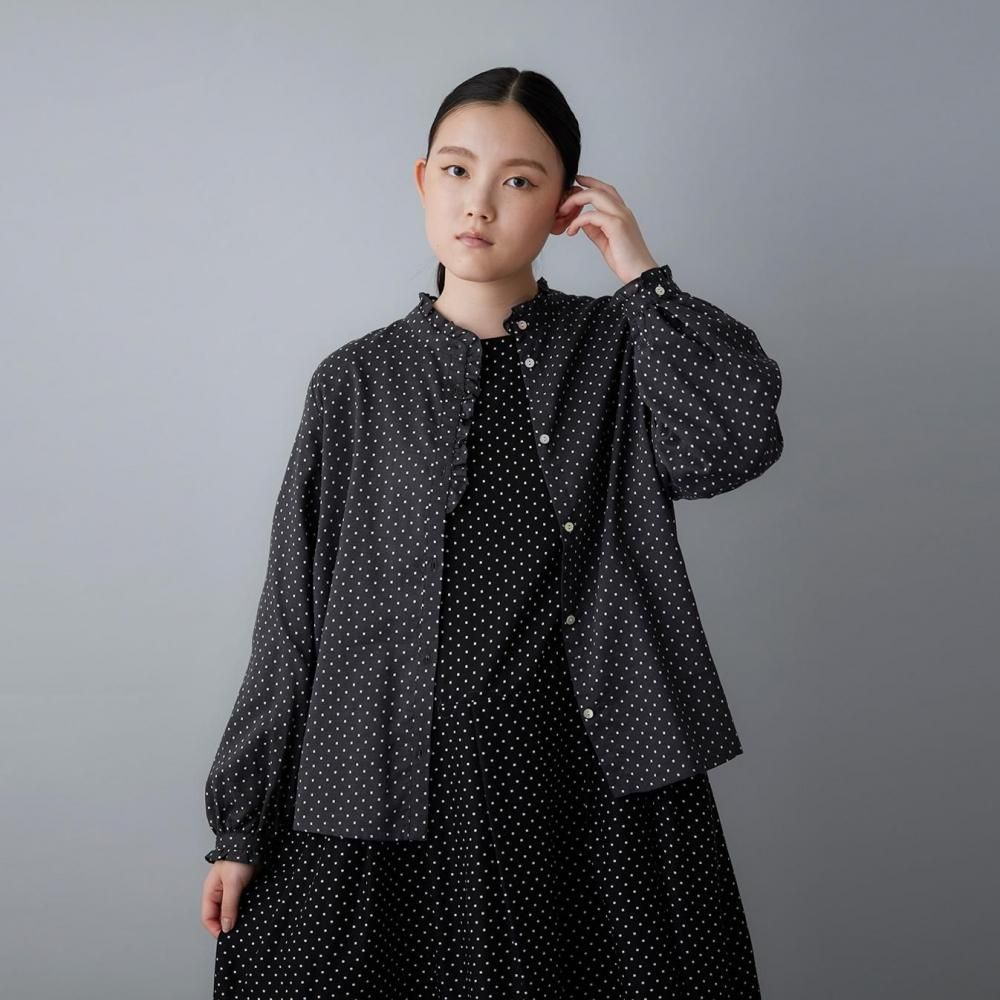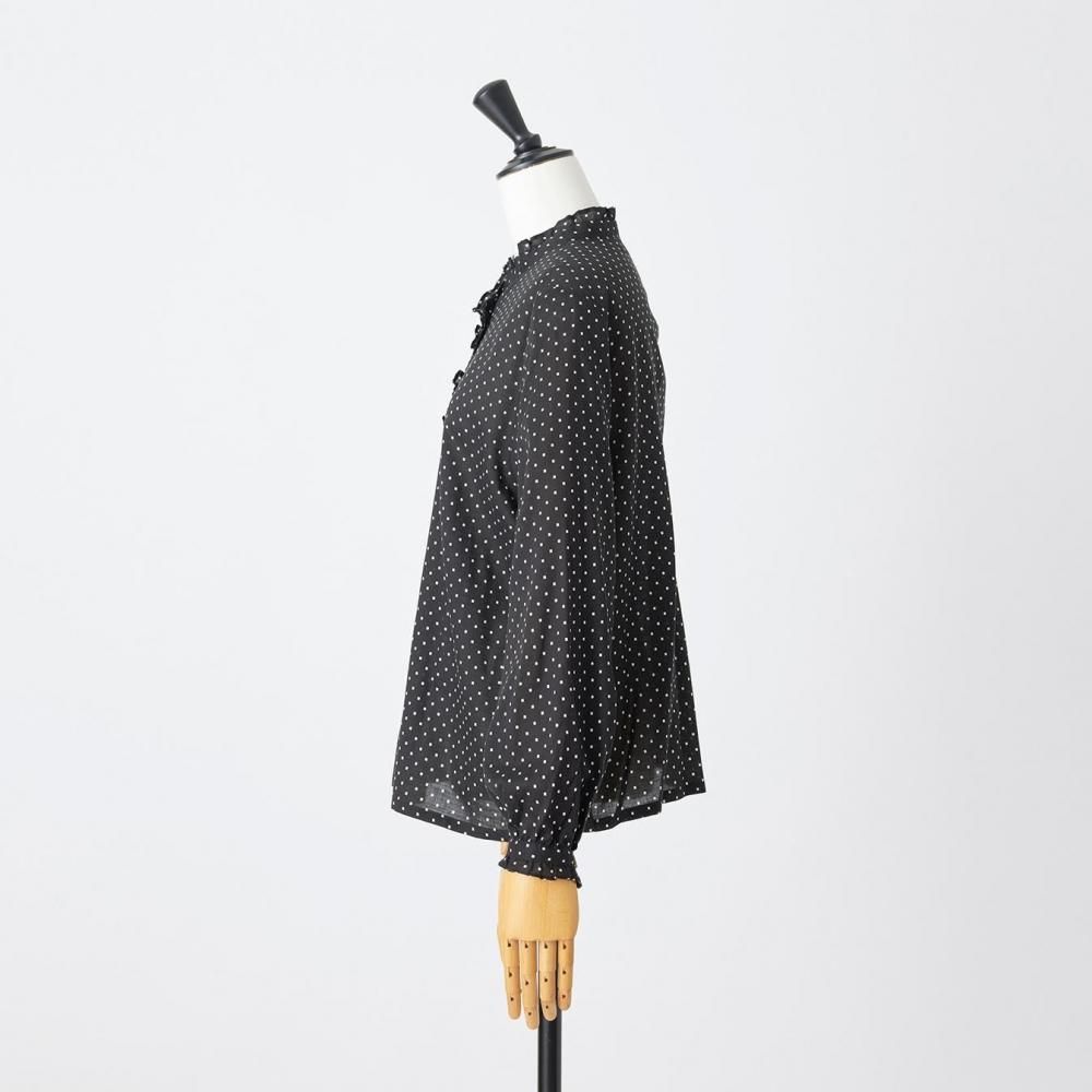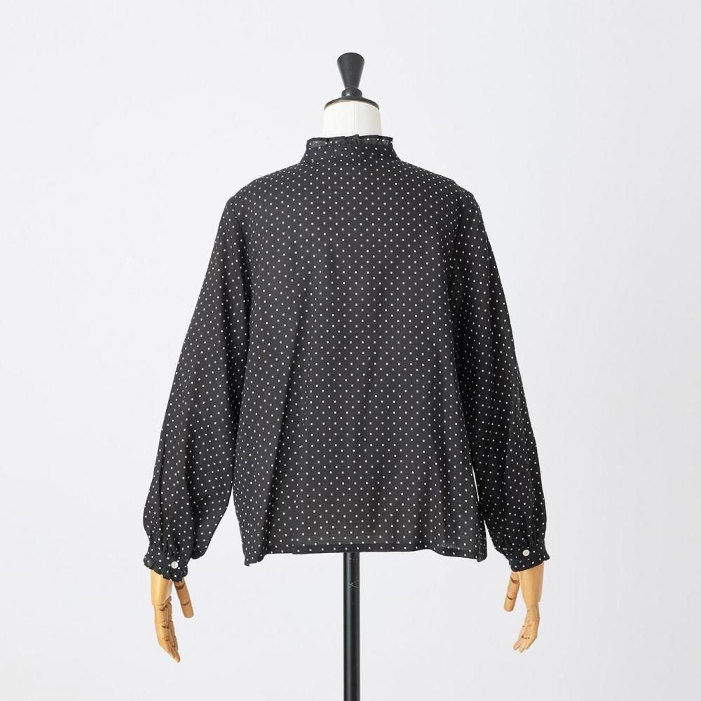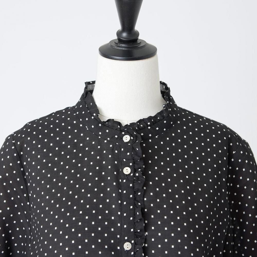 utilitéオリジナルのスクエアドットが上品に映えるフリルブラウスです。