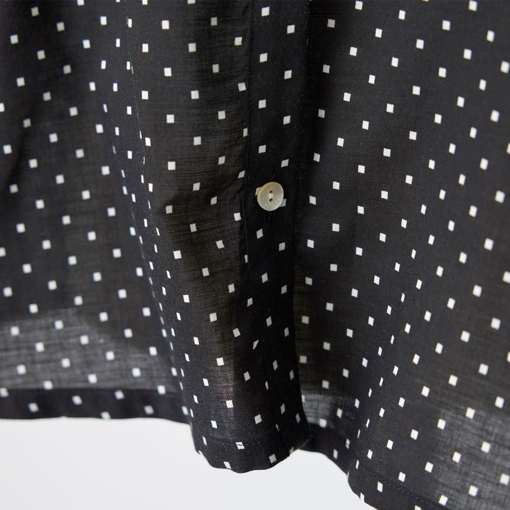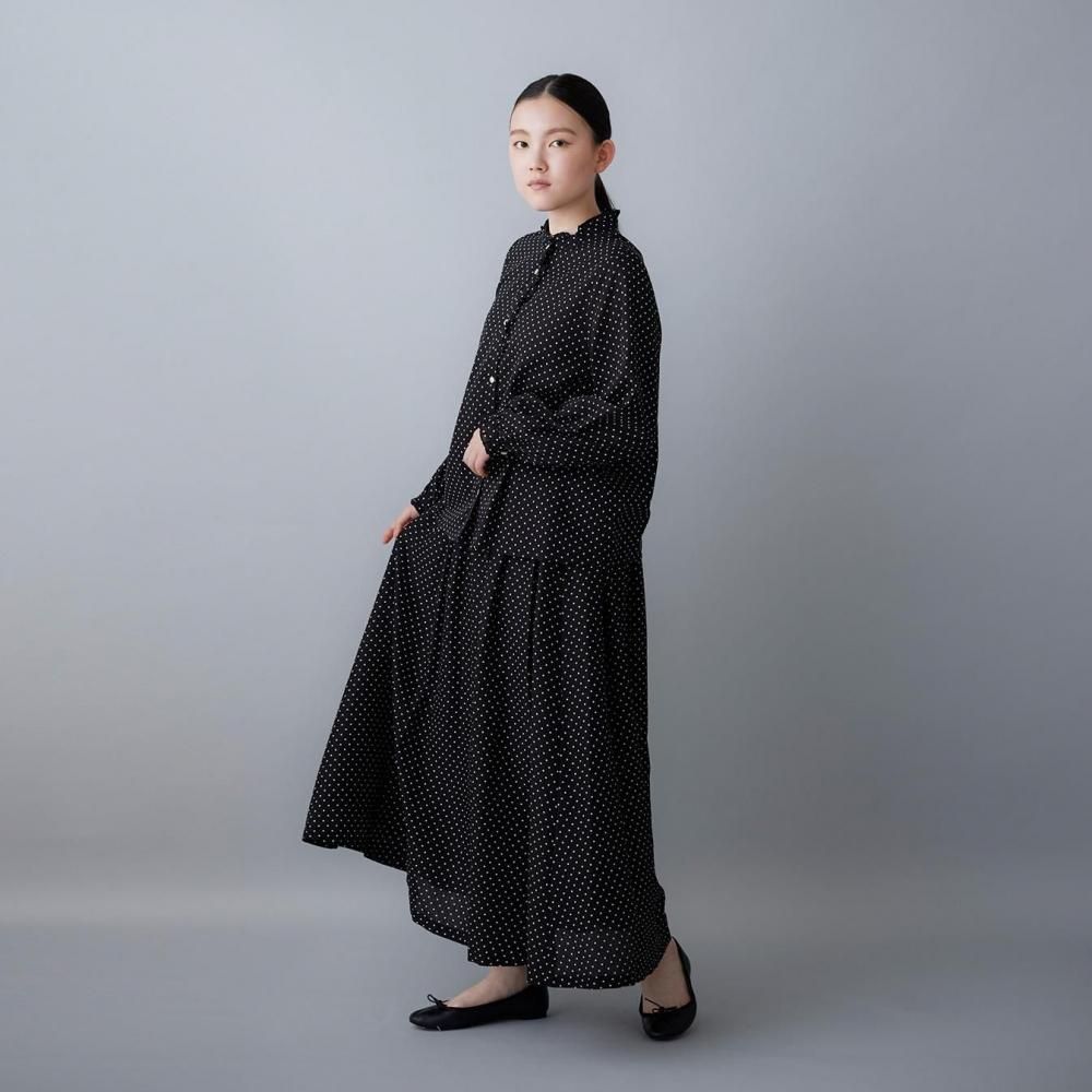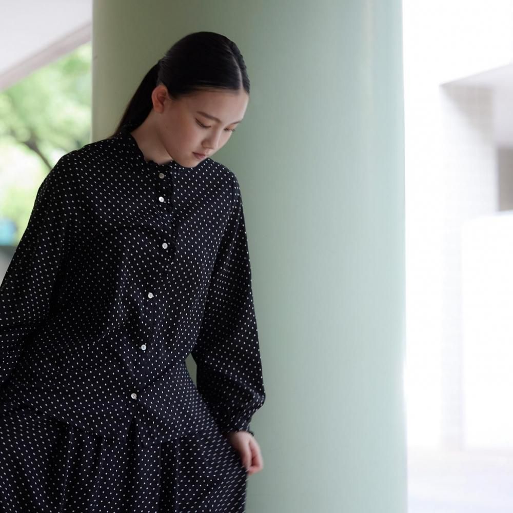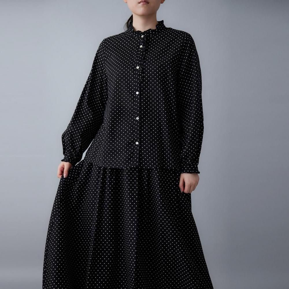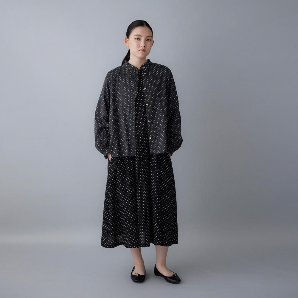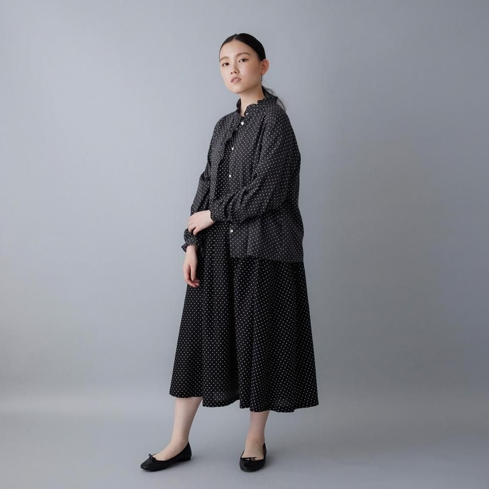 utilitéオリジナルのスクエアドットが上品に映えるフリルブラウスです。