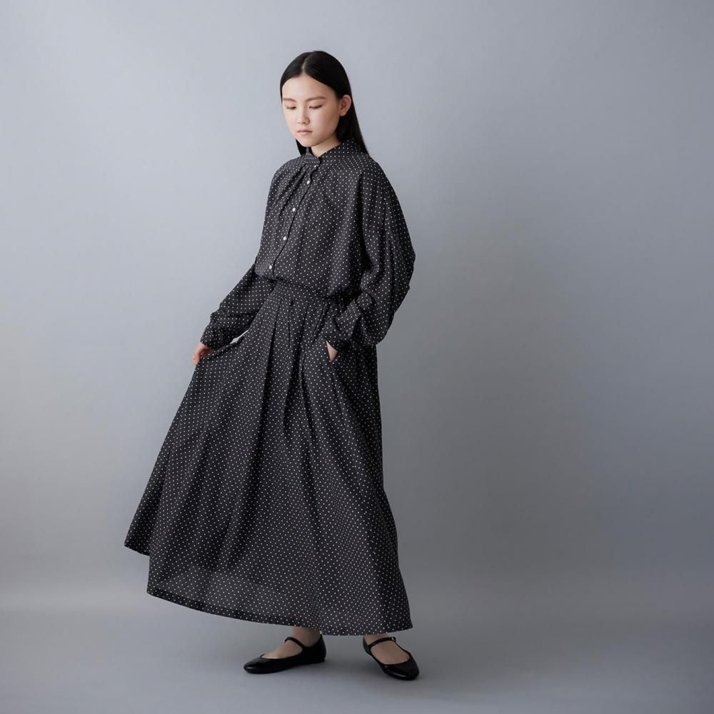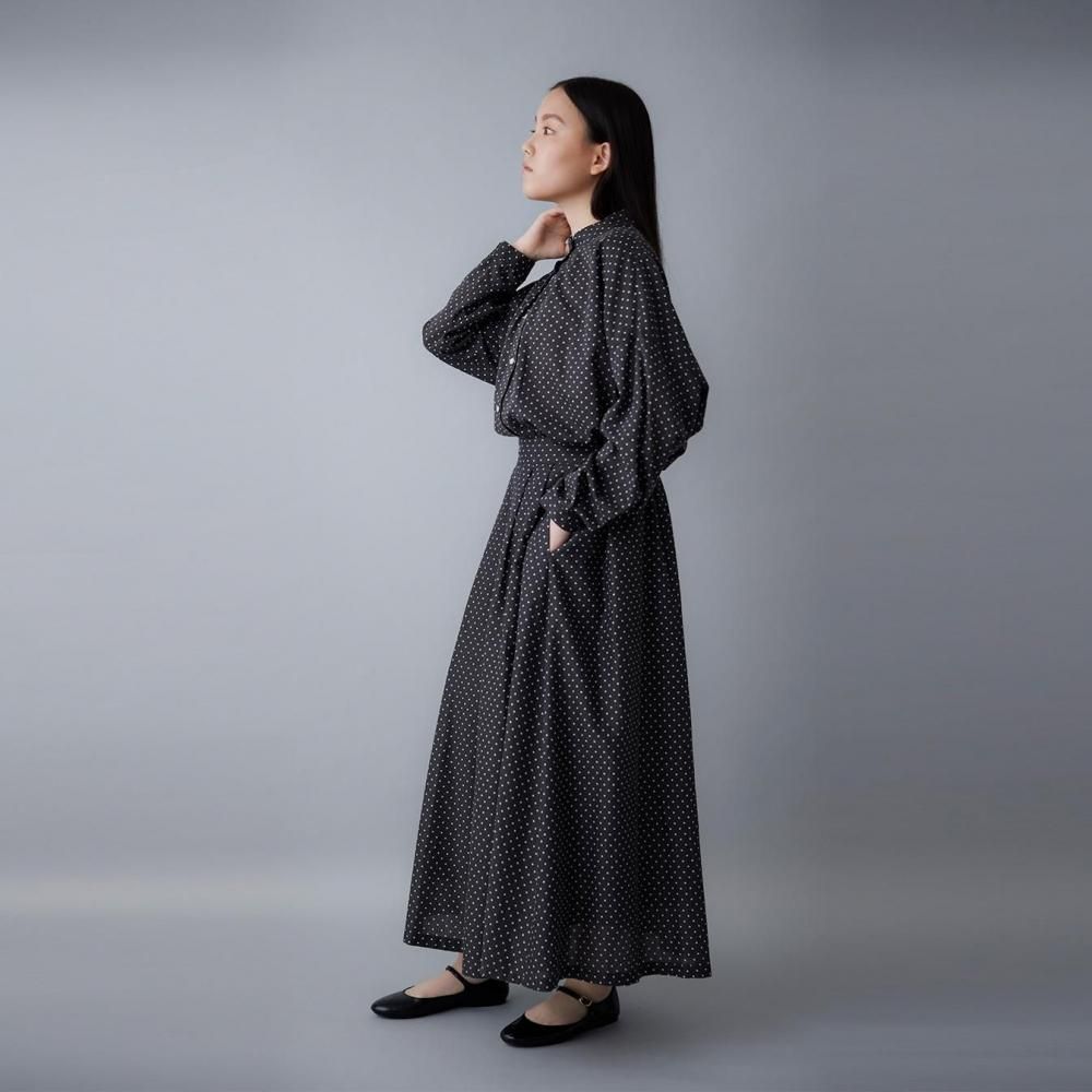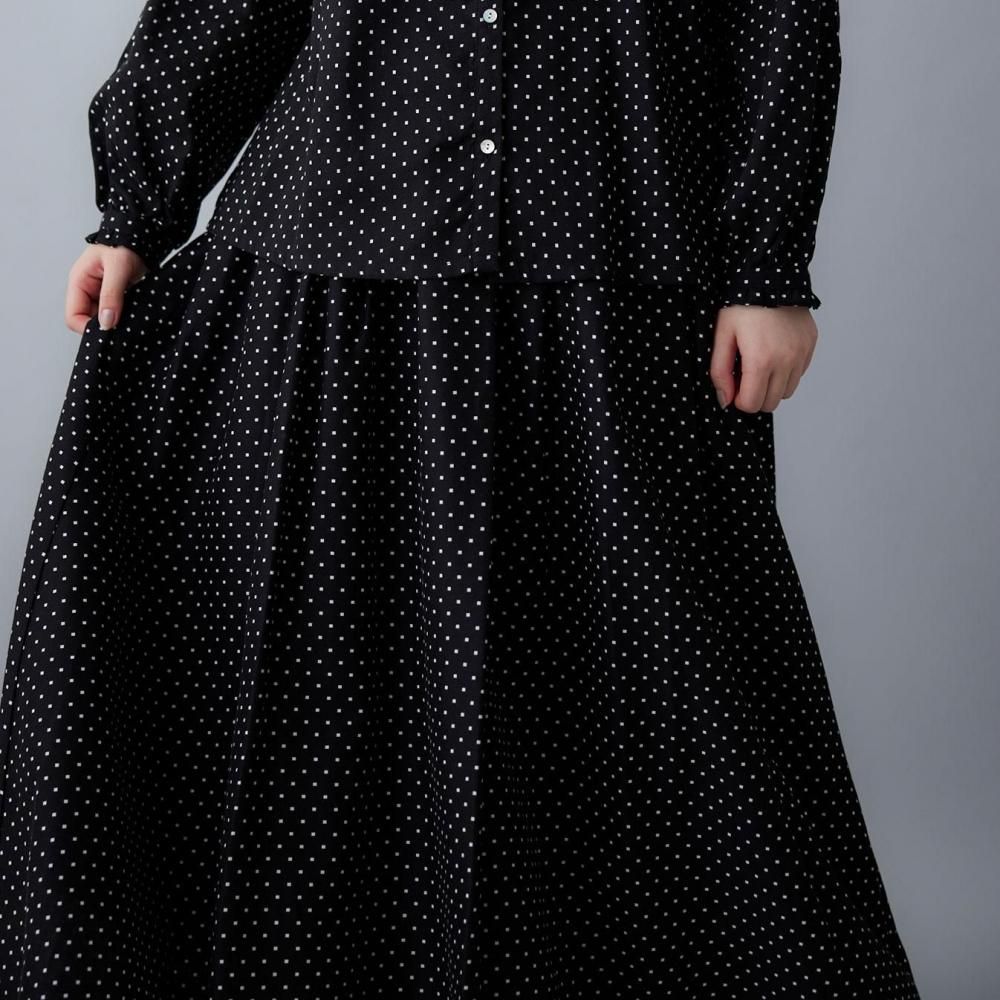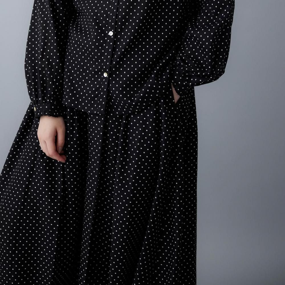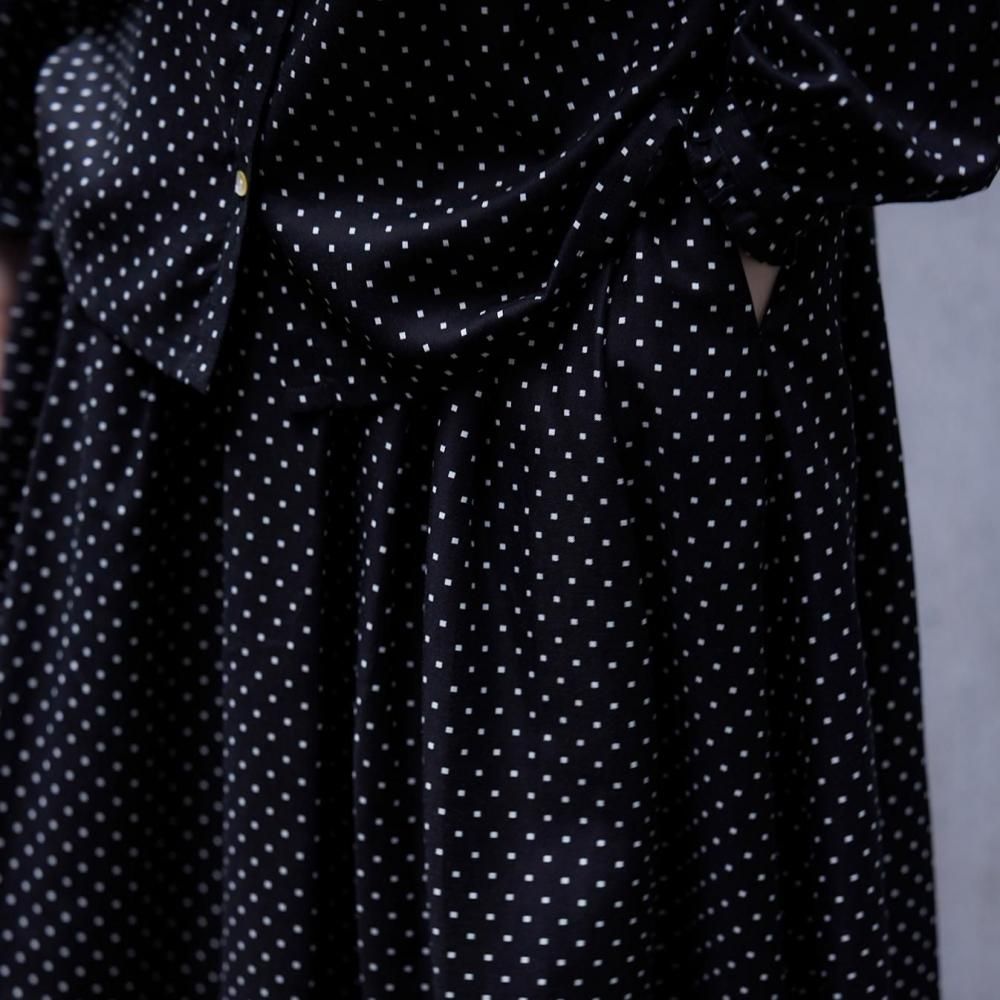 動くたびにやわらかく揺れるドレープが、クラシカルなドット柄に表情を添えます。