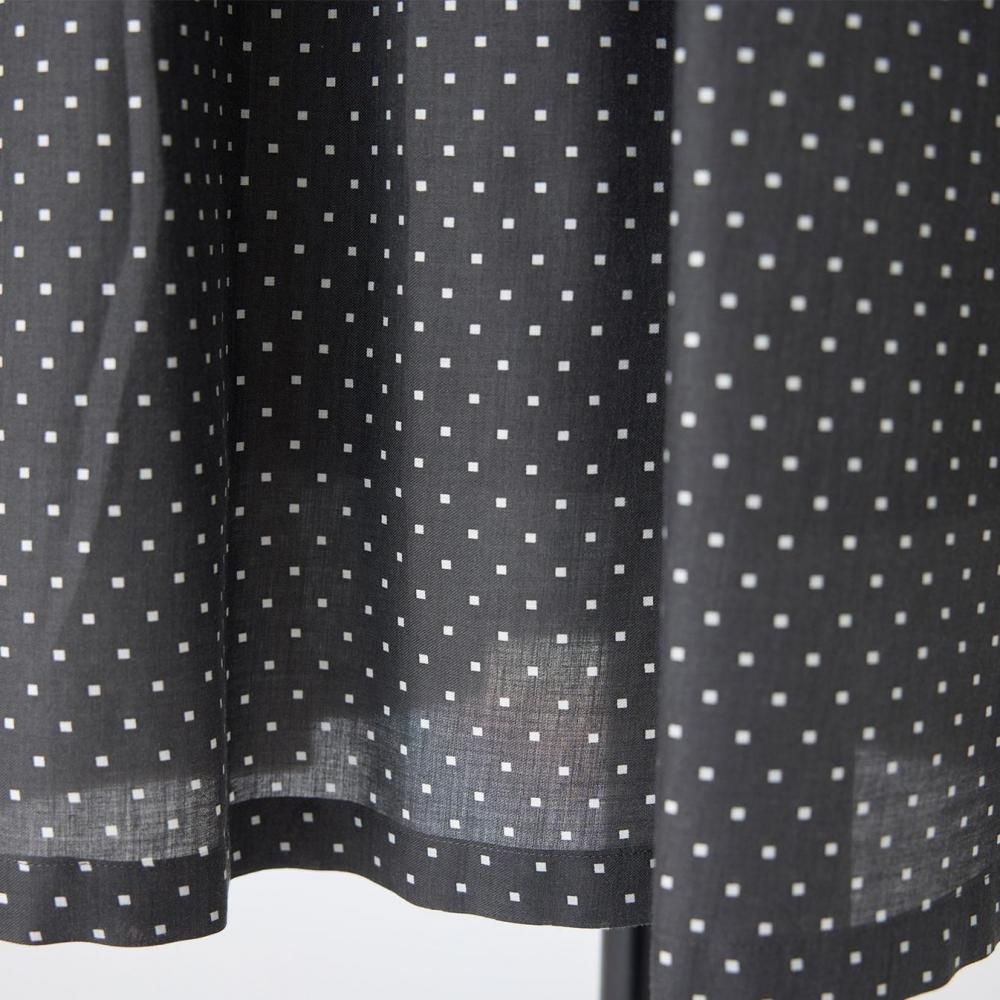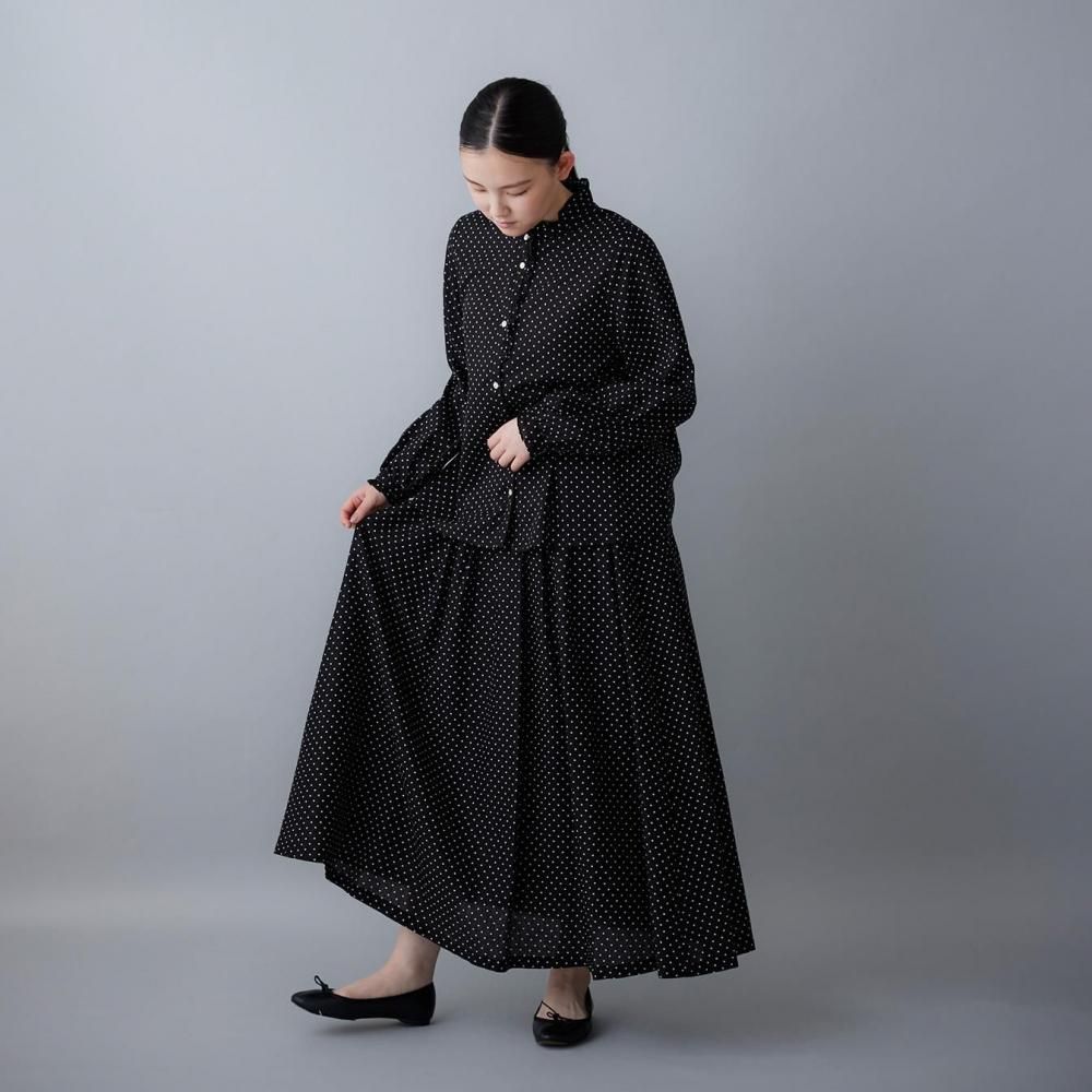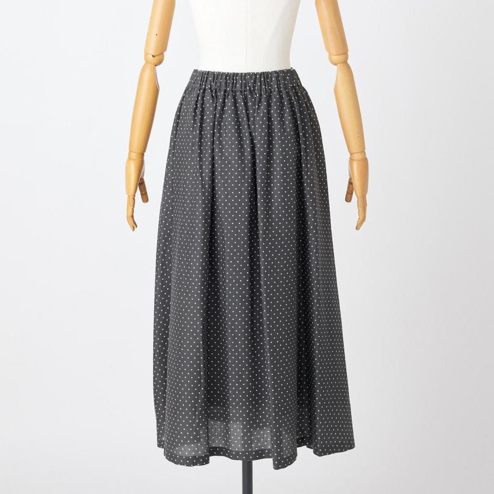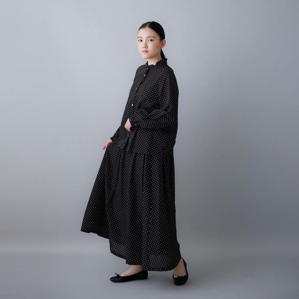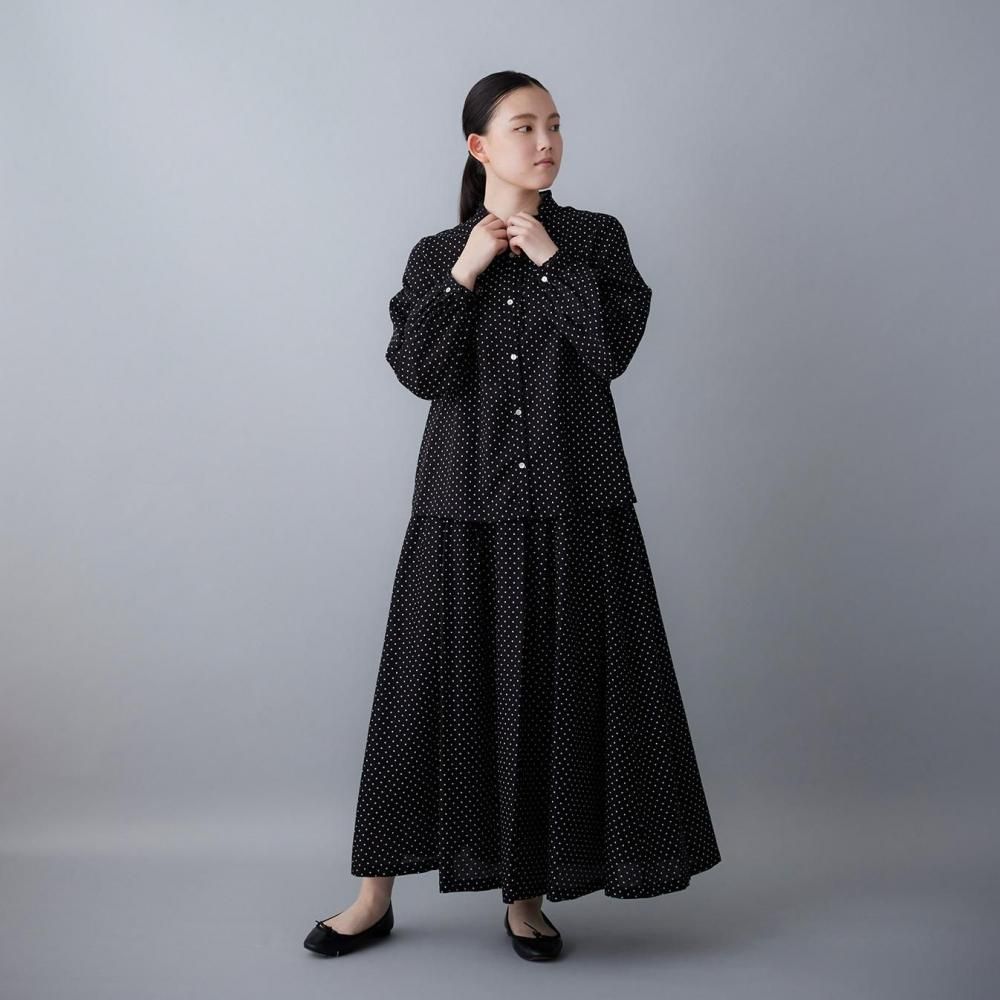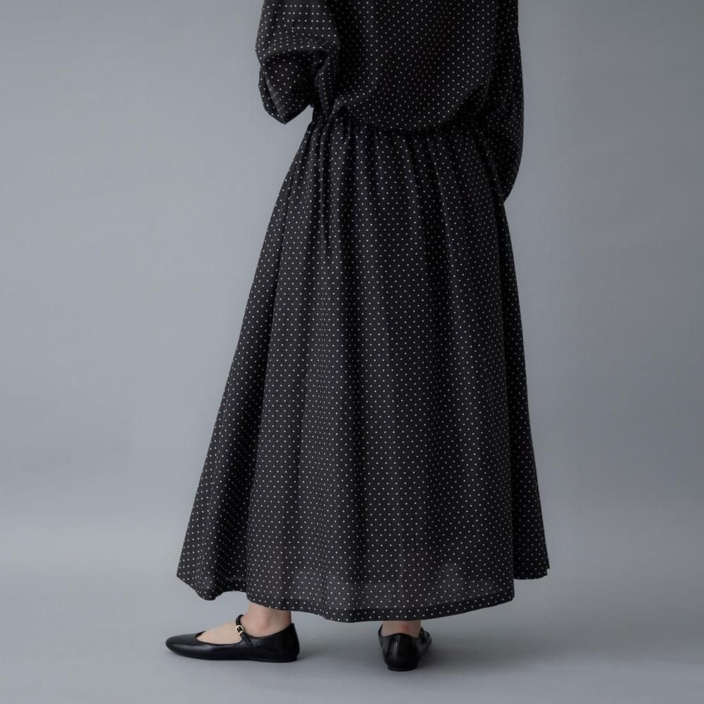 動くたびにやわらかく揺れるドレープが、クラシカルなドット柄に表情を添えます。