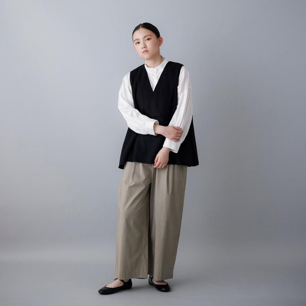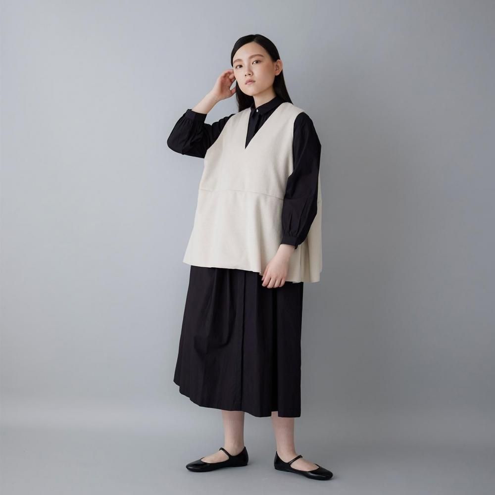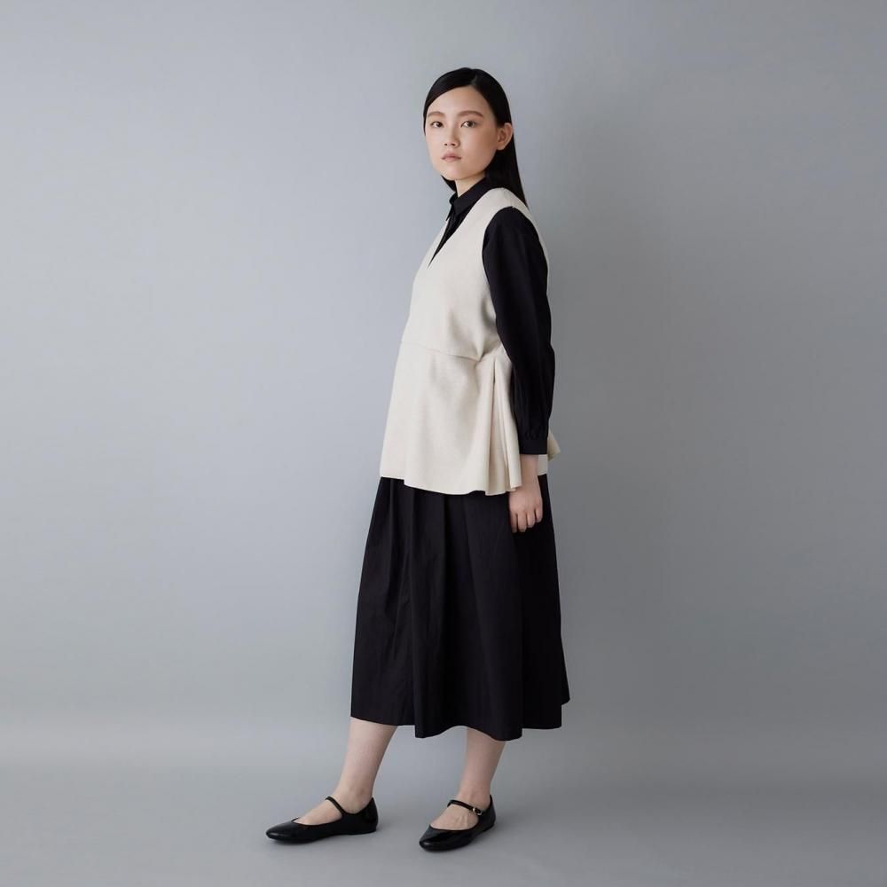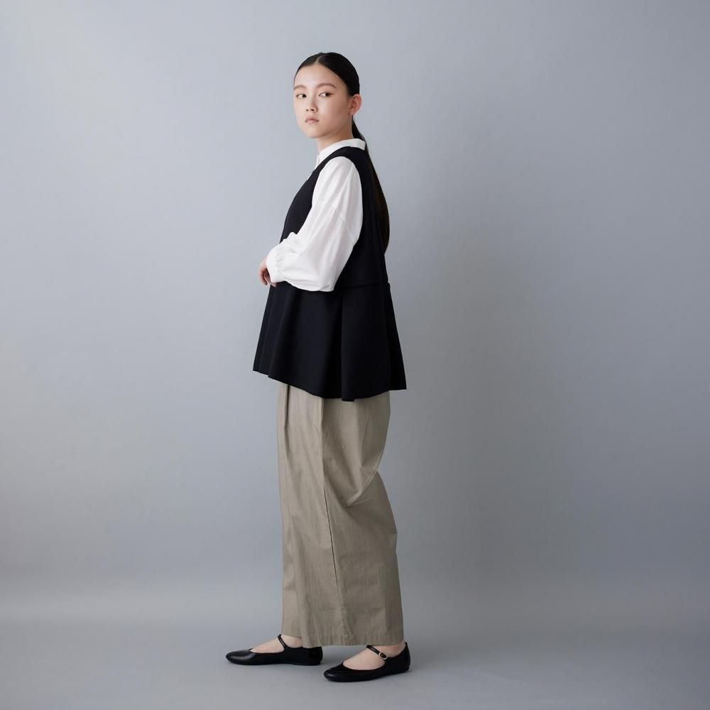 サイドに入れたタックがふんわりとした立体感を生み、動きのあるシルエットに穏やかな表情を添えます。