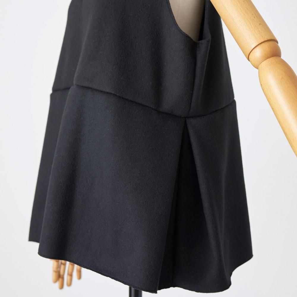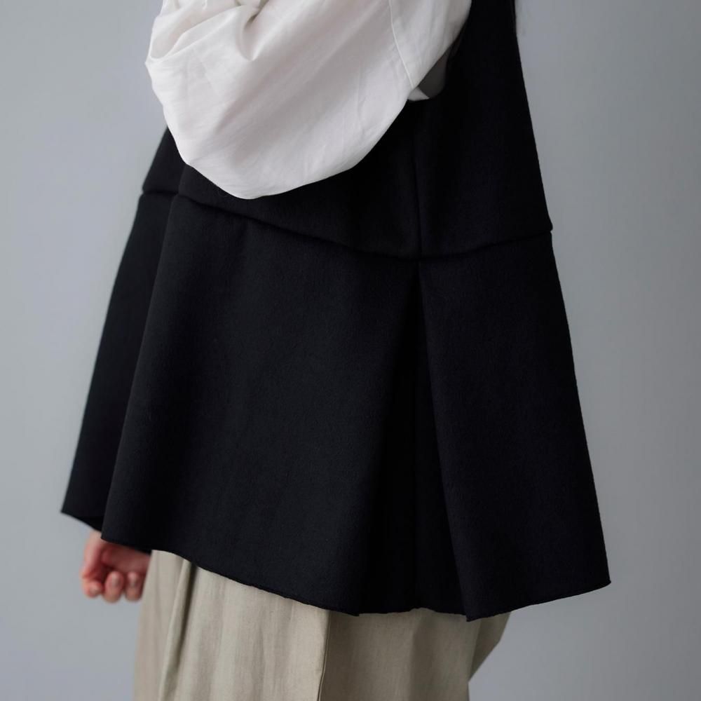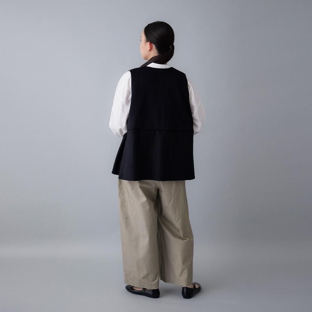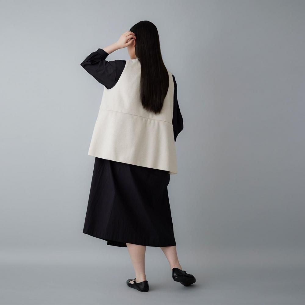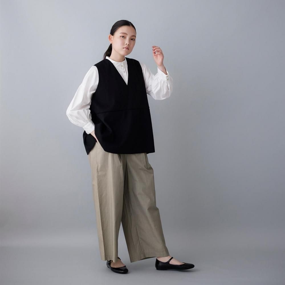 サイドに入れたタックがふんわりとした立体感を生み、動きのあるシルエットに穏やかな表情を添えます。