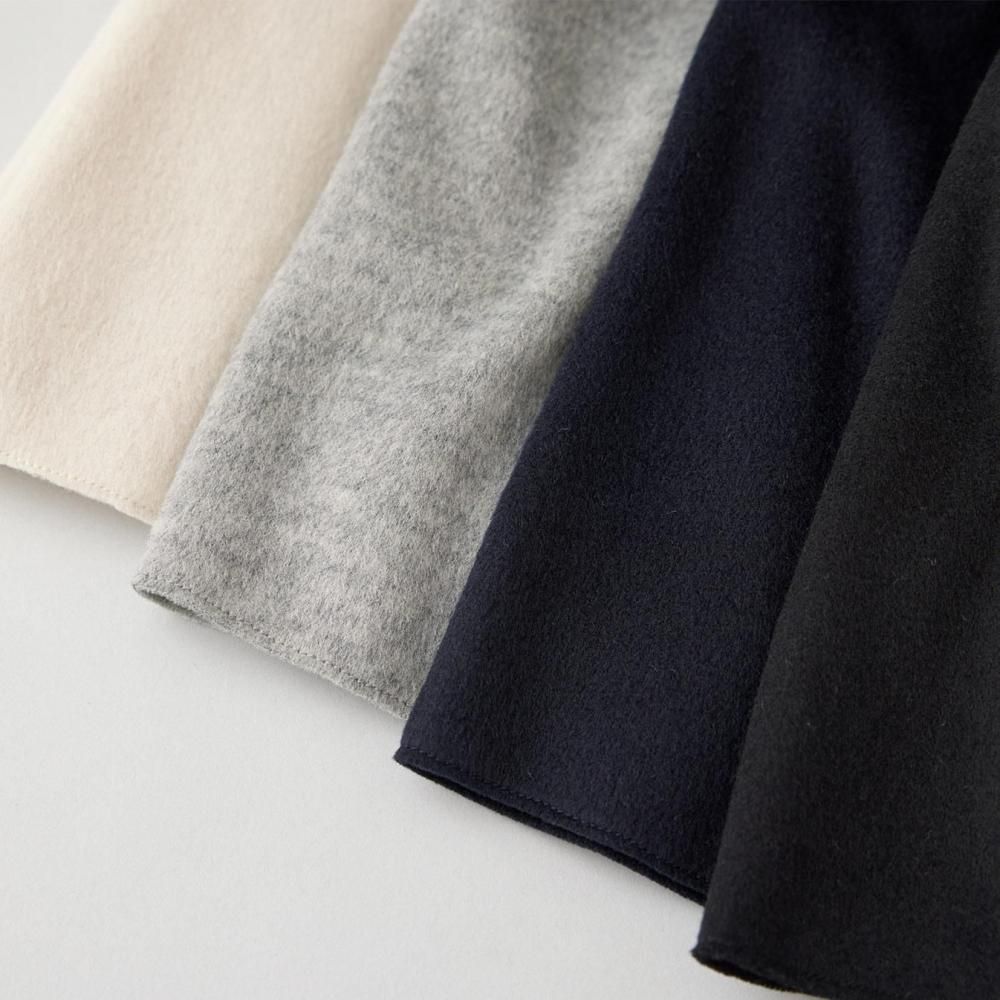 ポリエステルとレーヨンを掛け合わせた素材で、ウールのようなあたたかみのある表面感と、ふっくらとなめらかな手ざわりが魅力です。
