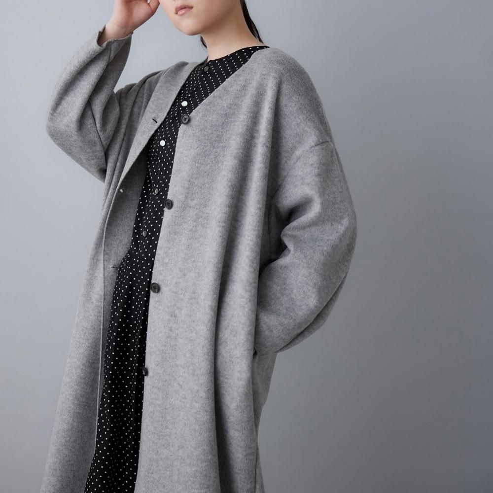 ふっくらとやわらかな生地の風合いが際立つ、Vネックデザインのコートです。