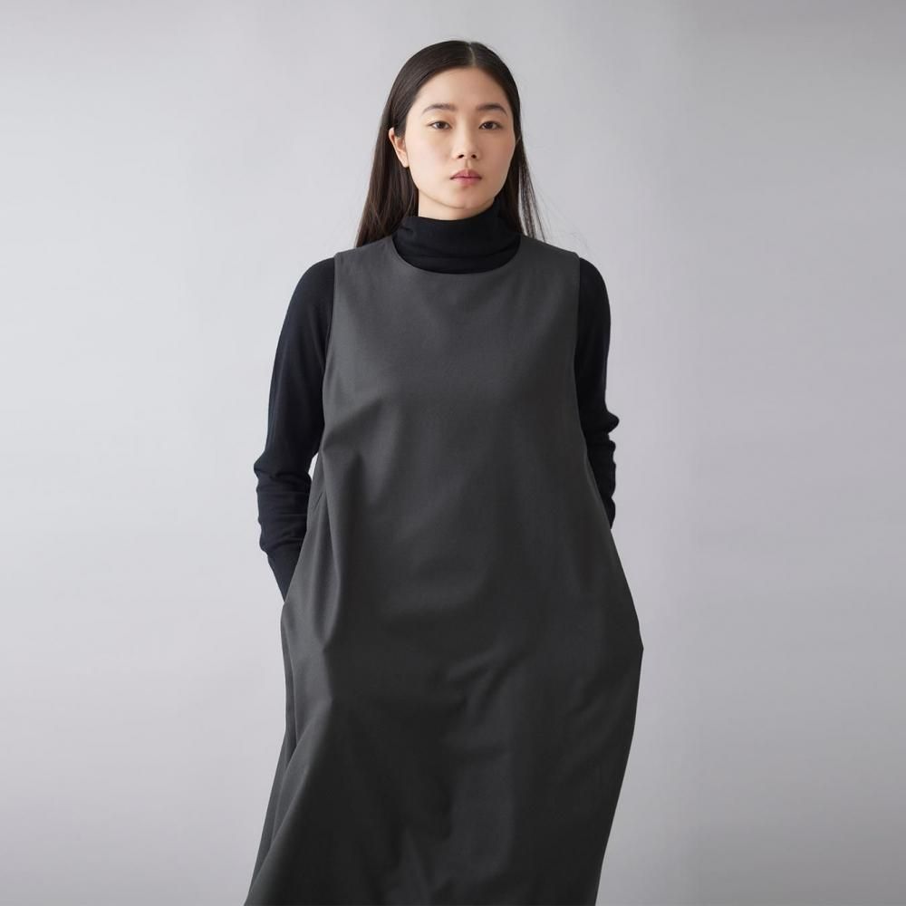 流れるようなAラインシルエットが特徴で、体のラインを拾わず、自然な落ち感で上品に見せてくれます。