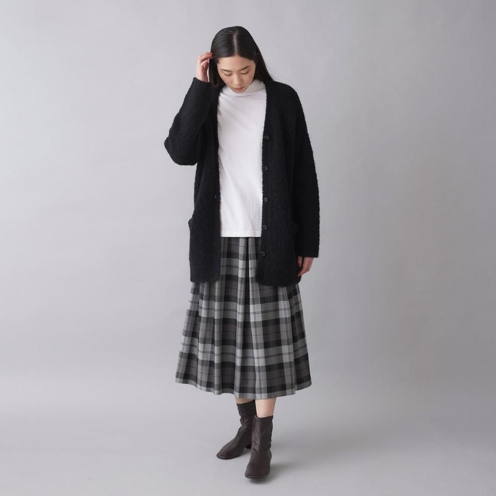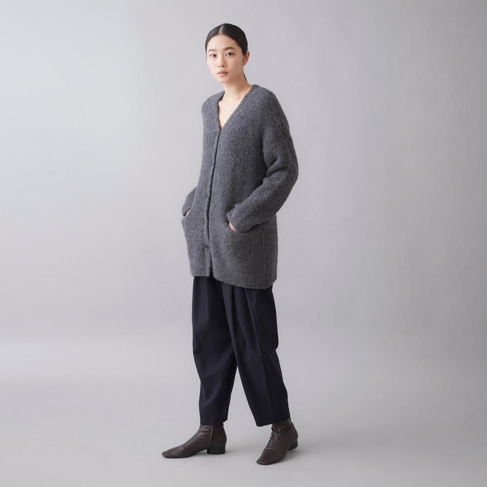 すっきりとしたVネックとシンプルなシルエットで、ボリュームのある素材でも重たく見えず上品な印象に。