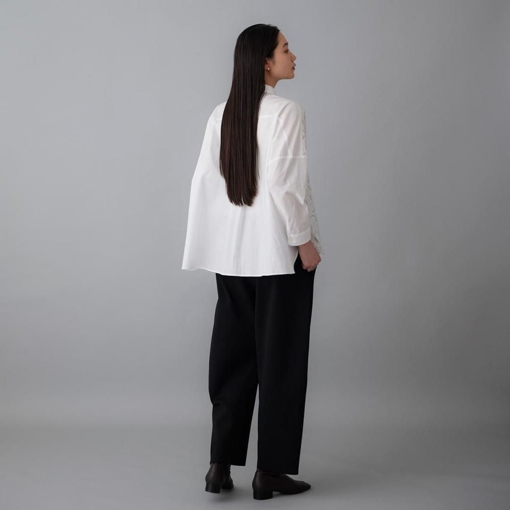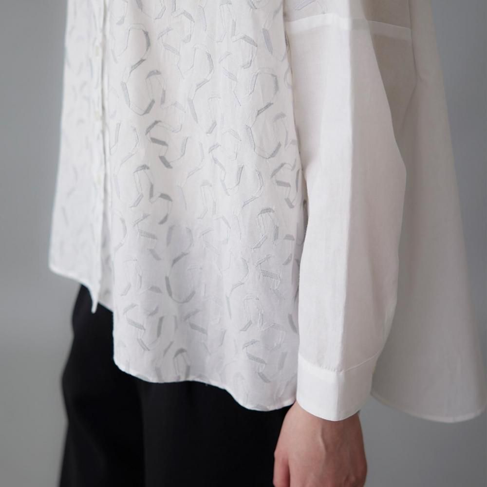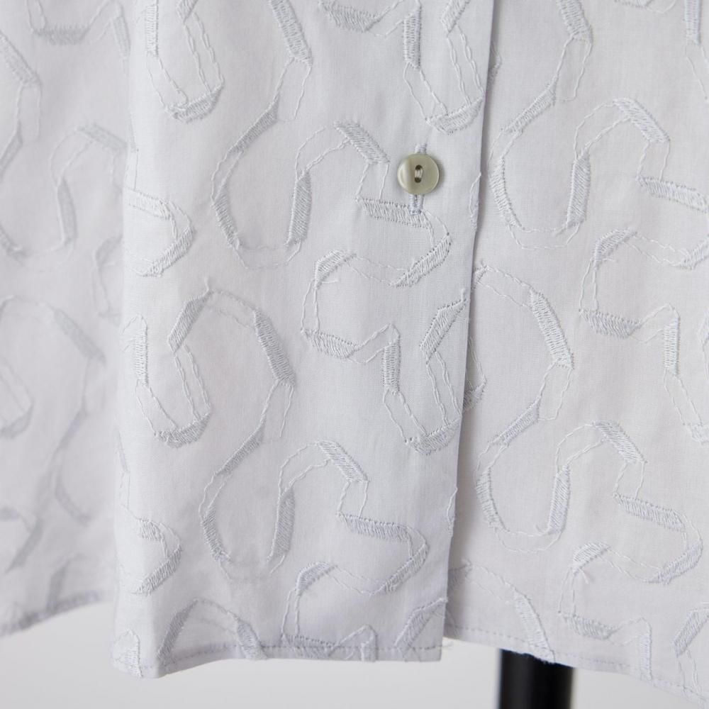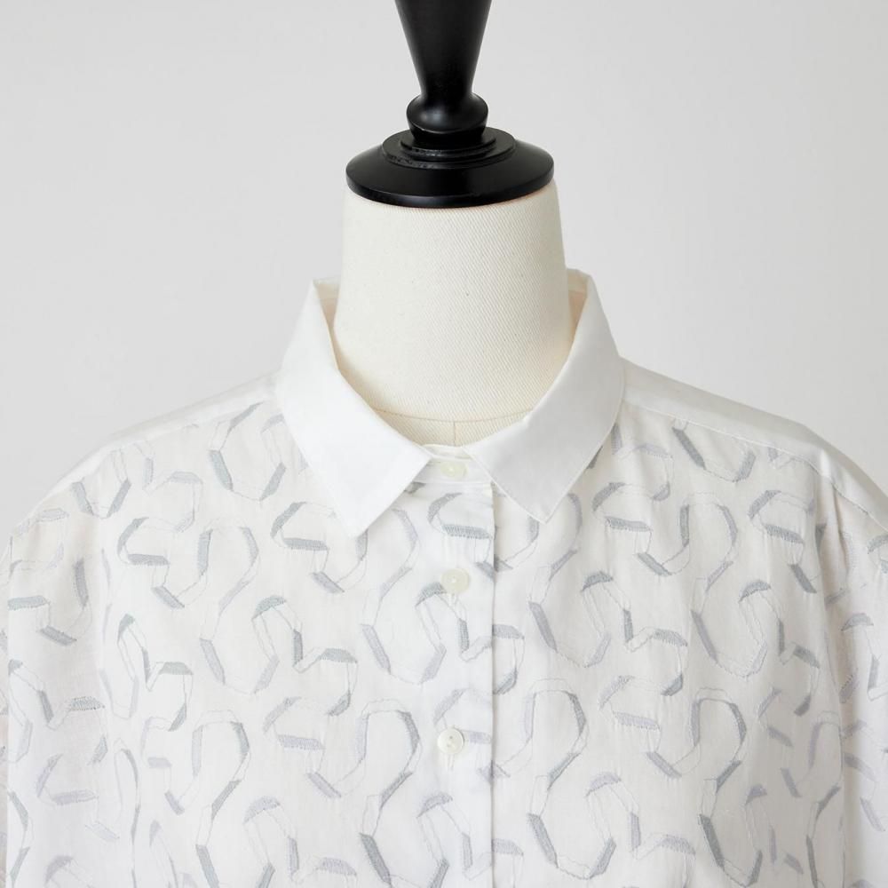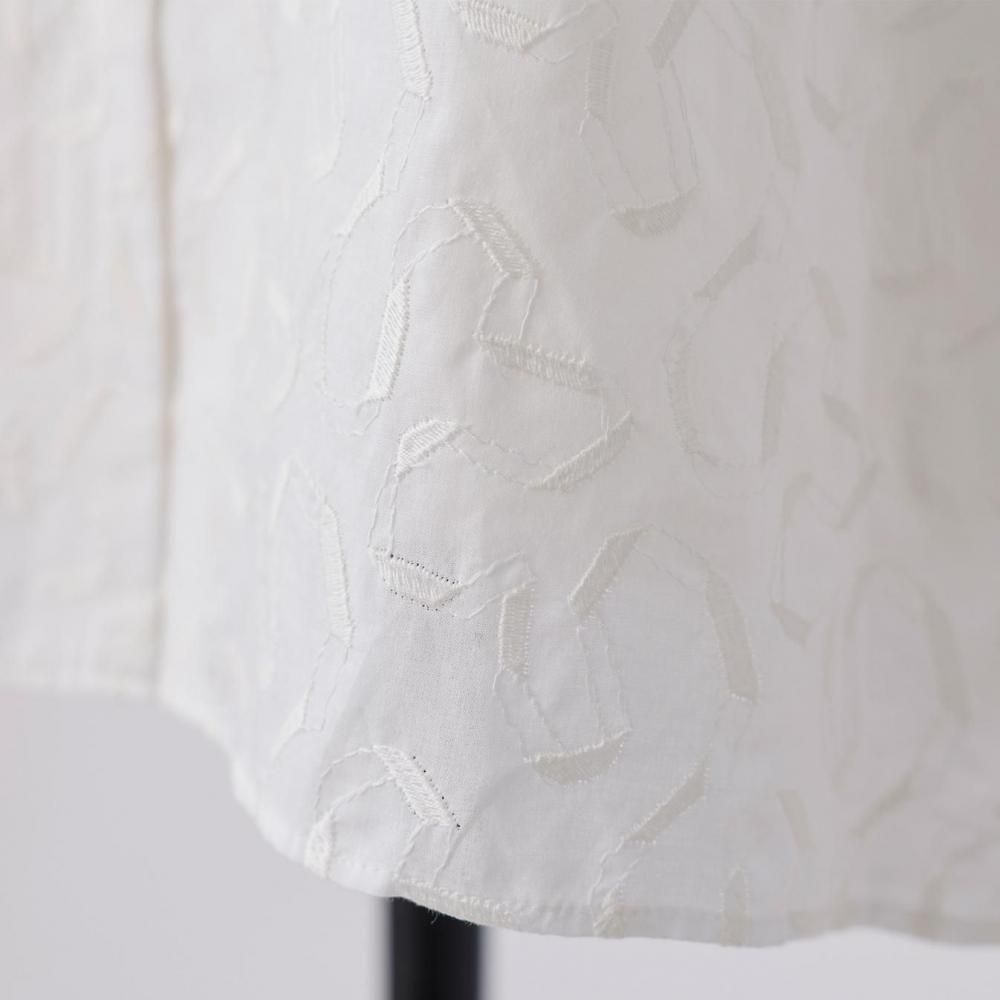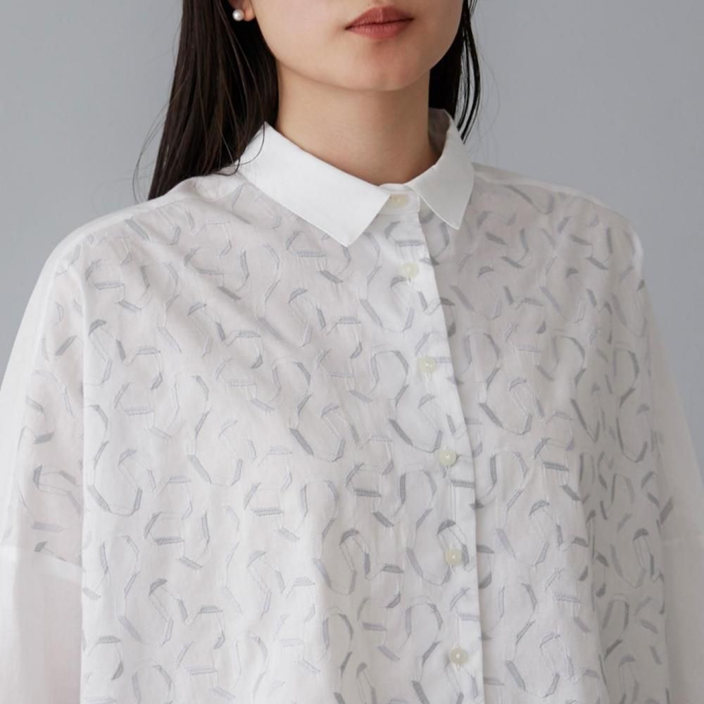 肩を落としたリラックス感のあるラインと、ほどよいボリュームの身頃が、メンズライクな印象を演出しながらも、繊細な刺繍が女性らしさを引き立てます。