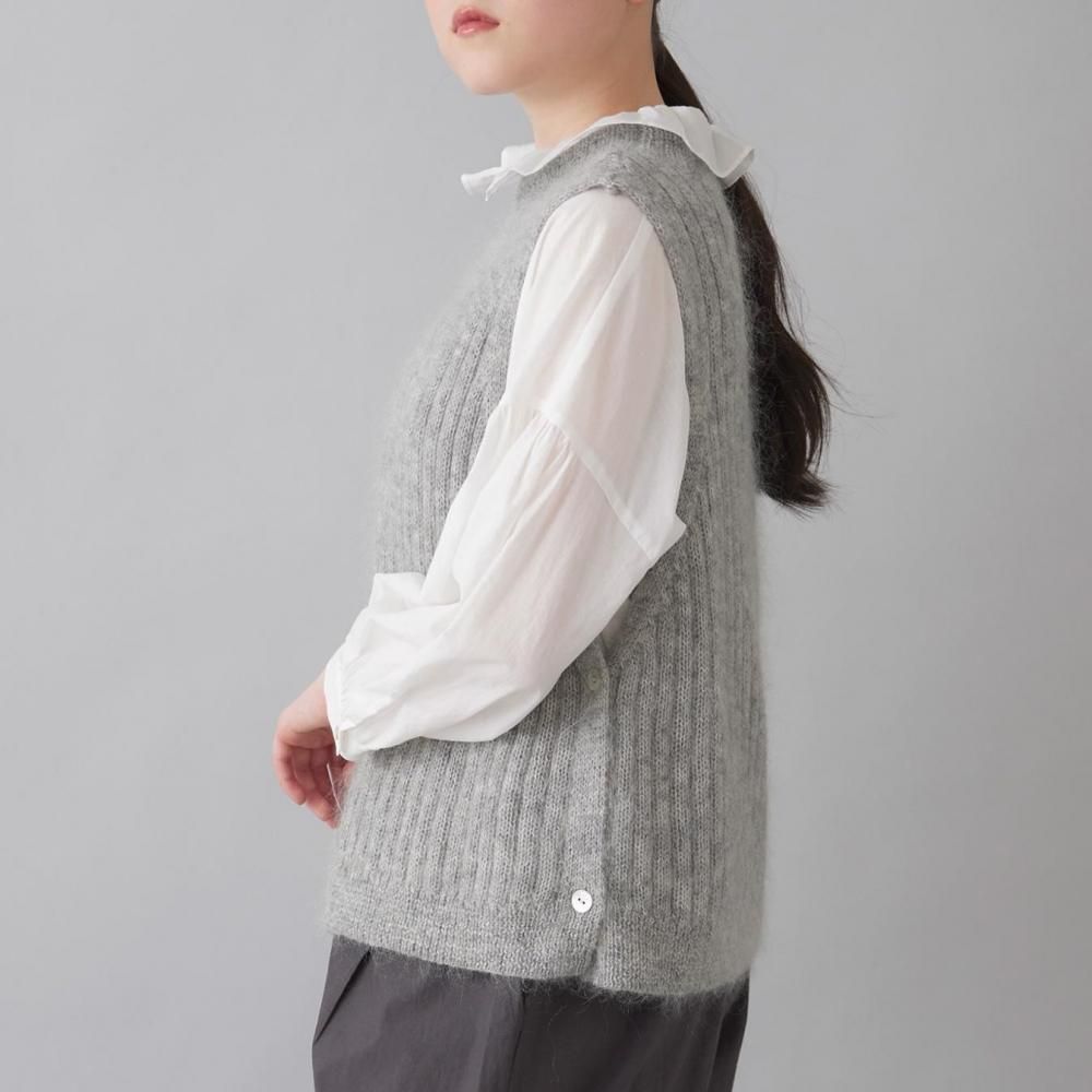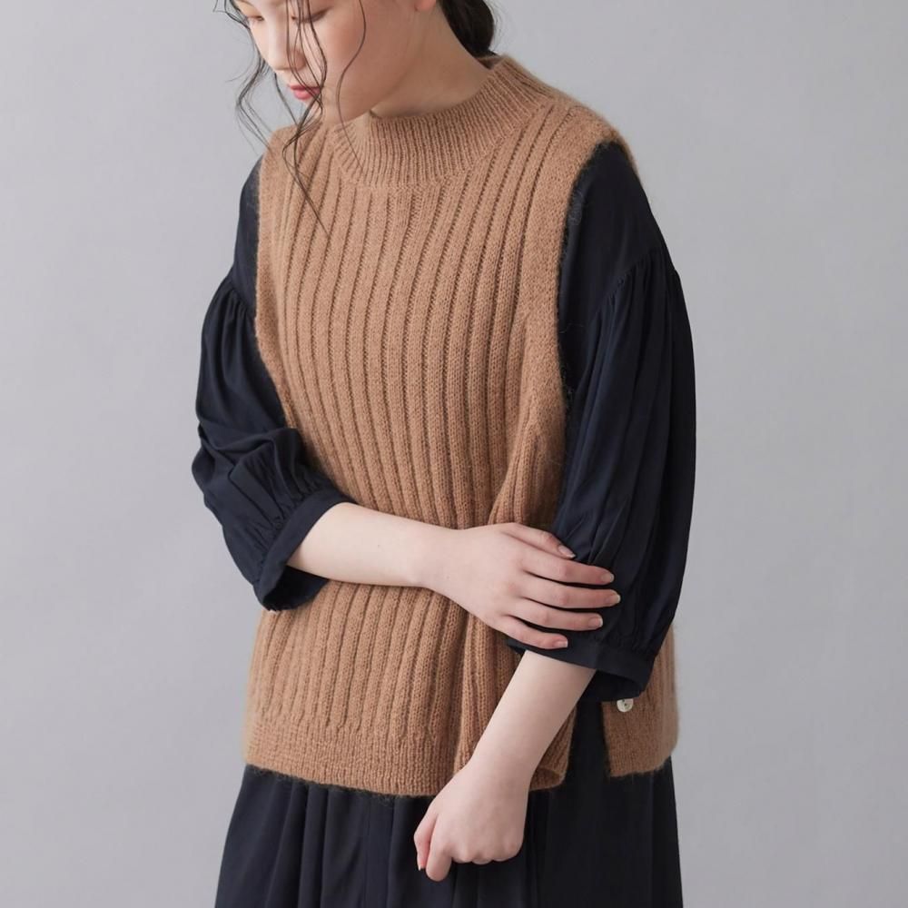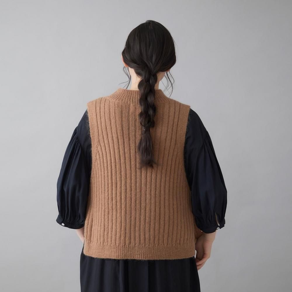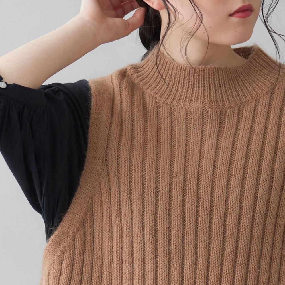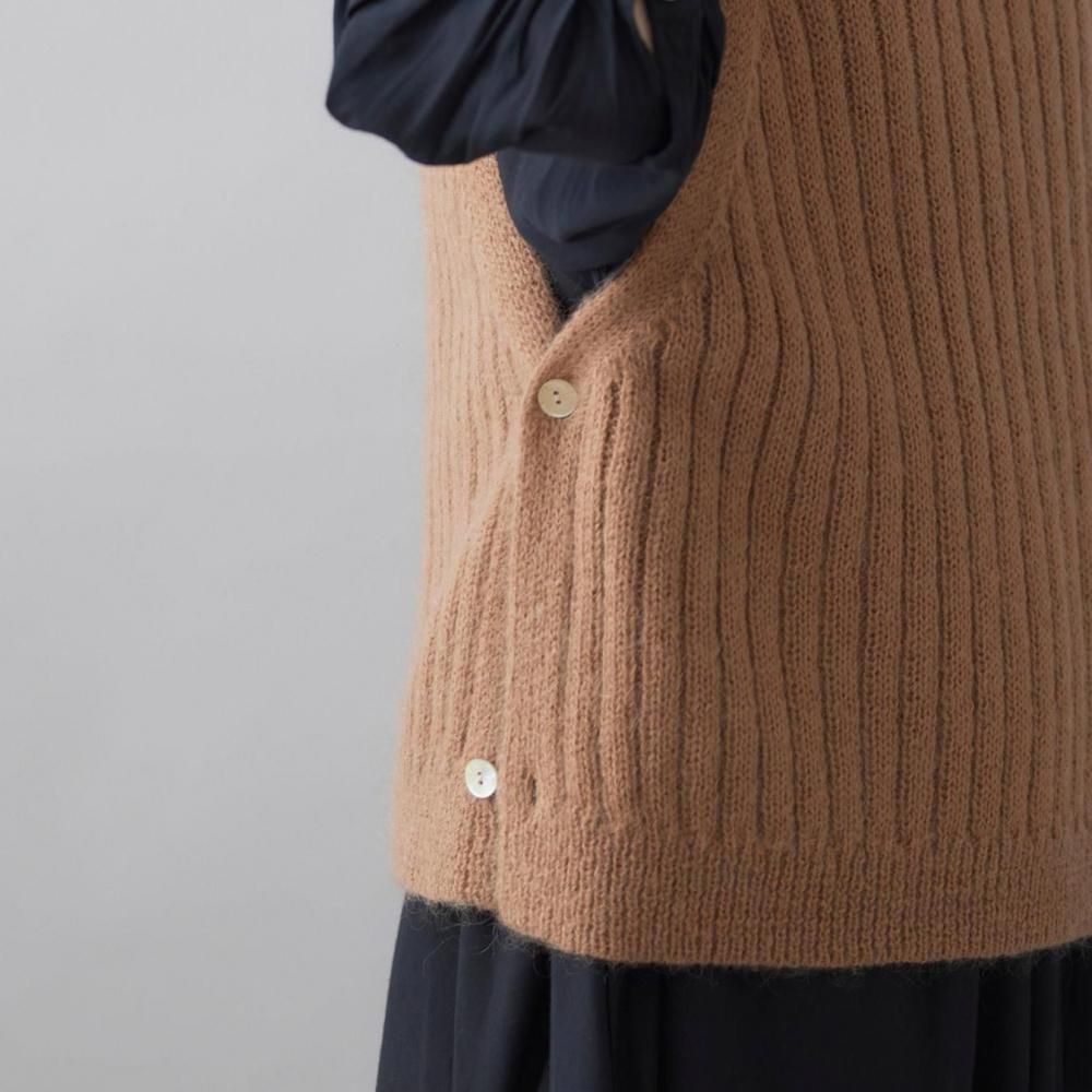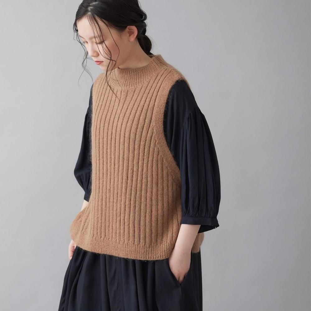 カシミヤのようになめらかで、毛足の長い糸が自然なツヤとやわらかさを生み出す、あたたかみのあるニットベストです。