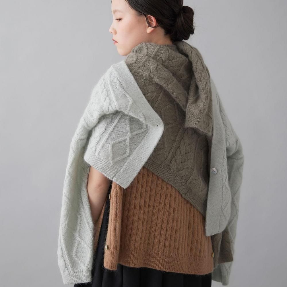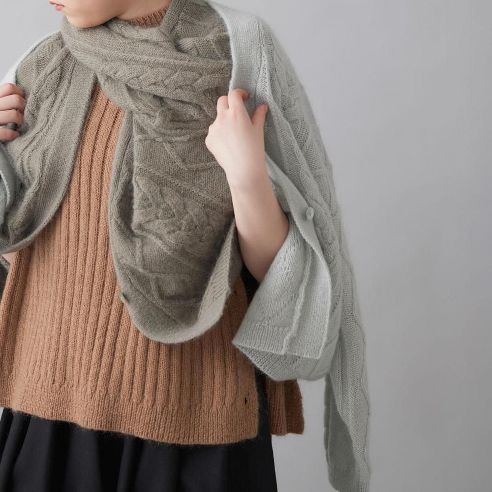 ウールのあたたかさ、モヘヤの光沢感とふんわりとした柔らかさ、ナイロンの軽さと強度がバランスよく溶け合い、軽やかで美しい表情を生み出します。