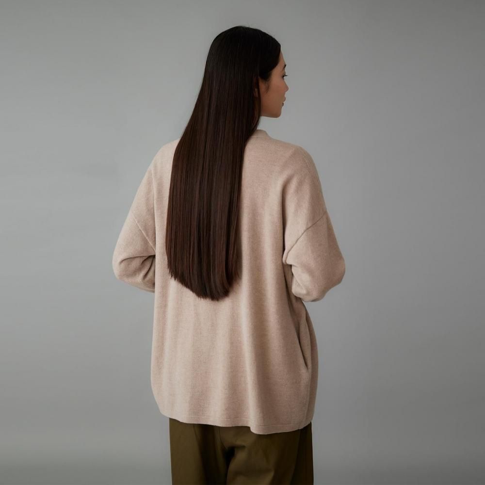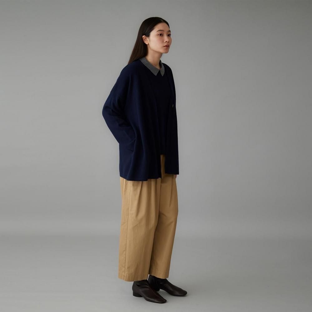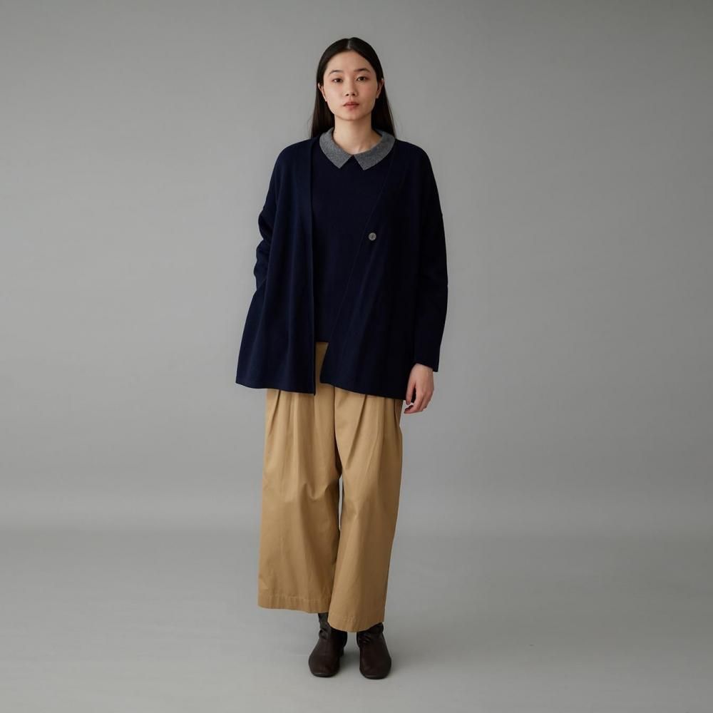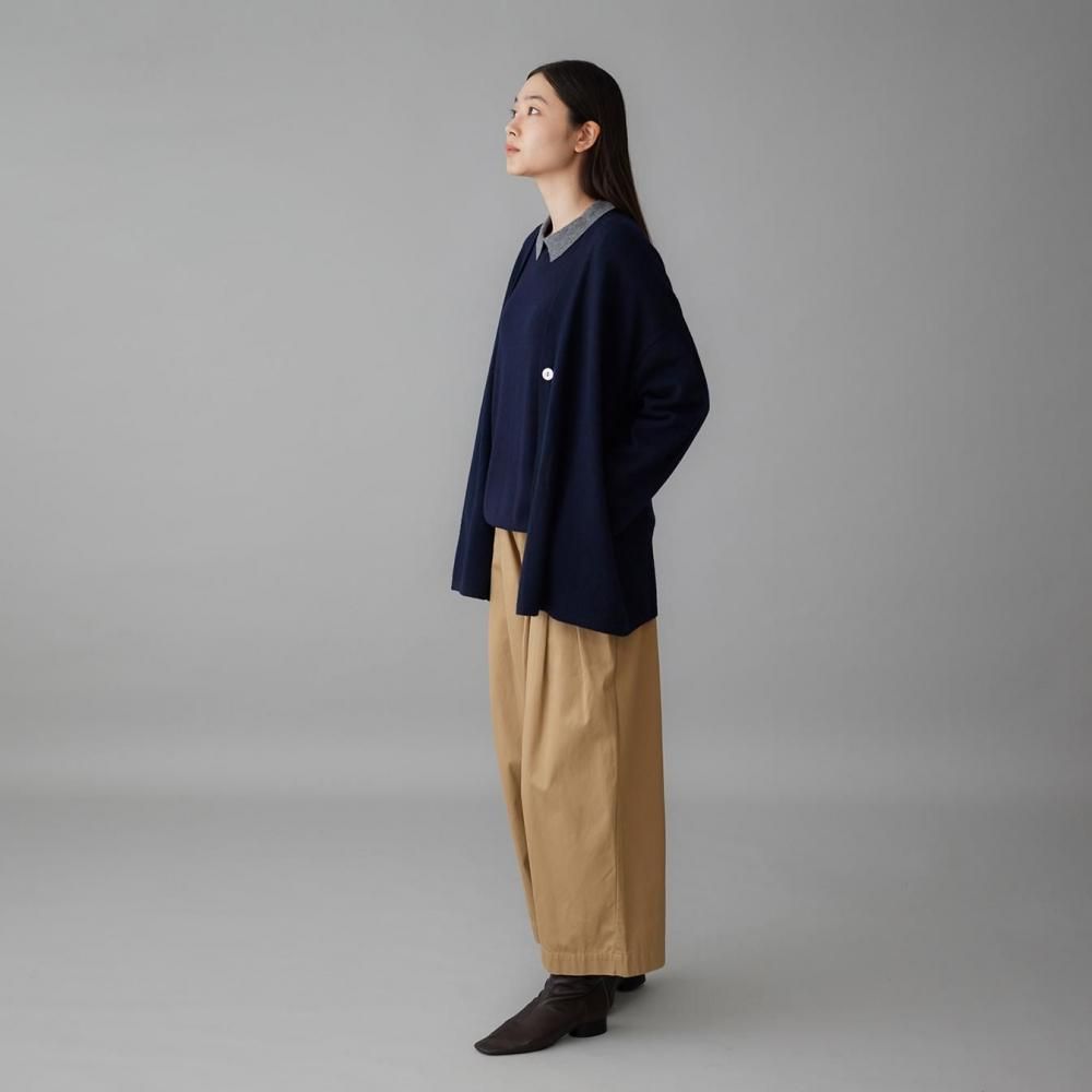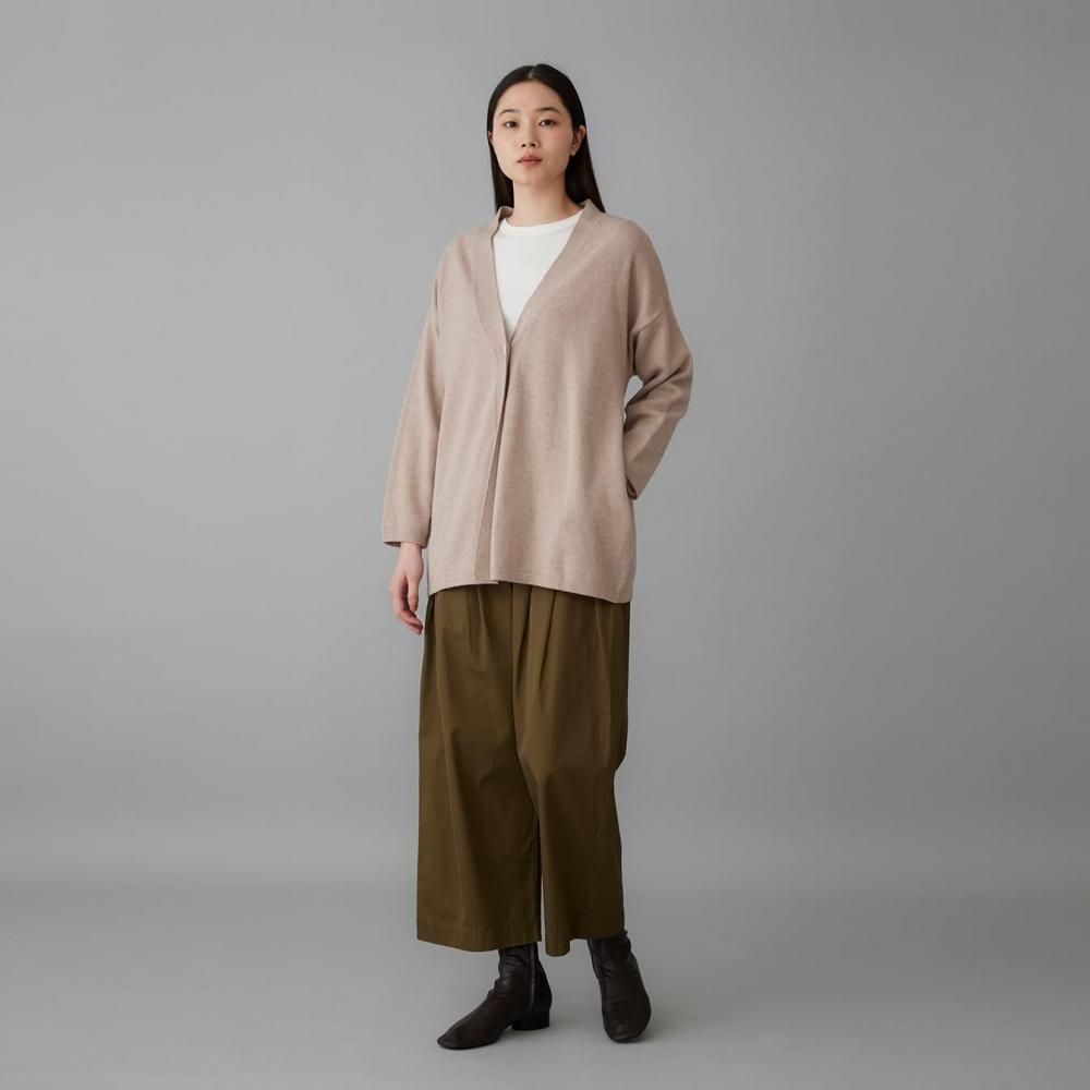 深めのVネックラインと一つボタンのシンプルなデザインで、シーンを選ばず、家の中ではもちろん、旅先や外出先でも活躍します。