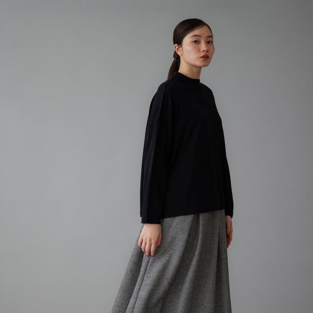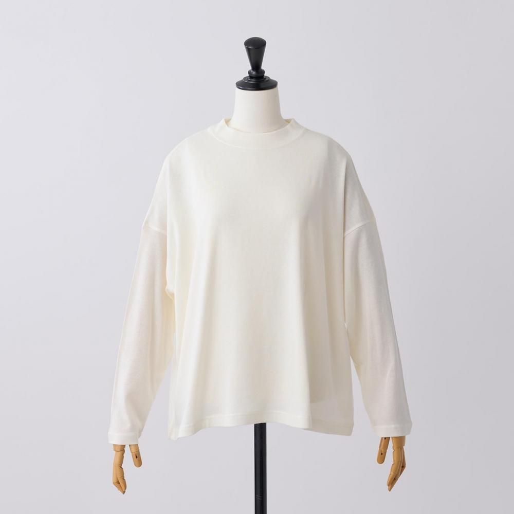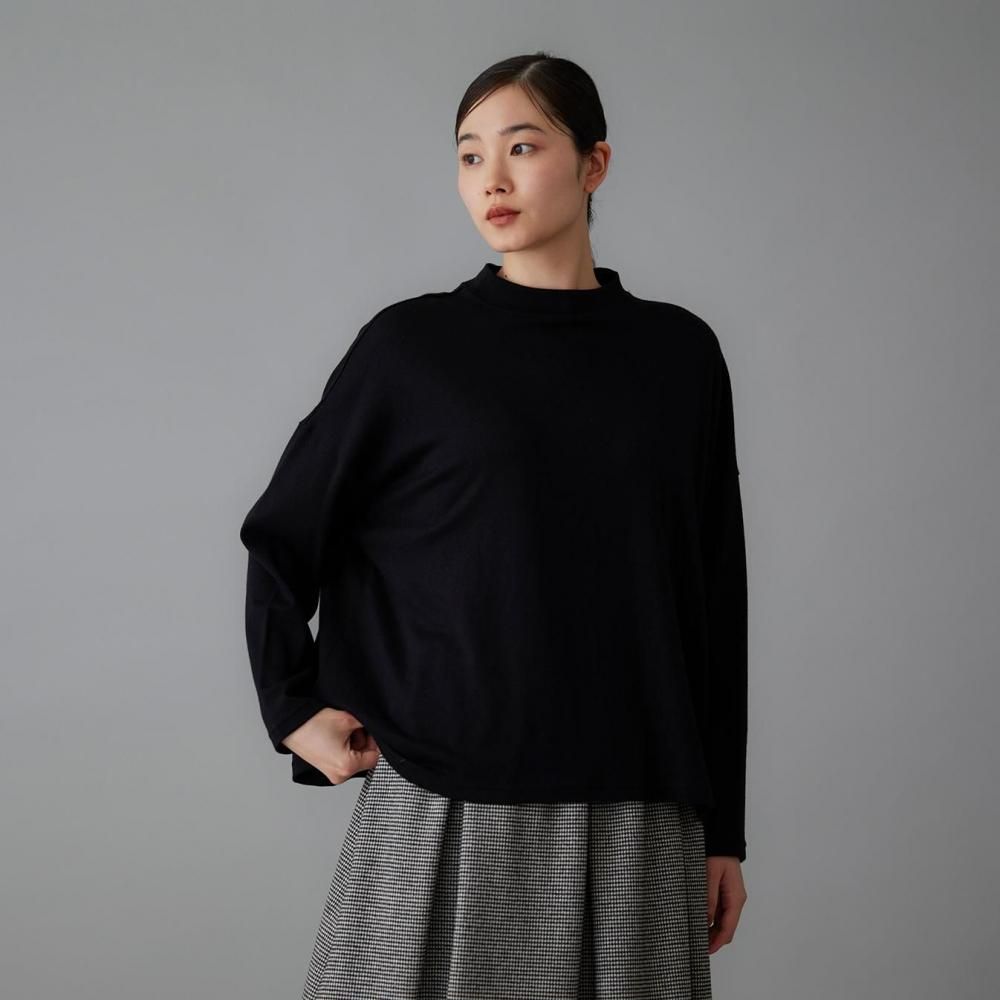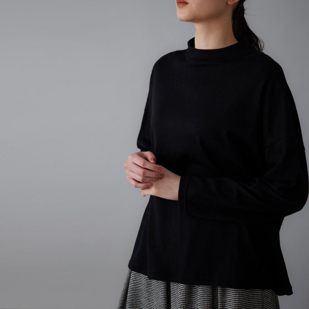 やや立ち上がりのあるモックネックが首元に上品なニュアンスを添え、