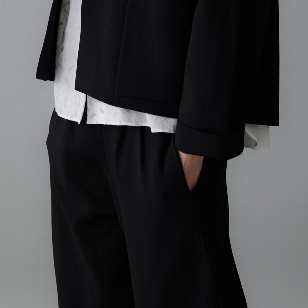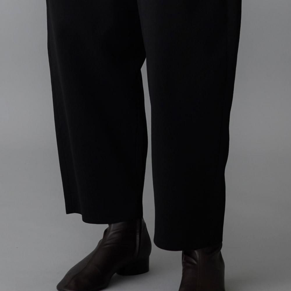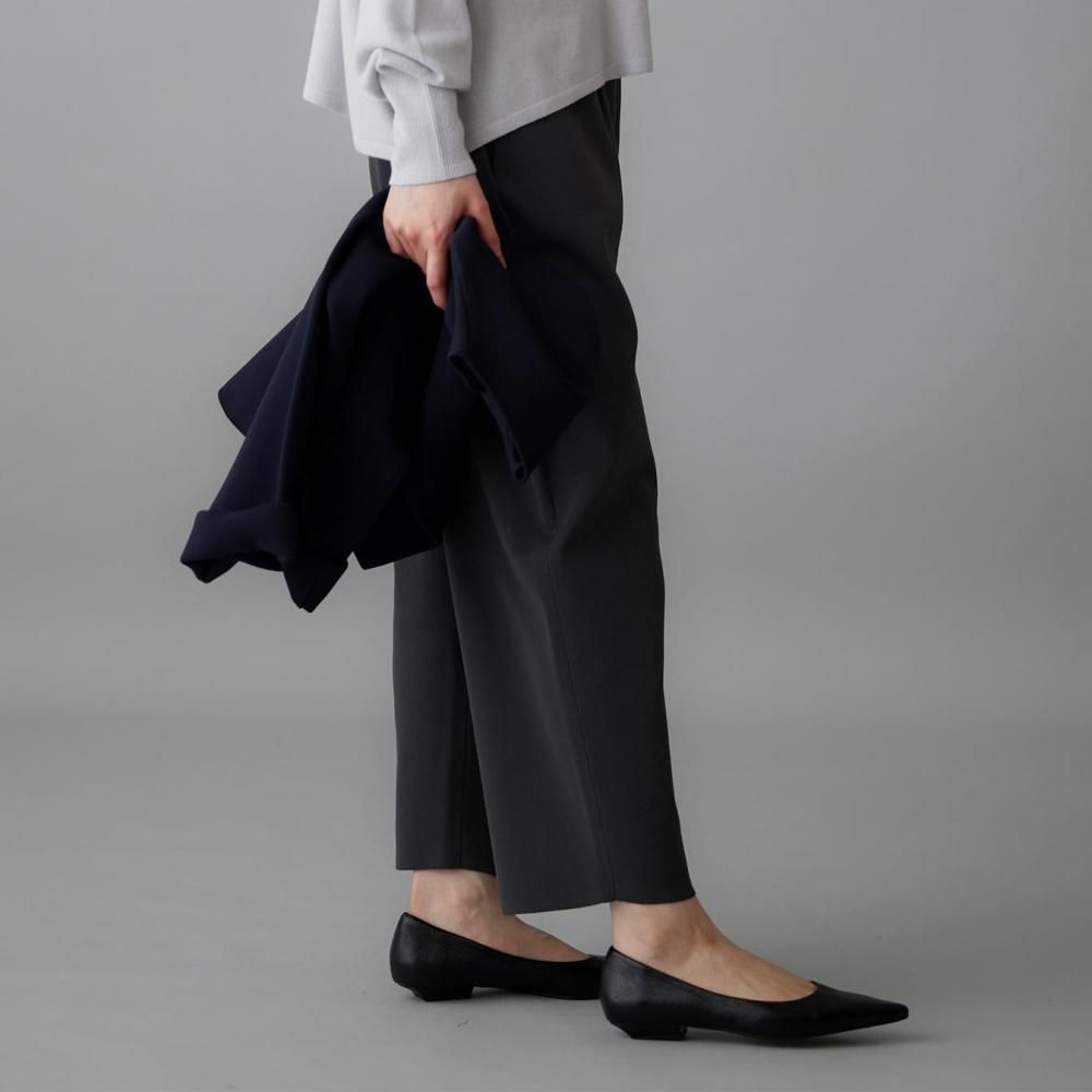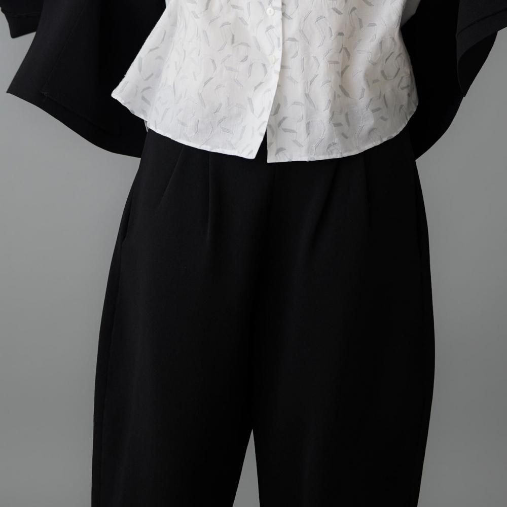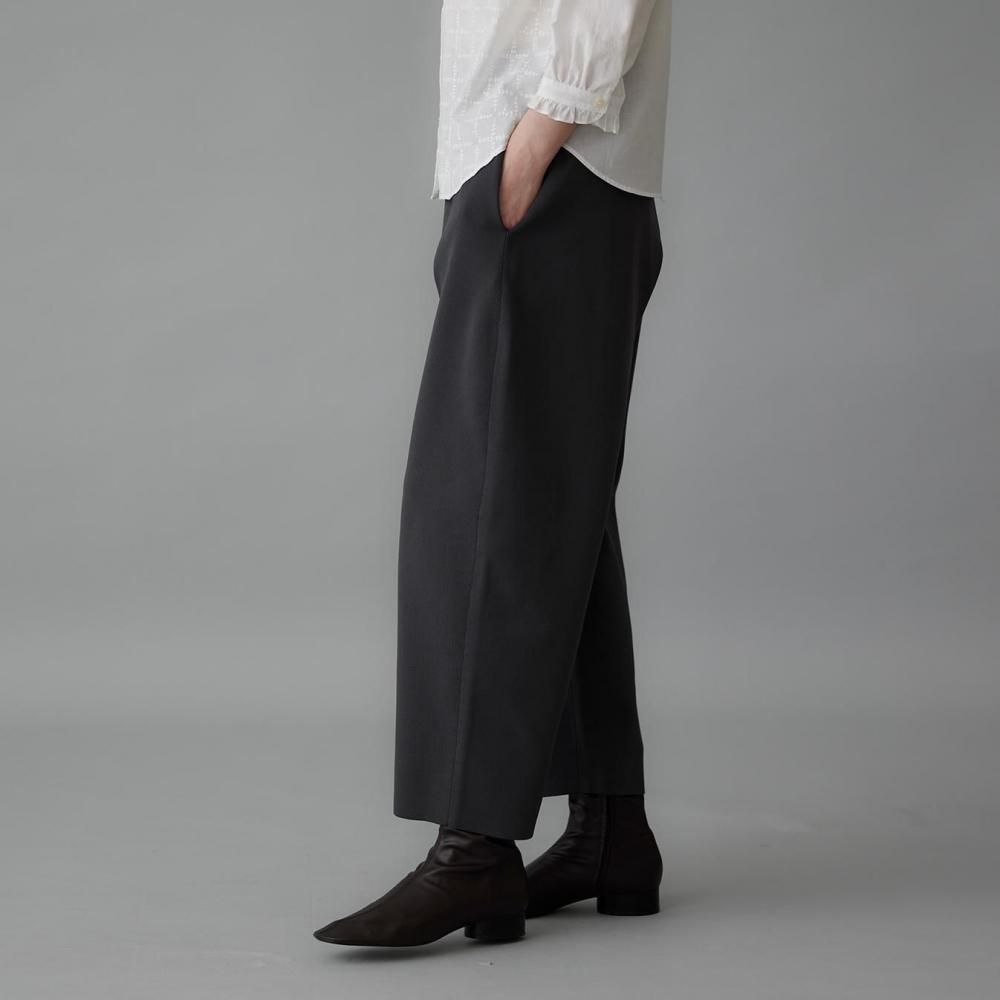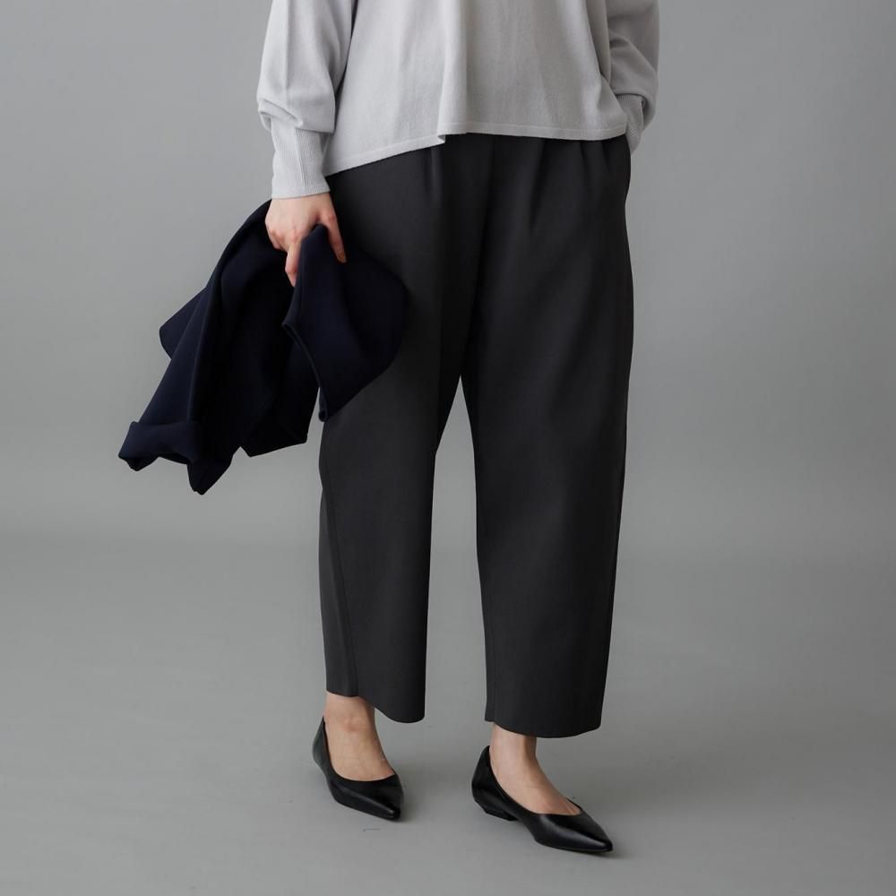 ウエストの両サイドに入れたタックが立体感を生み、裾に向かってゆるやかに細くなるラインが、すっきりとしたシルエットをつくります。