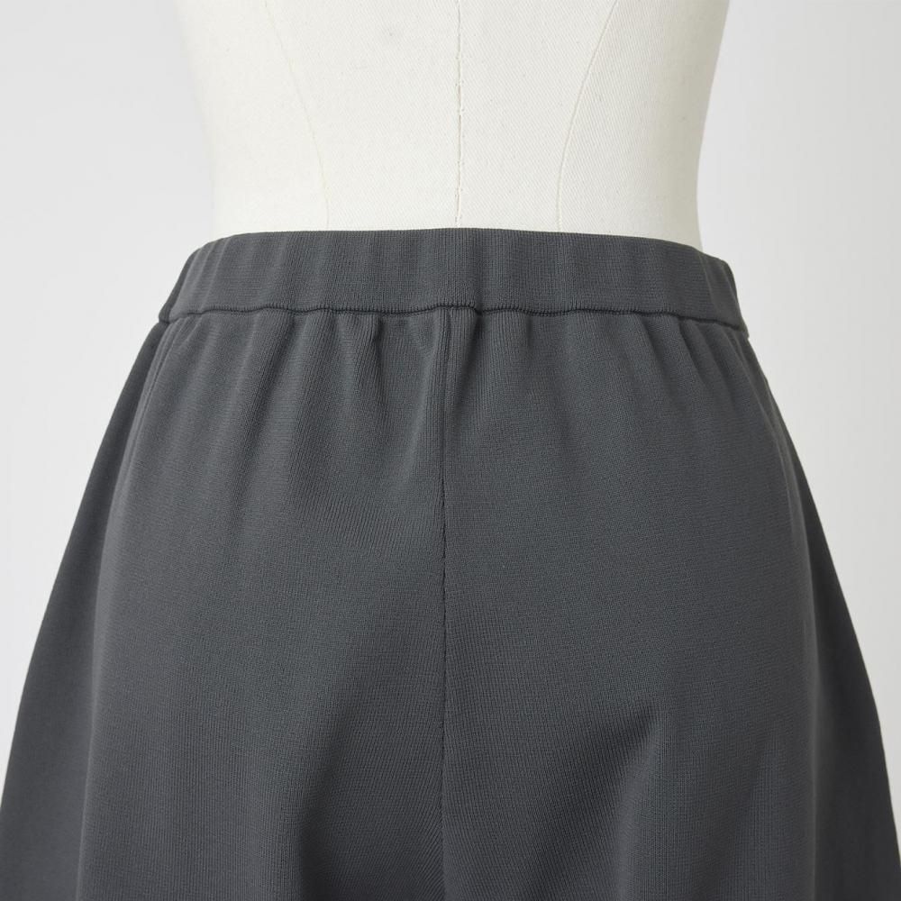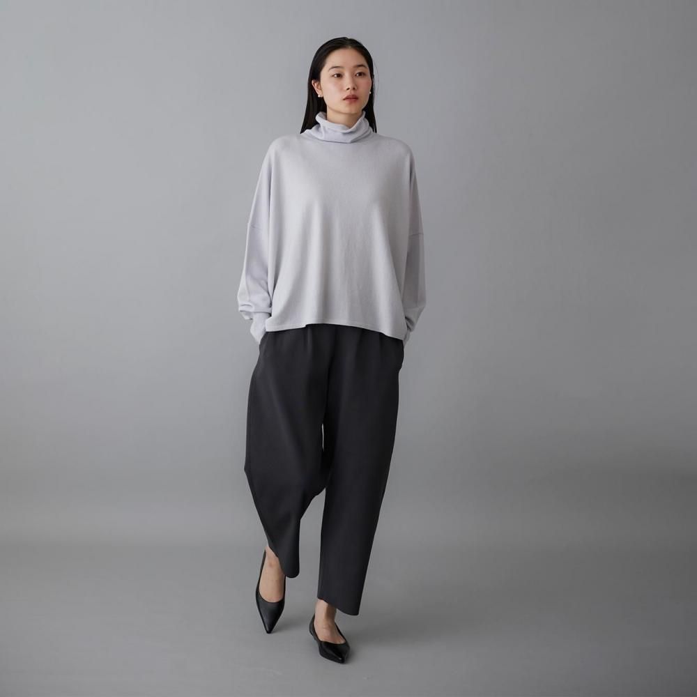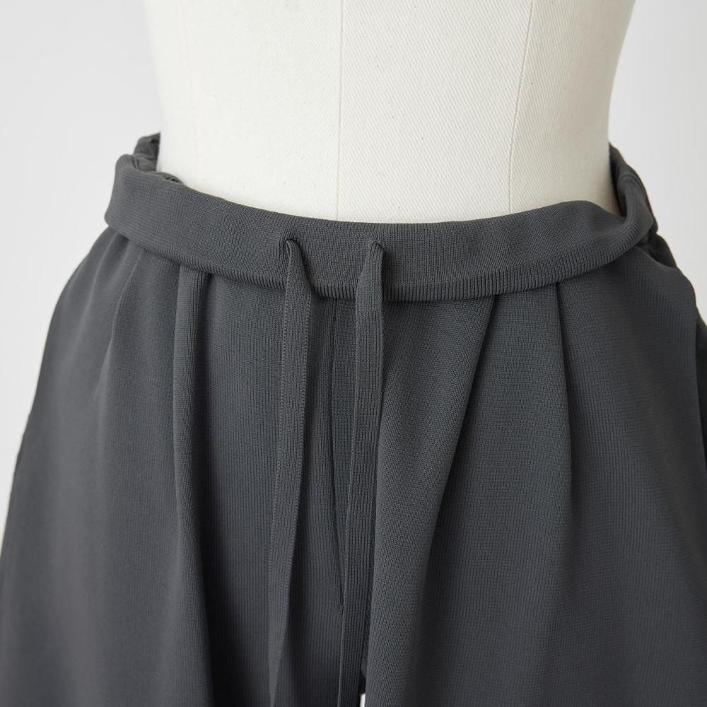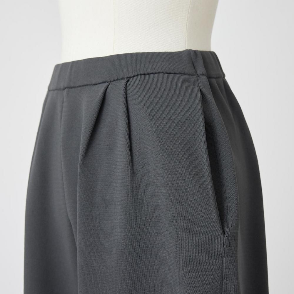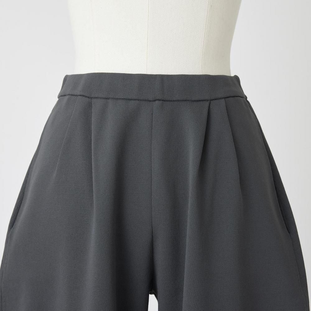 柔らかな光沢とややかためのしっかりとした編地のポリエステル素材で仕立てたタックパンツです。
