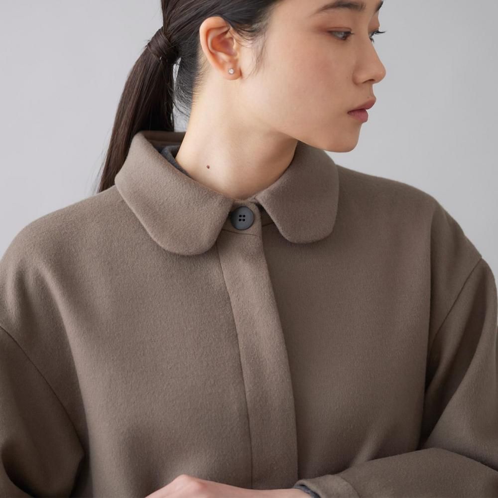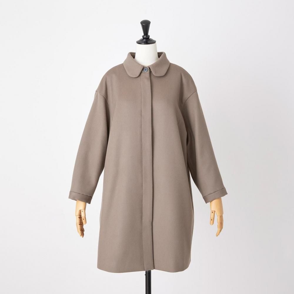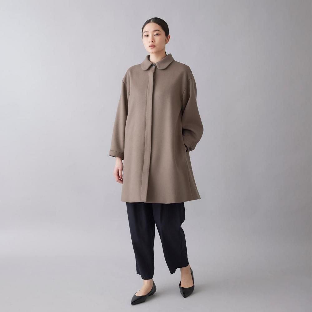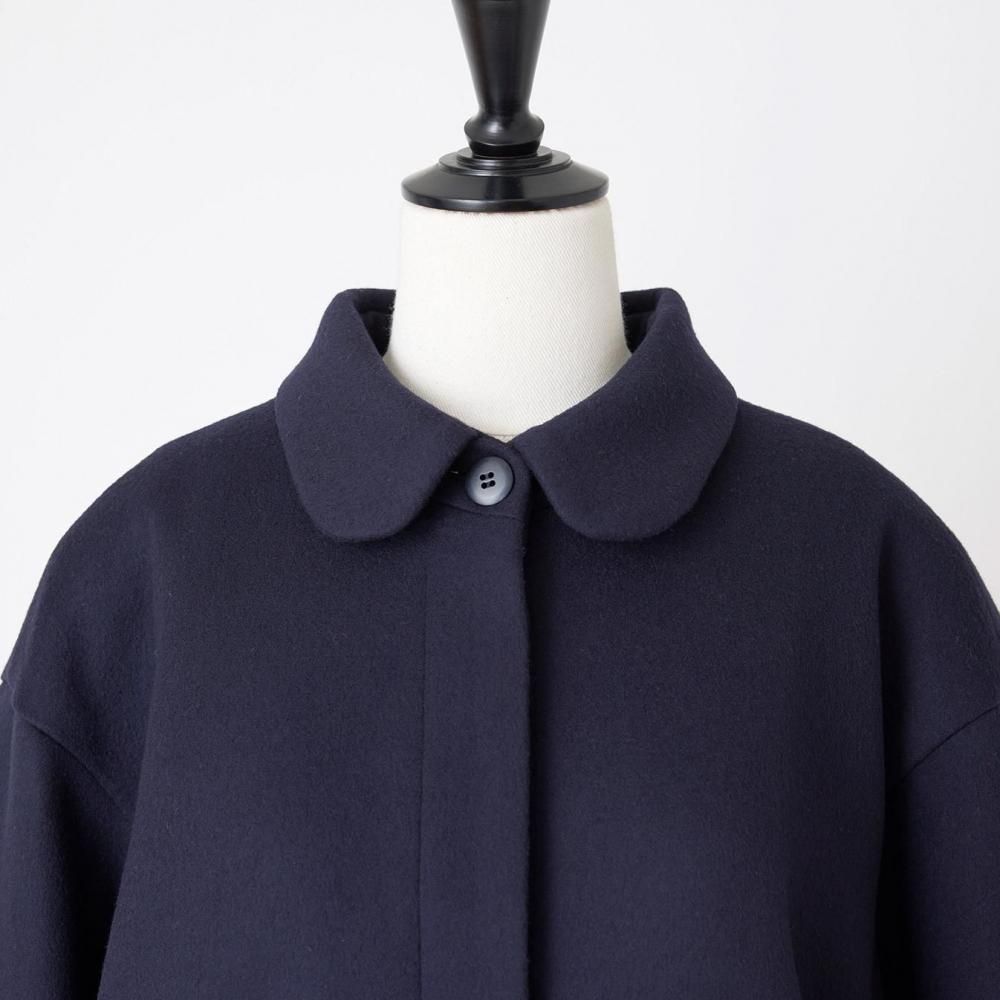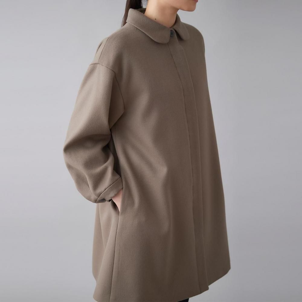 丸みのある衿が顔まわりをやわらかく見せ、比翼仕立てのフロントがすっきりとした印象に。
