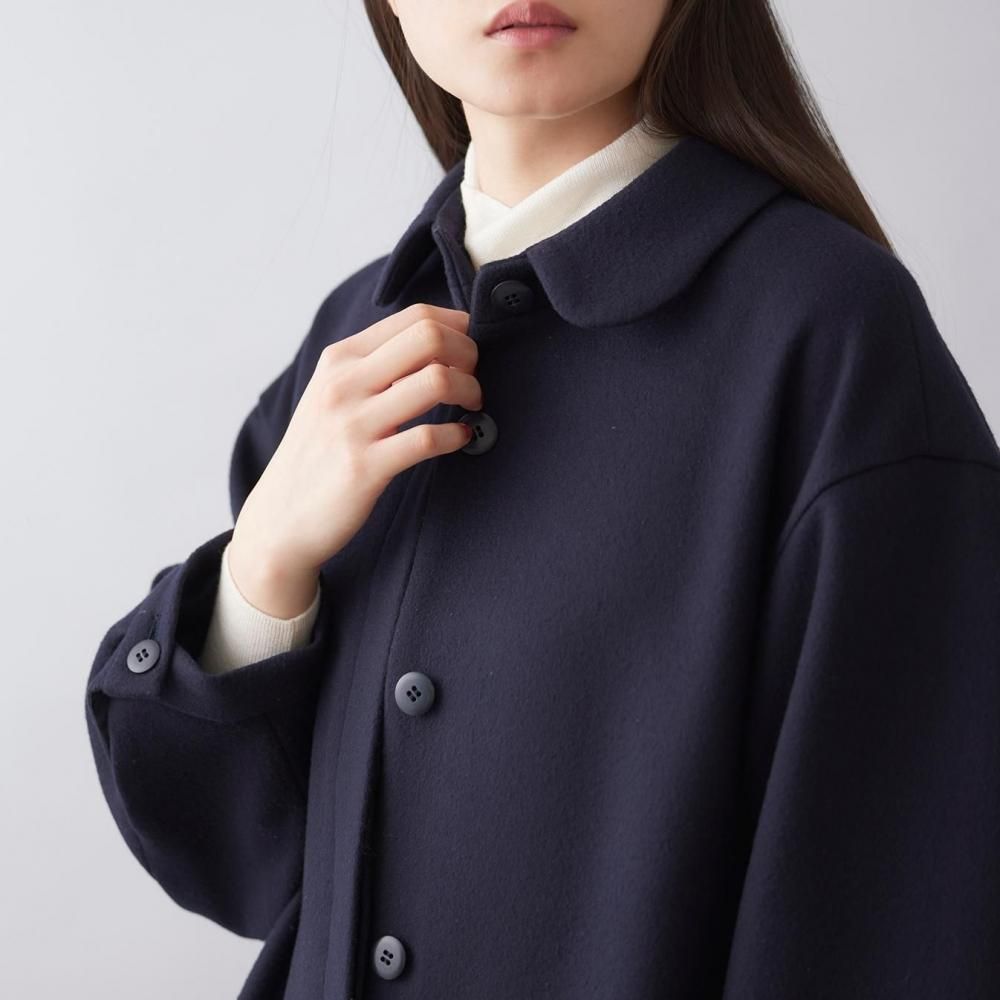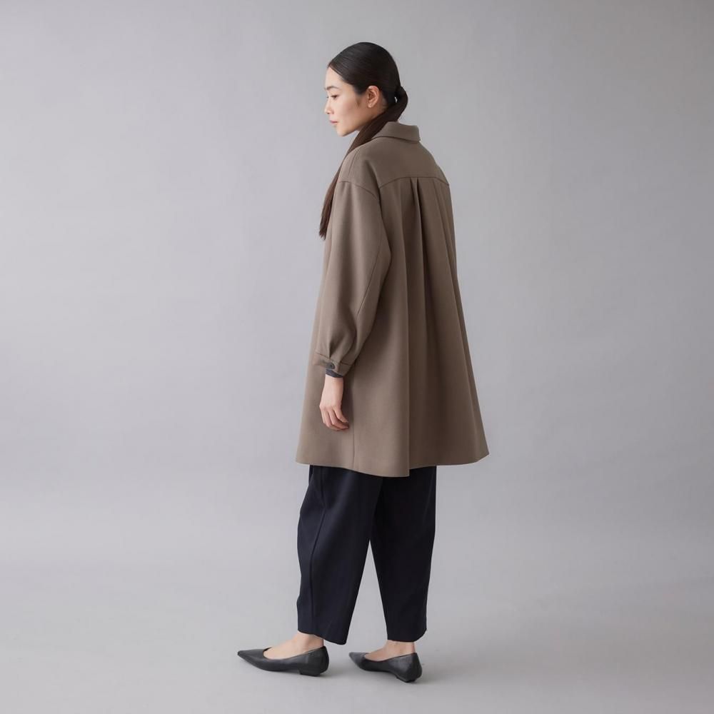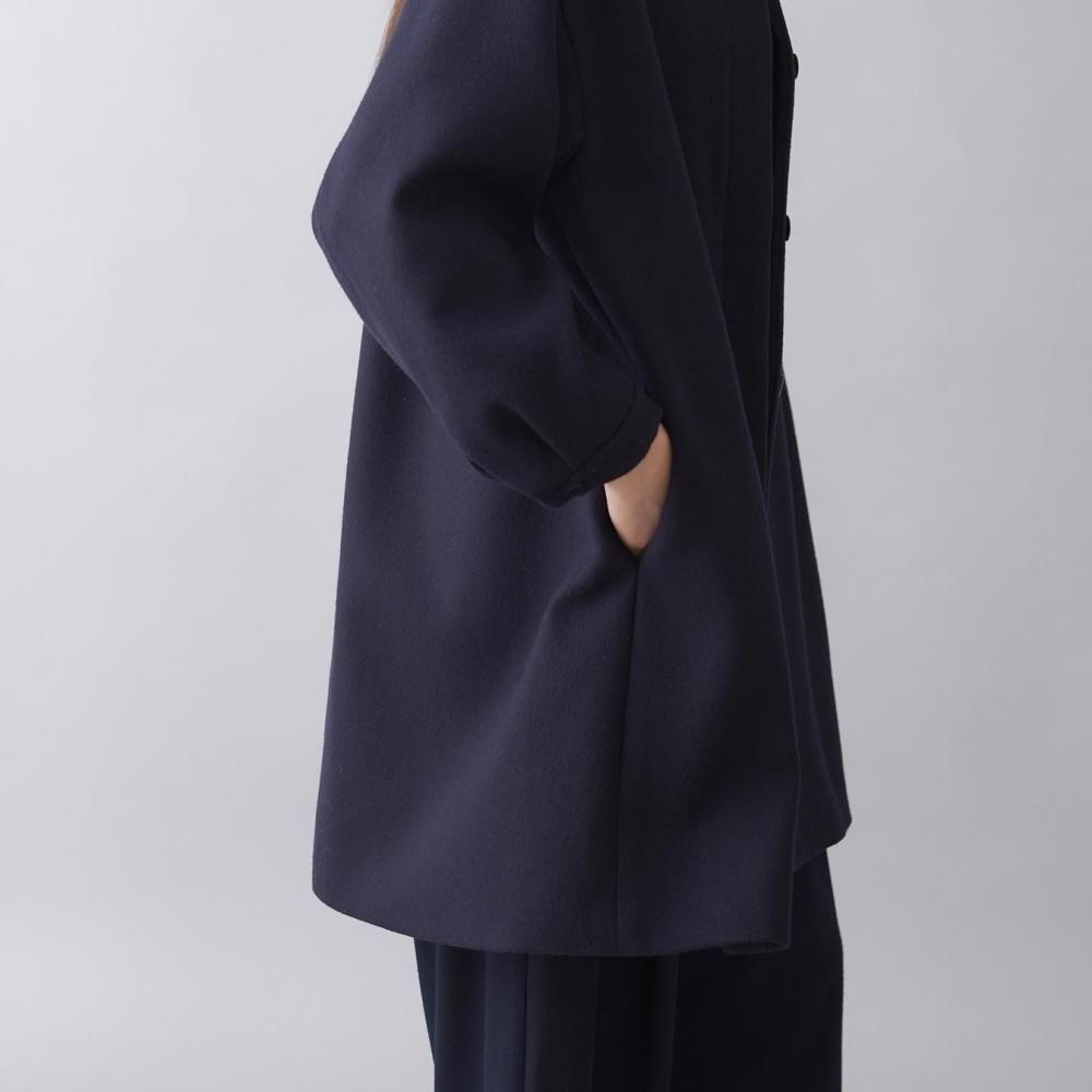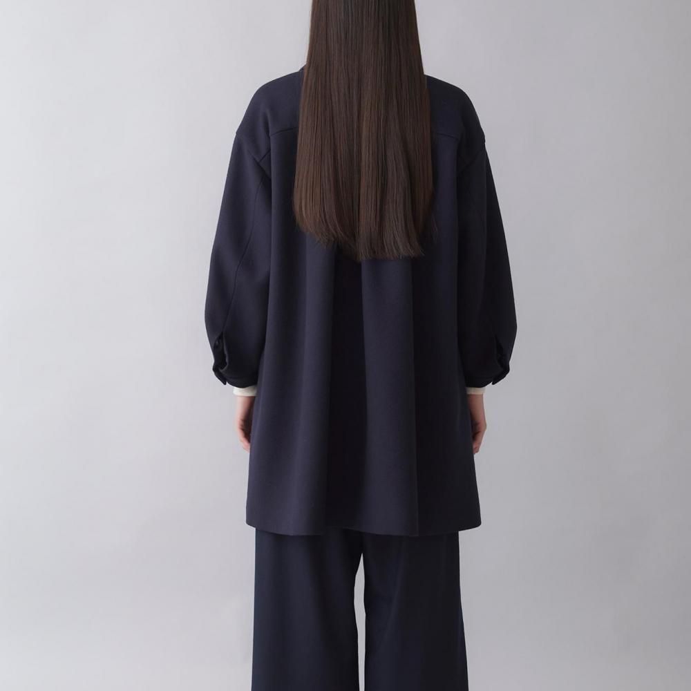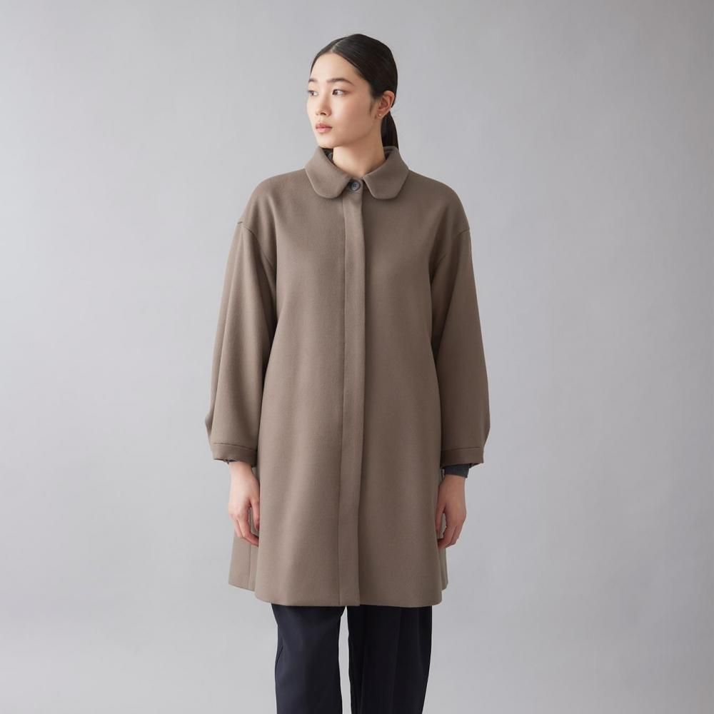 丸みのある衿が顔まわりをやわらかく見せ、比翼仕立てのフロントがすっきりとした印象に。