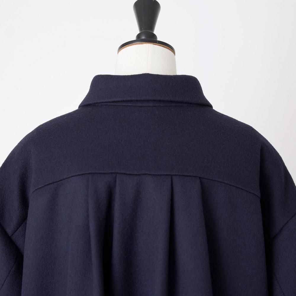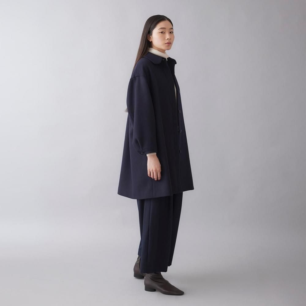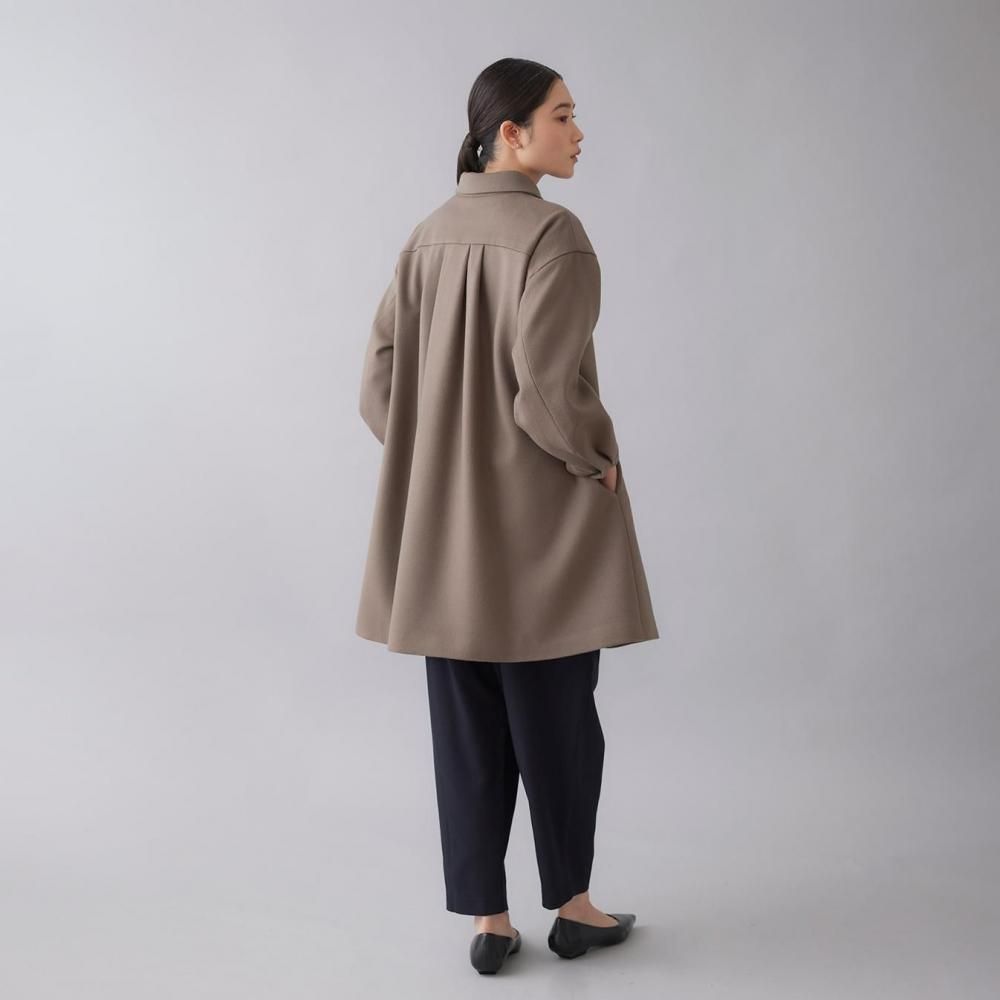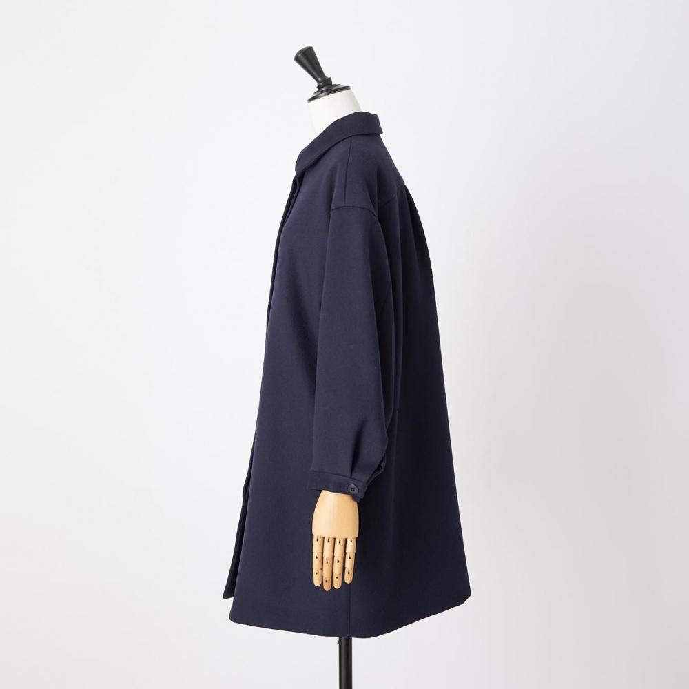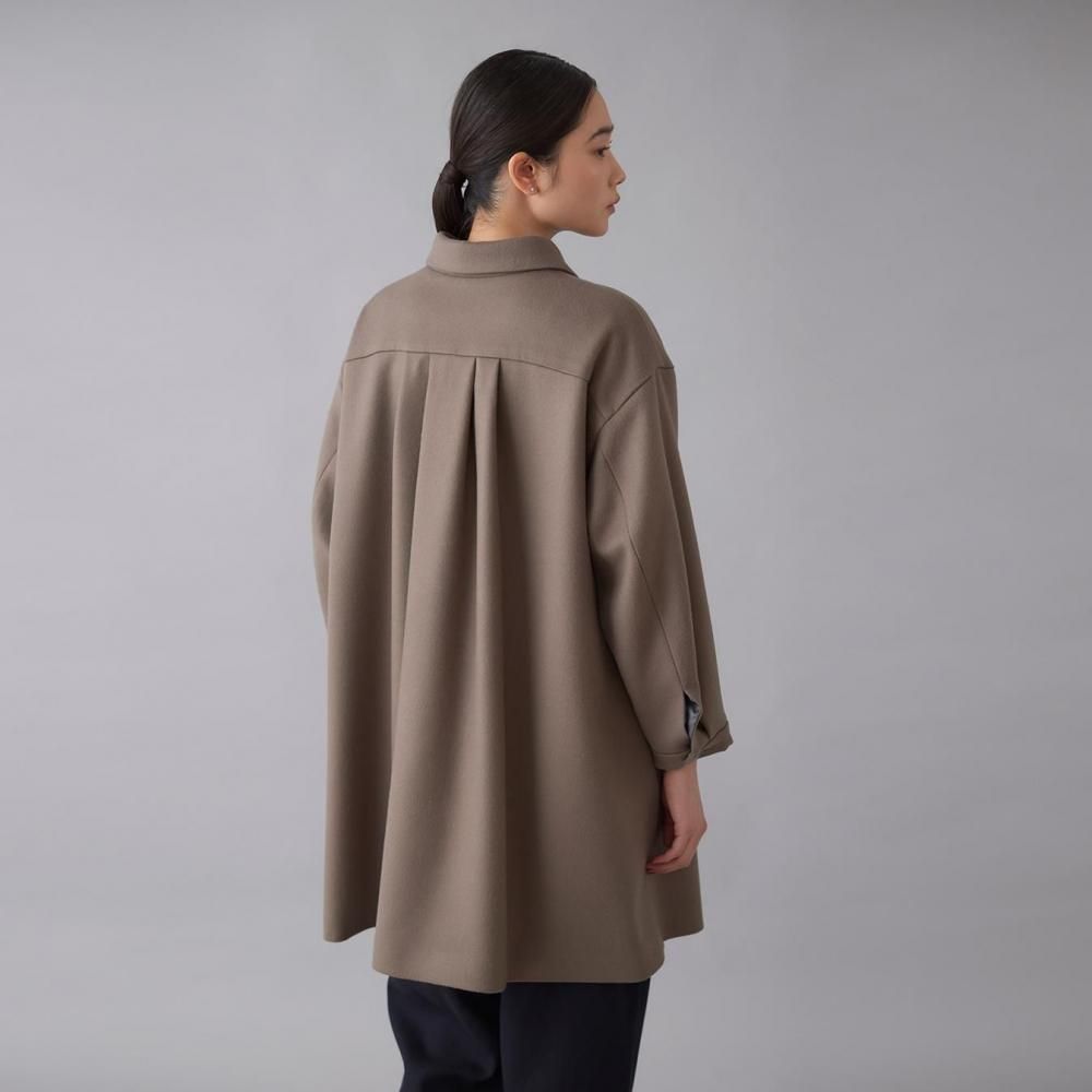丸みのある衿が顔まわりをやわらかく見せ、比翼仕立てのフロントがすっきりとした印象に。