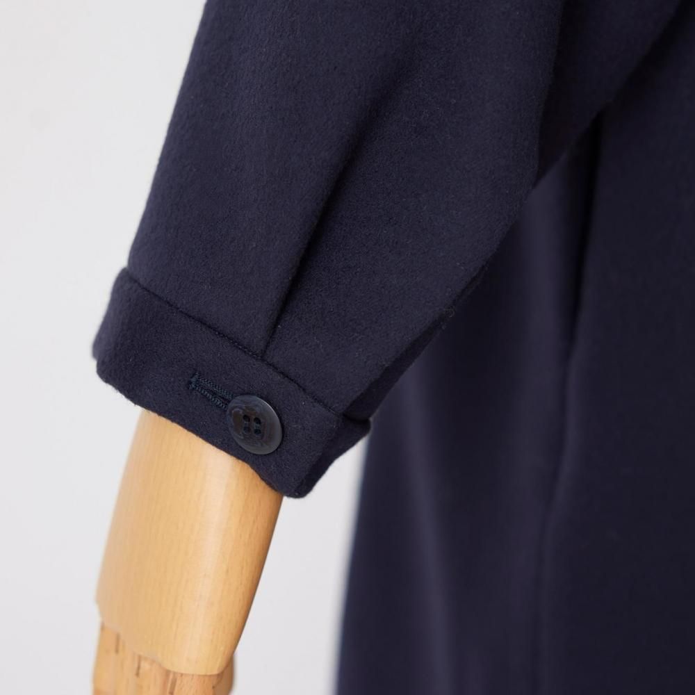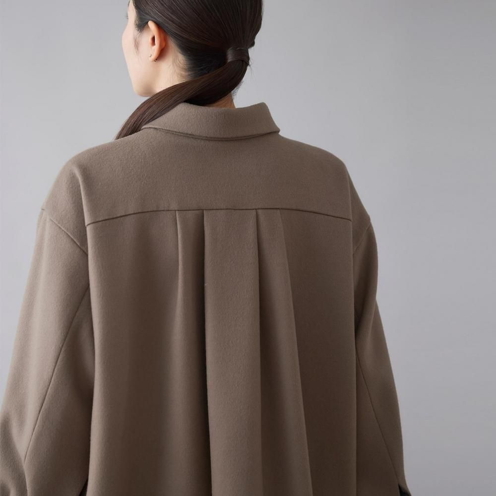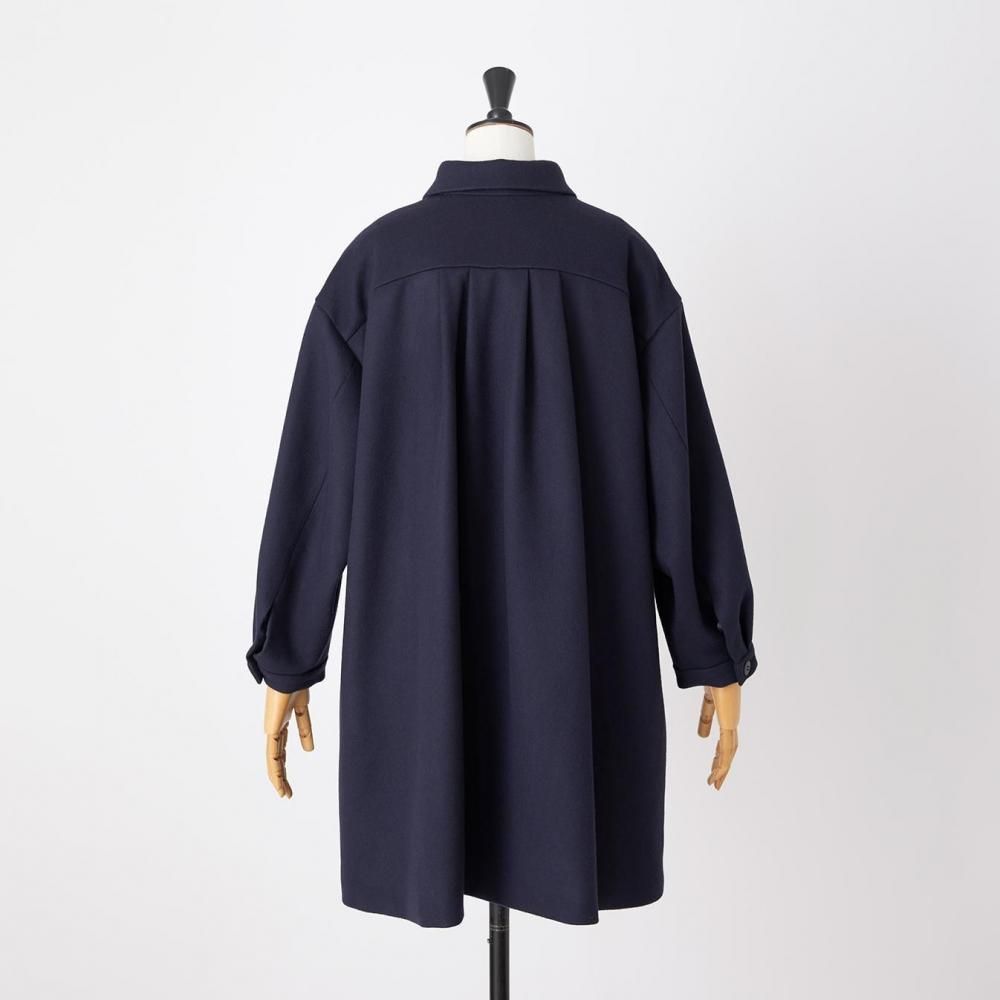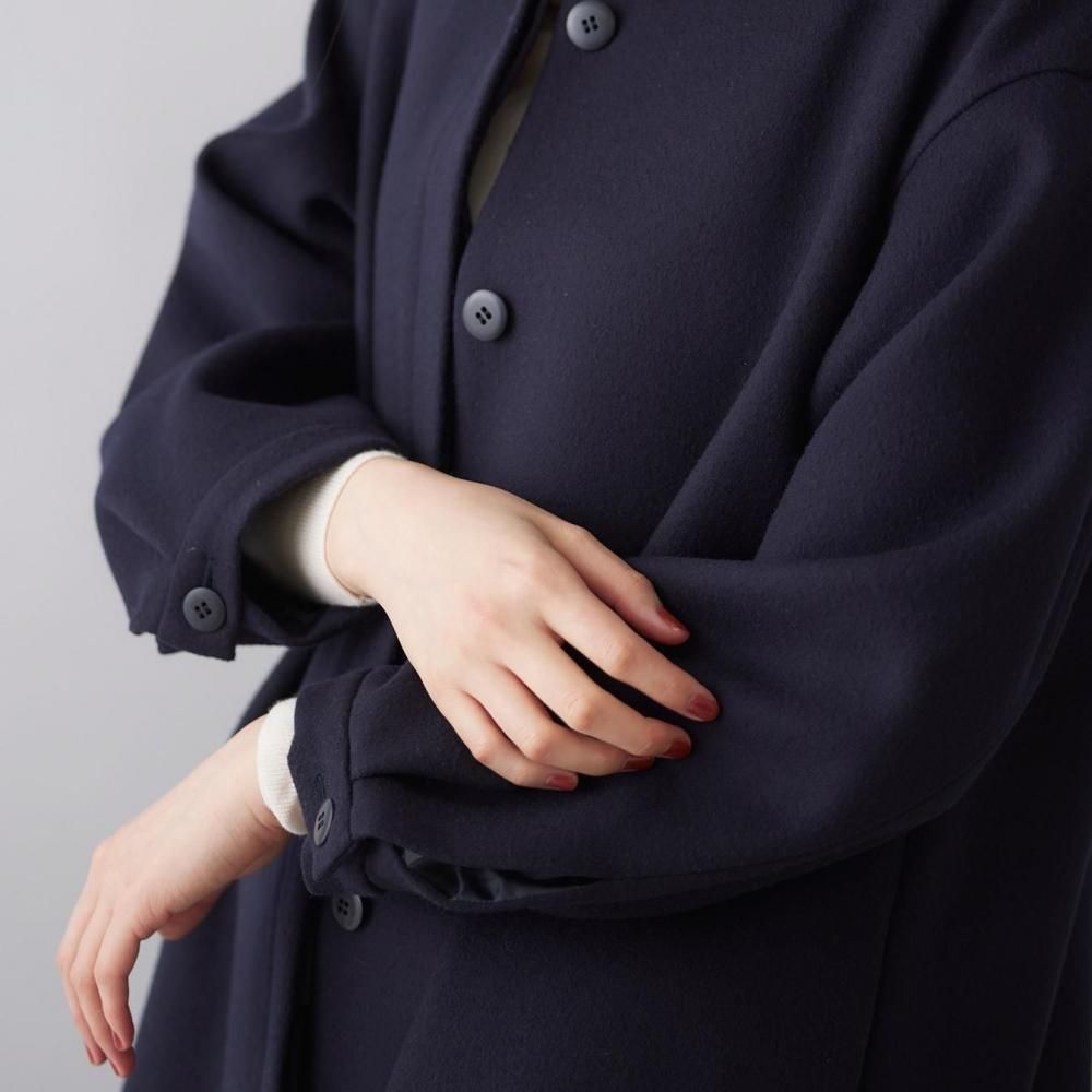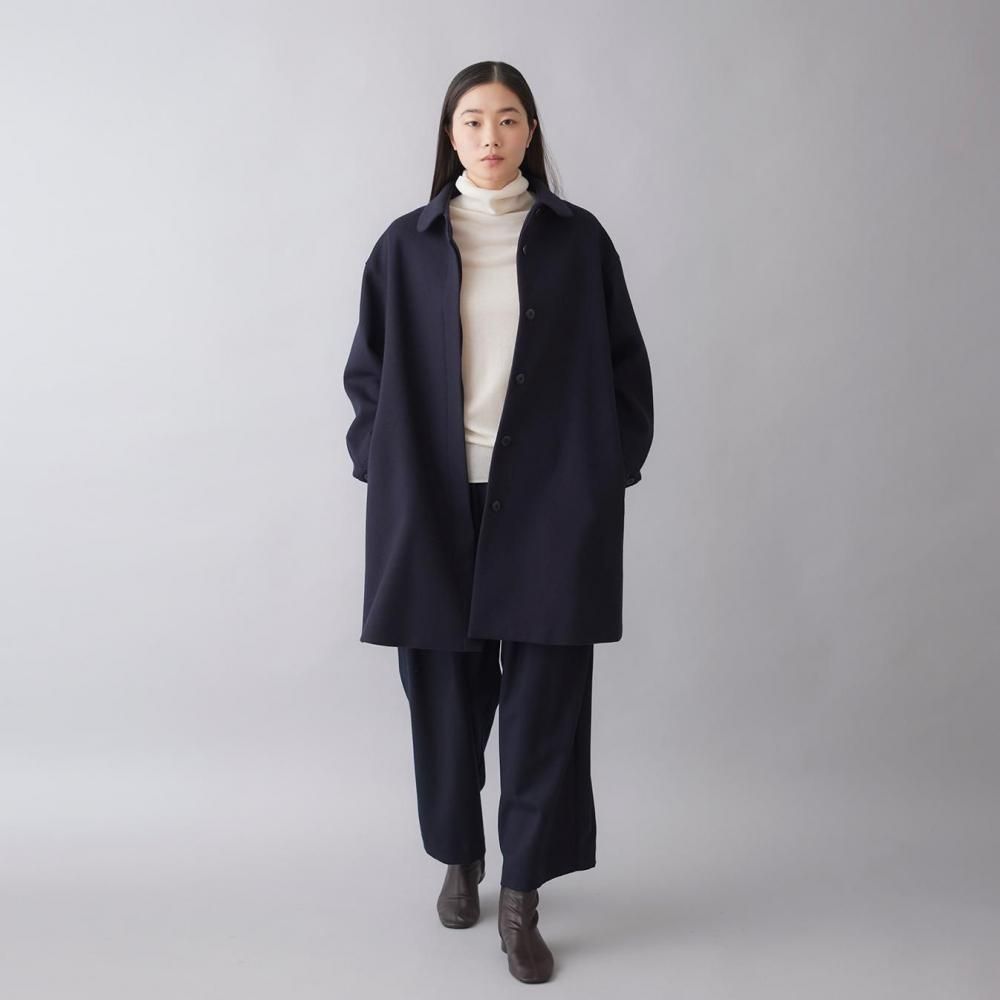 丸みのある衿が顔まわりをやわらかく見せ、比翼仕立てのフロントがすっきりとした印象に。