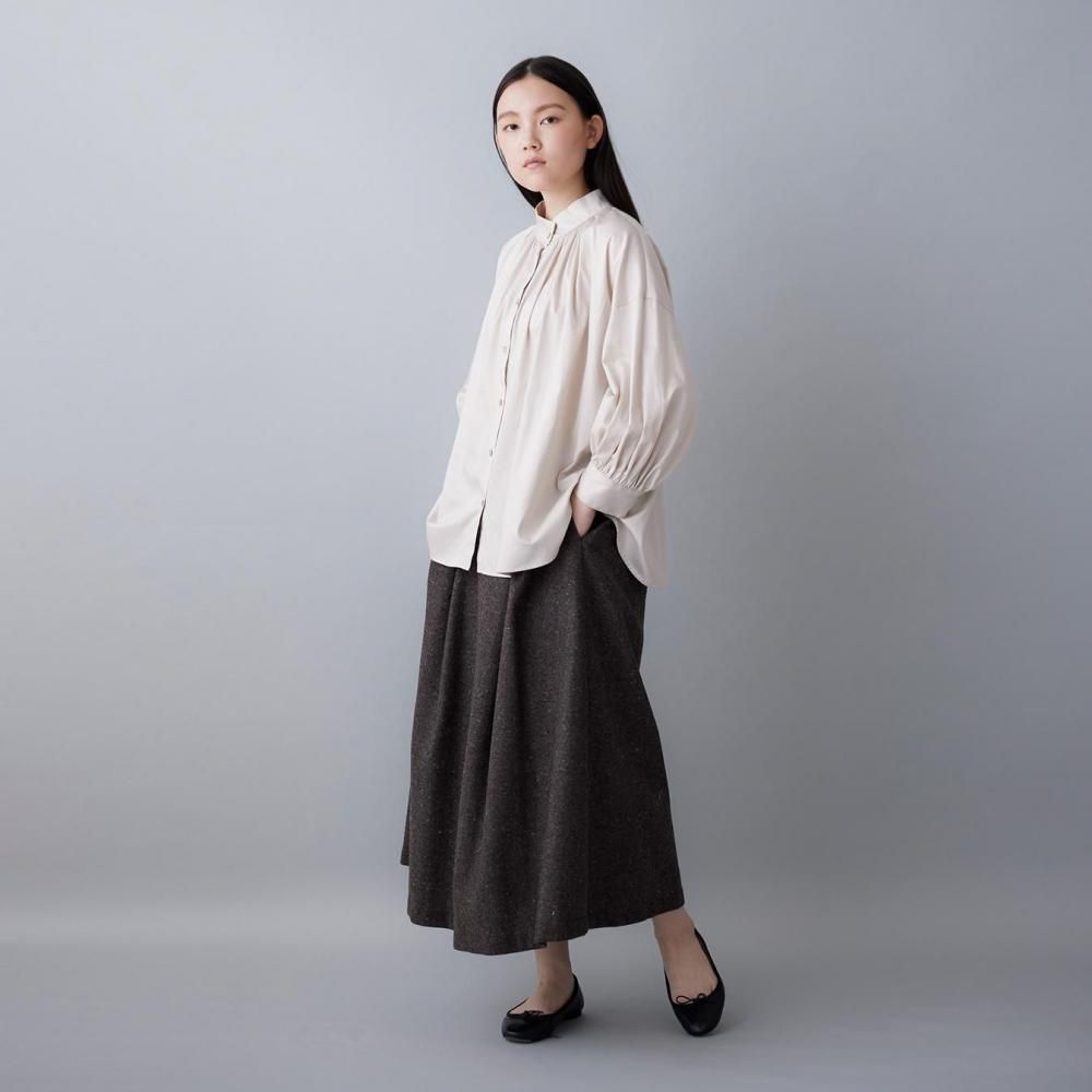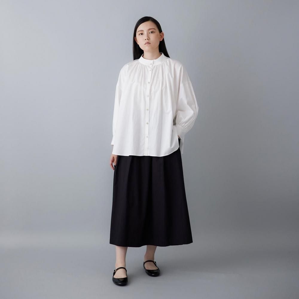 首元から肩にかけて入れた細やかなギャザーが、やわらかな膨らみと立体感を生み出すボリュームスリーブシャツ。