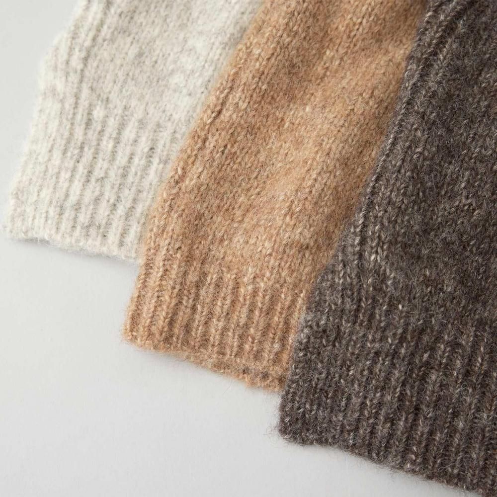希少な超長綿ピマコットンのシルキーな質感と、ファインアルパカのしっとりした温もりが調和し、通常の糸よりも柔らかくふんわりとした風合いに仕上がっています。