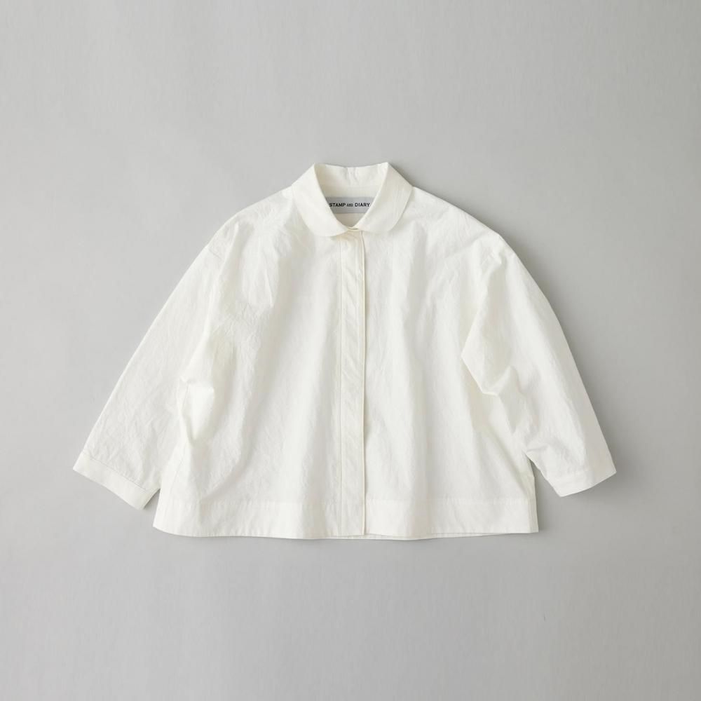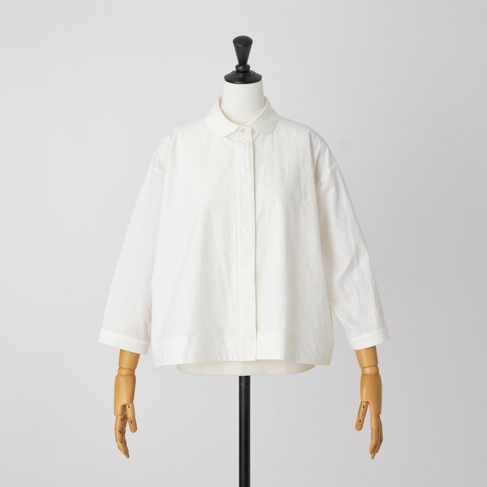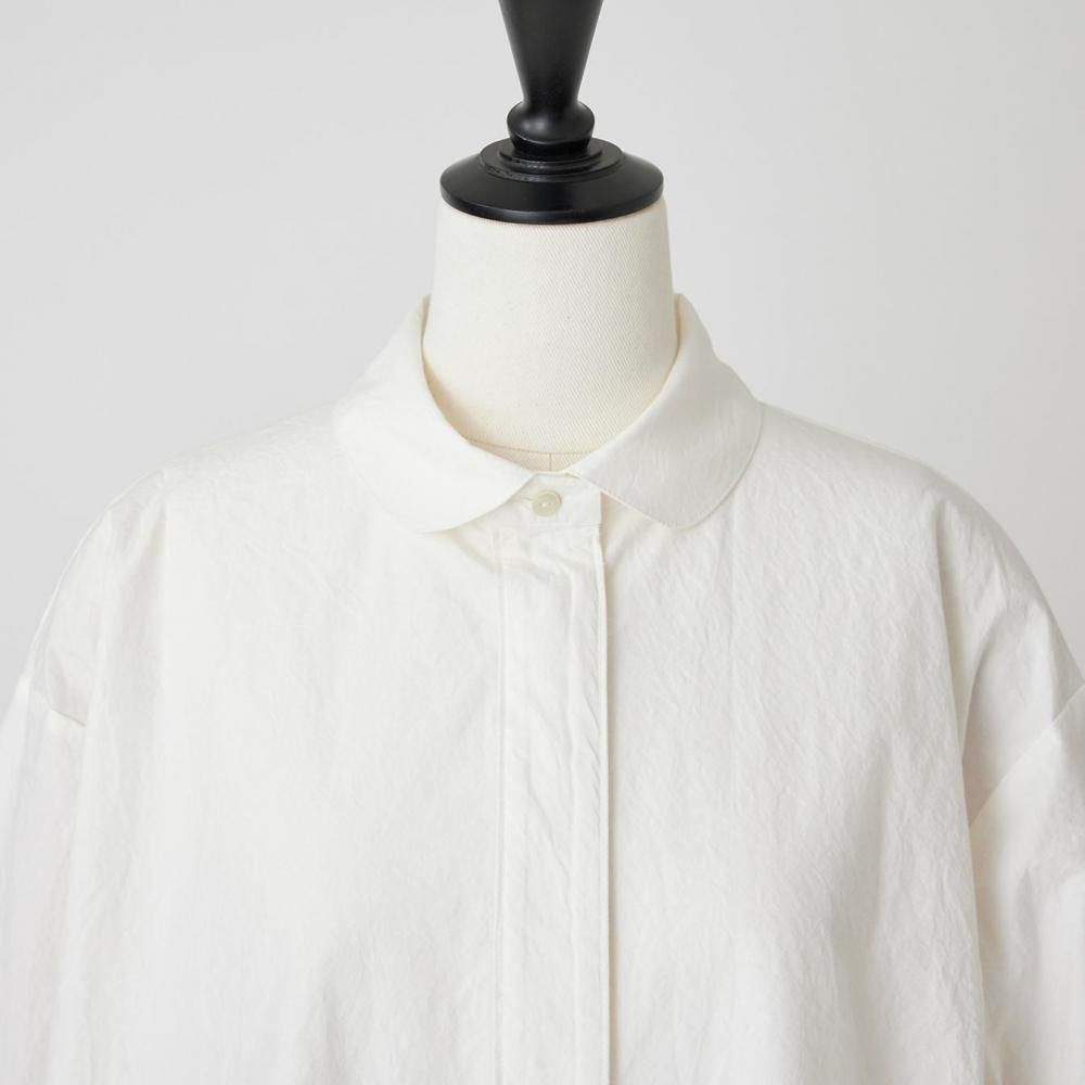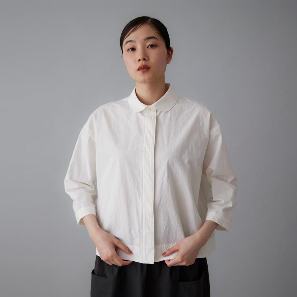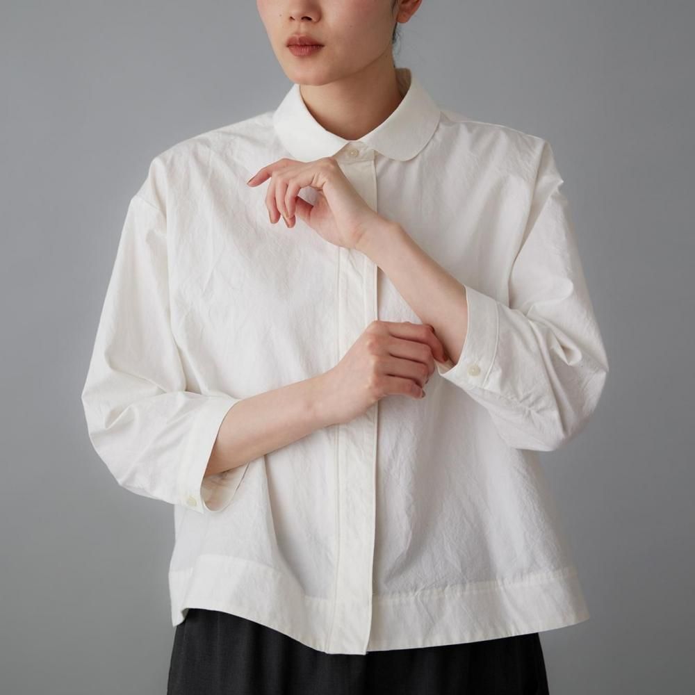 洗いざらしたような自然な風合いと、軽やかなハリ感が魅力の丸襟コットンシャツ。