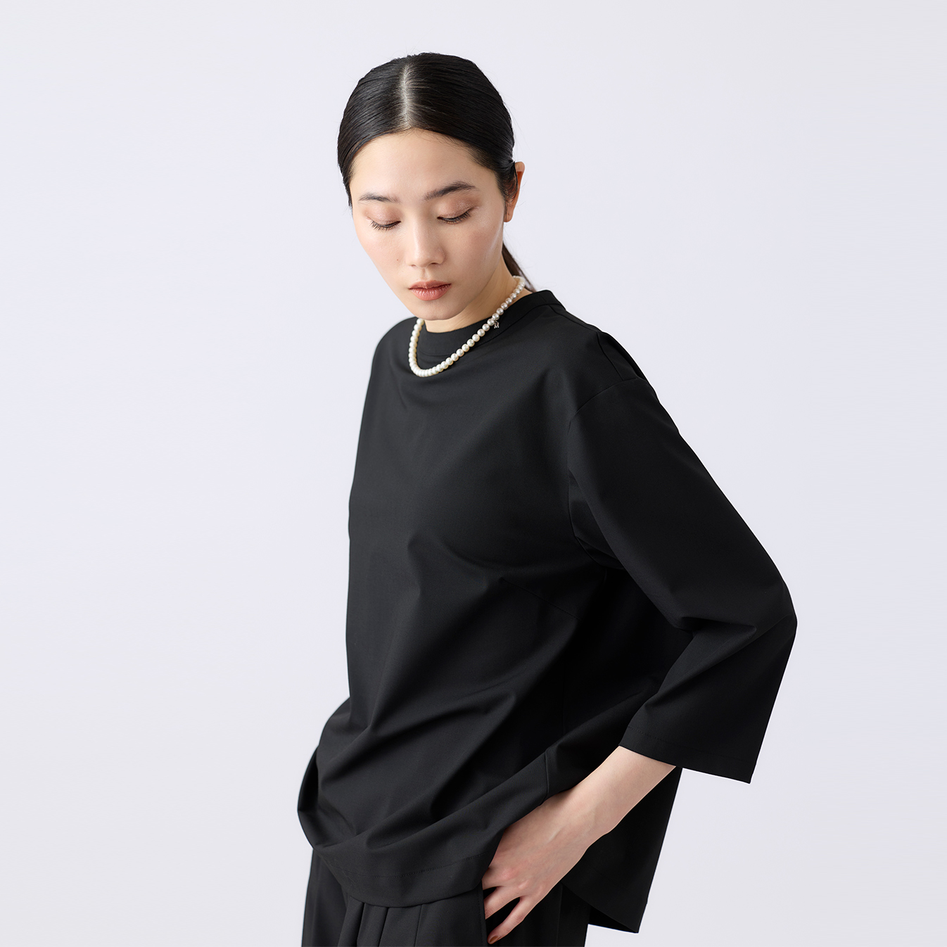 レーヨンならではのしなやかな落ち感に、ポリエステルのさらりとした清涼感、さらにポリウレタンのストレッチ性をプラス。