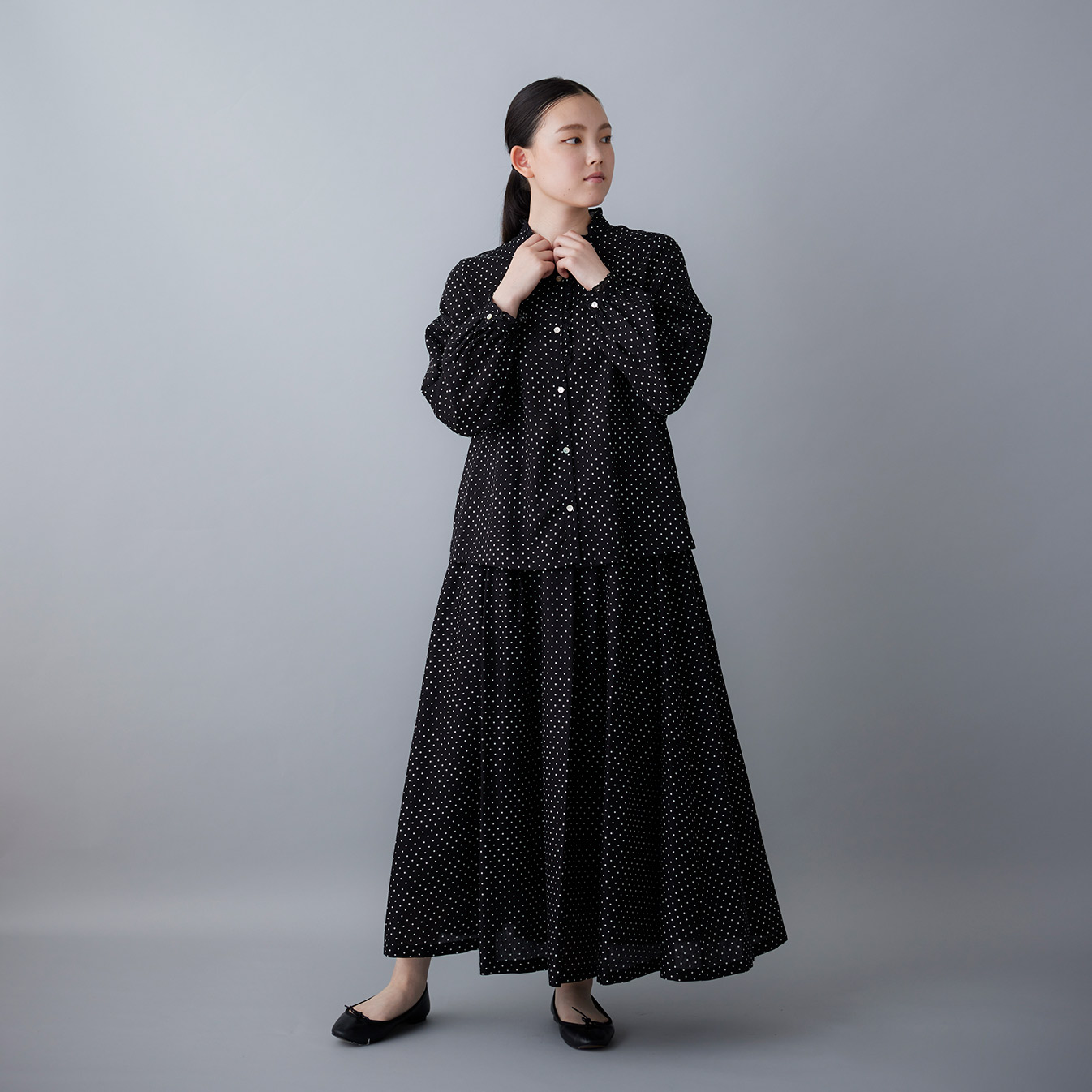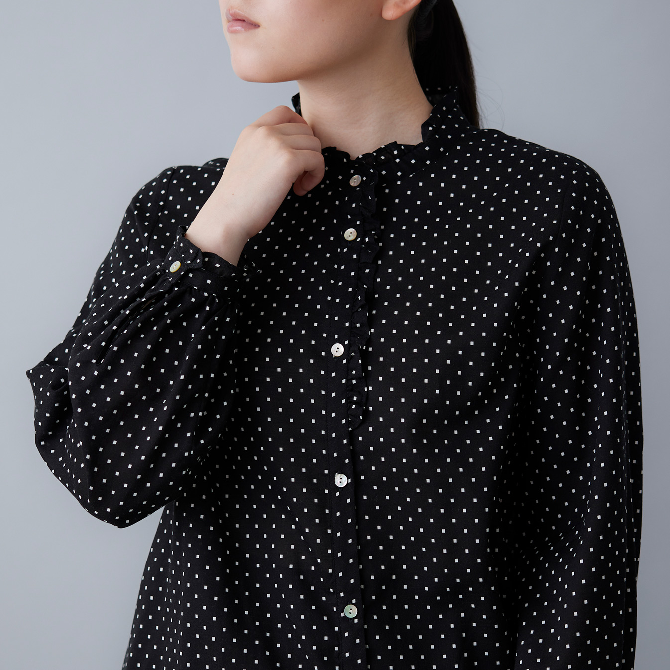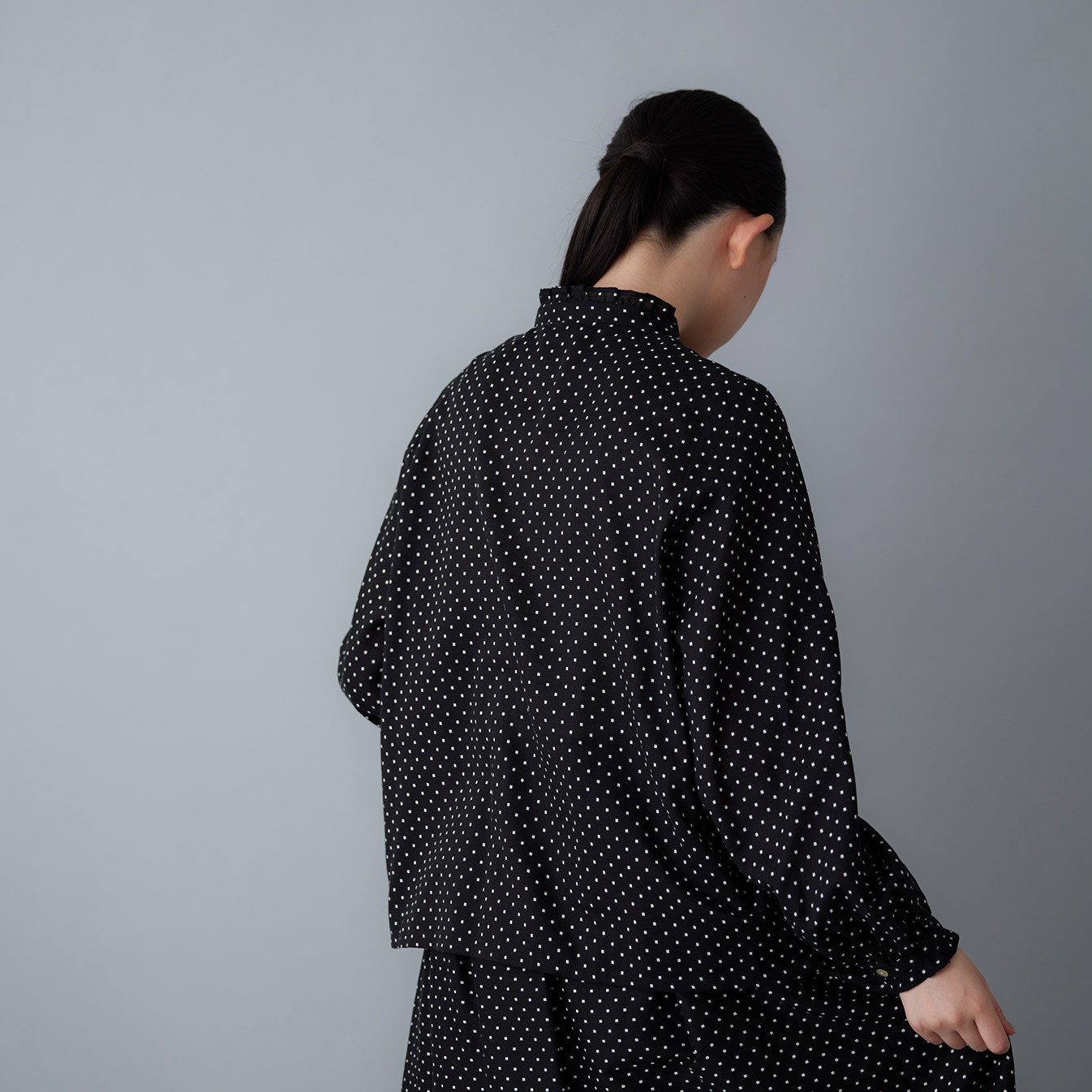 スタンドカラーと胸もと、袖口にあしらったフリルが、クラシカルな中にやさしい動きを添えます。