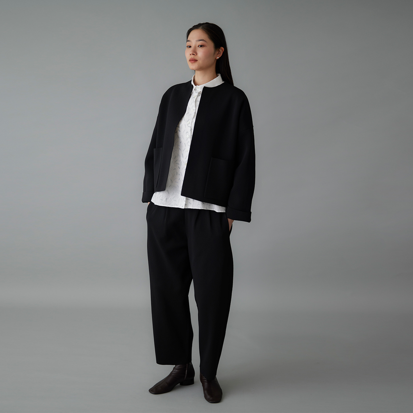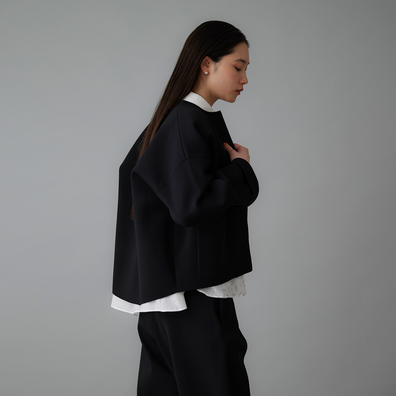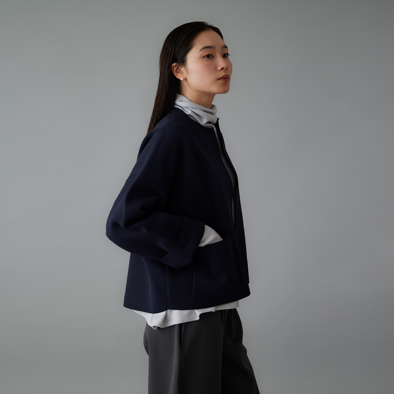 ほどよいハリとやわらかな光沢が魅力のポリエステル素材を使用したノーカラージャケット。