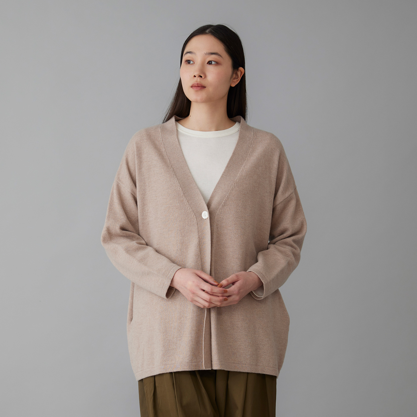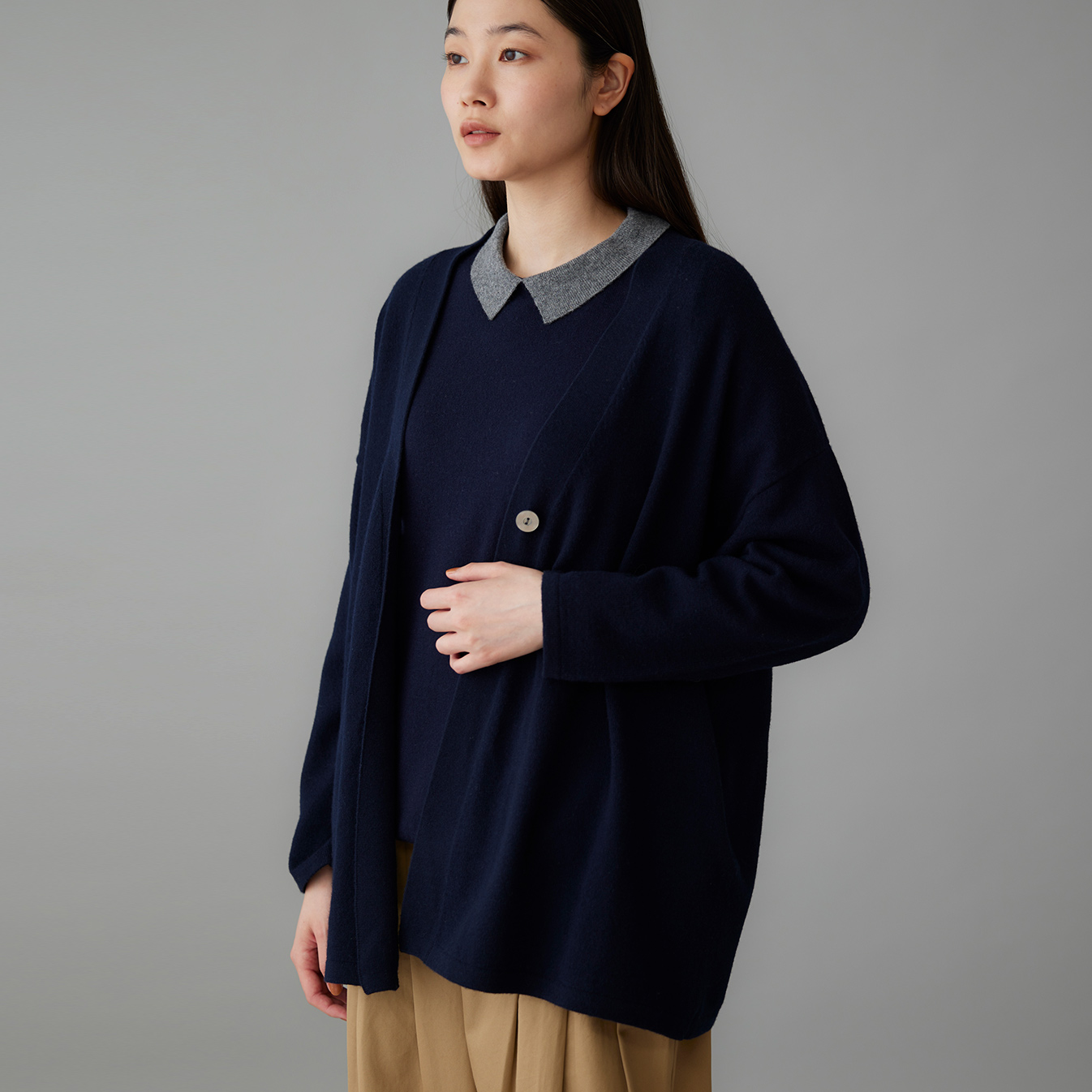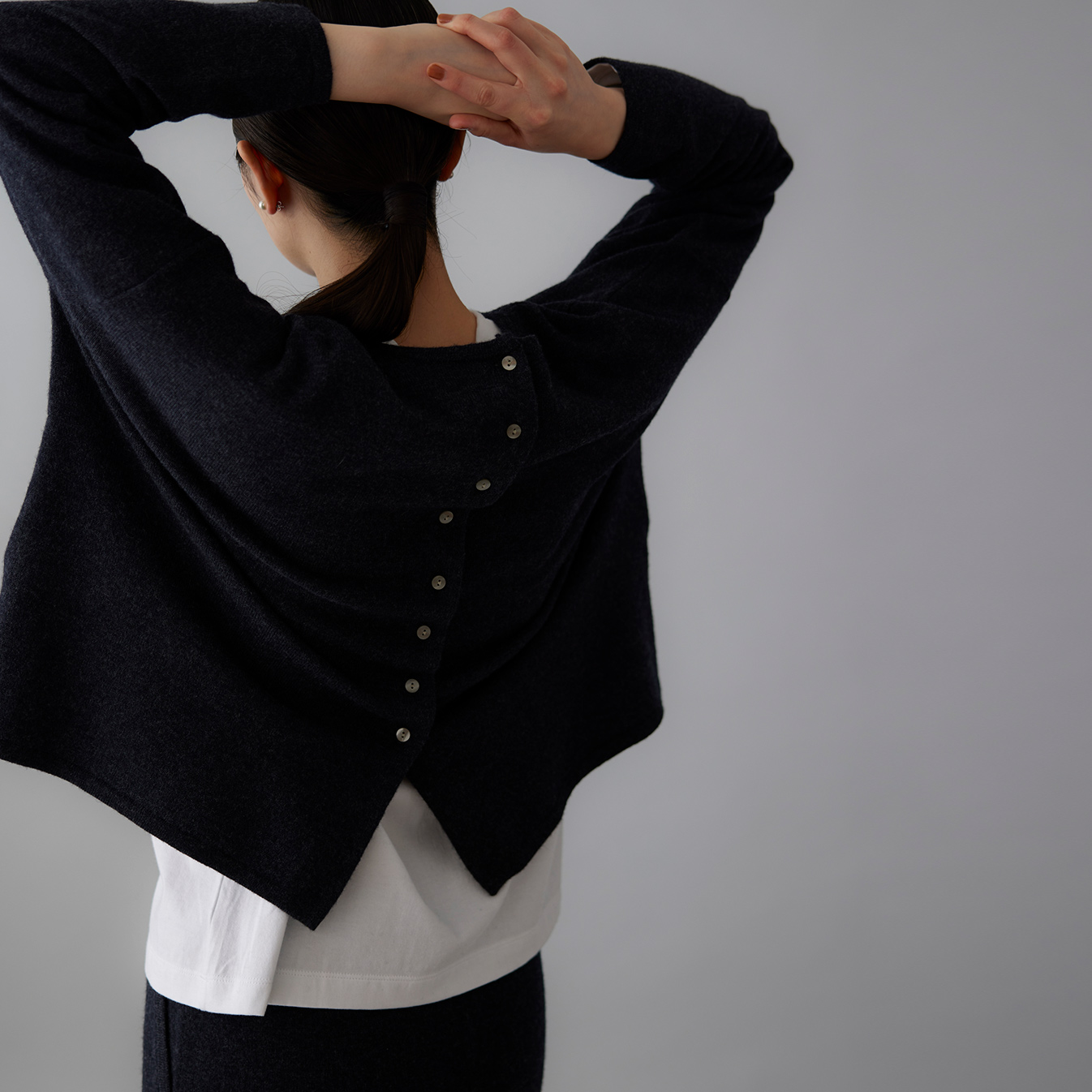前後どちらを前にしても着られる2wayカーディガンは、ブランドを代表する定番デザインのひとつ。