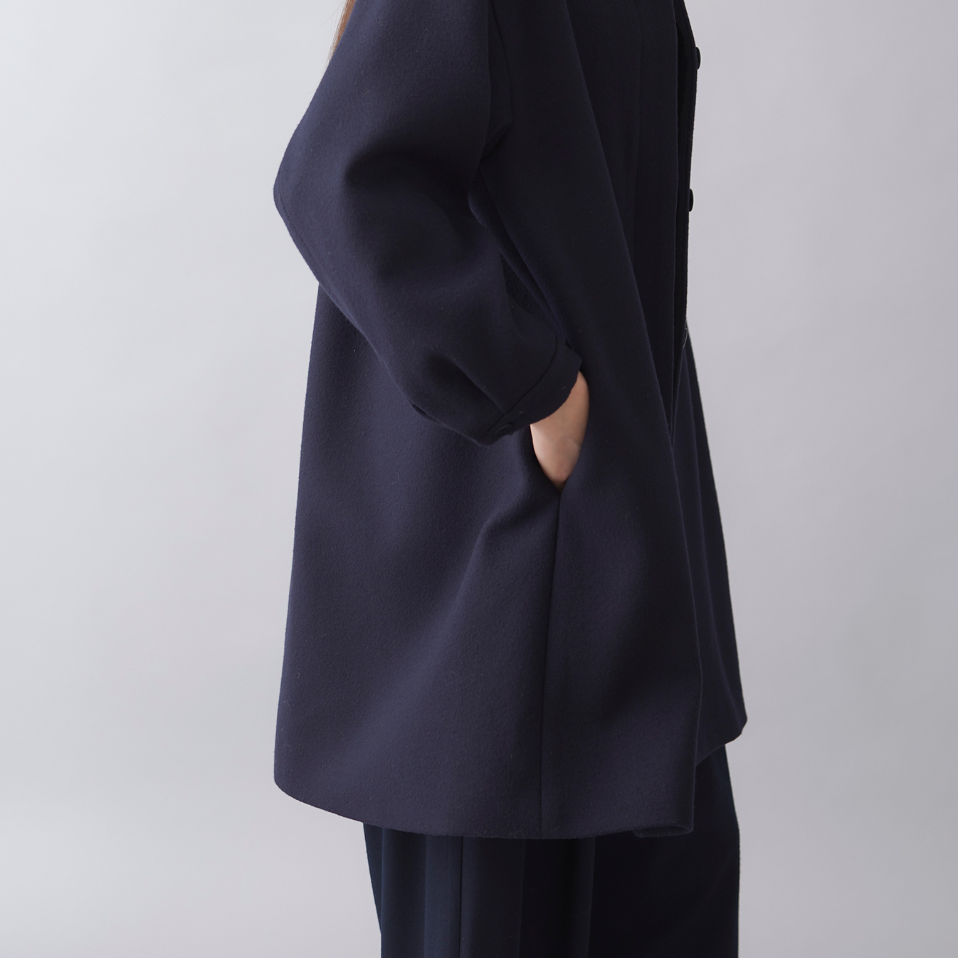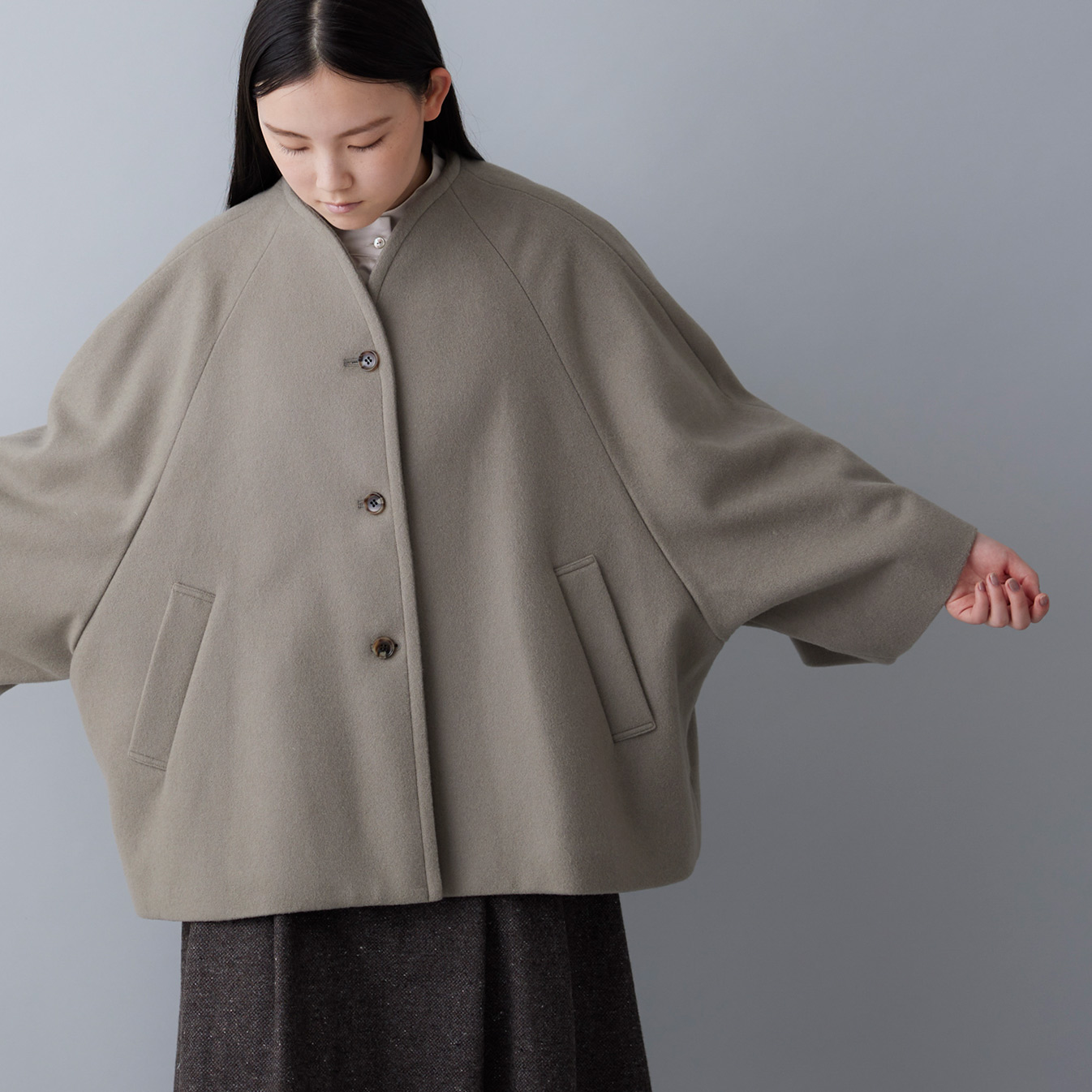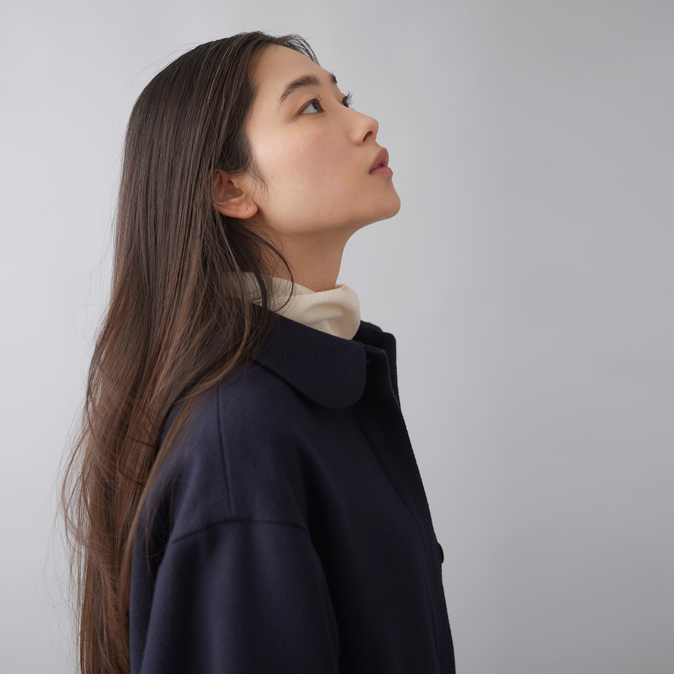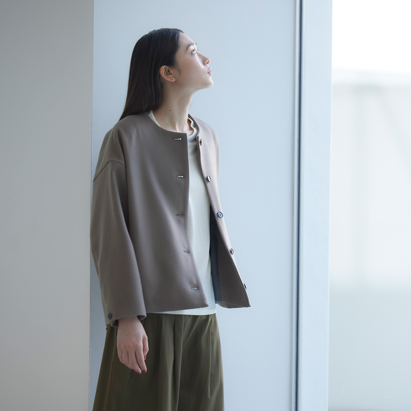 丸みを帯びたフォルムが自然な立体感を描き、首元のノーカラーが上品に顔まわりを整えます。
