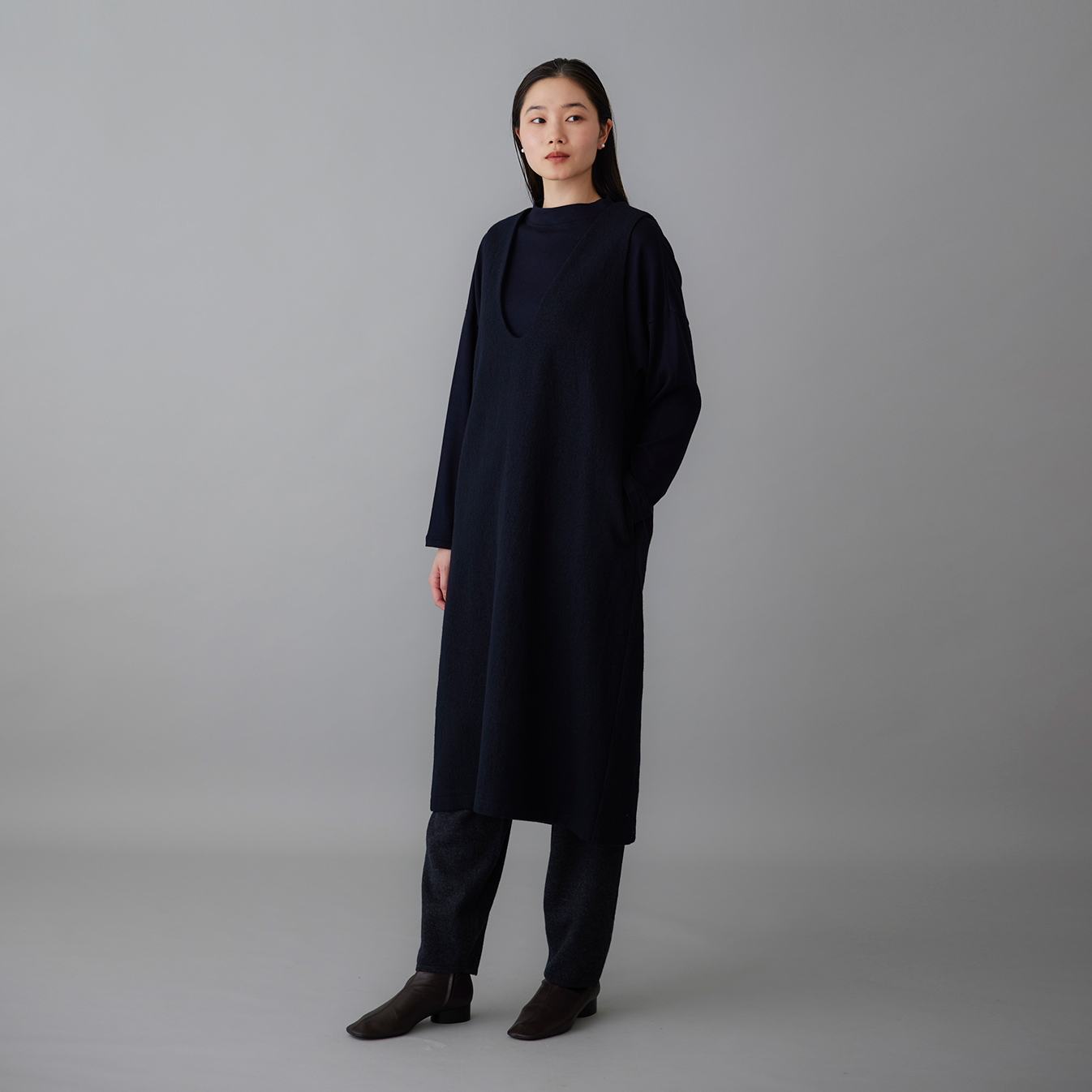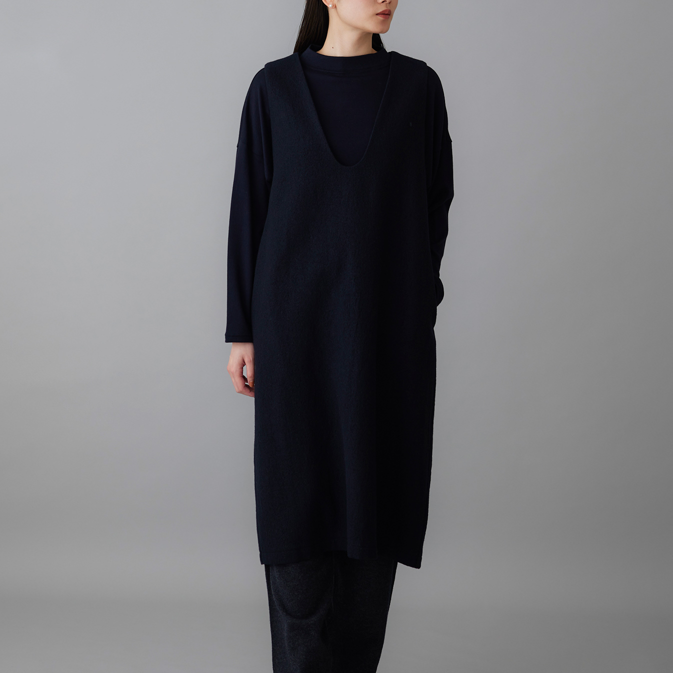 すとんと落ちるラインが体の輪郭を拾いすぎず、上品に見せるデザイン。