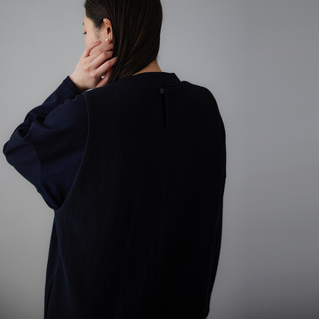 深めUネックとゆとりあるアームで、厚手のニットも重ねやすく、ブラウス合わせも華やかに。