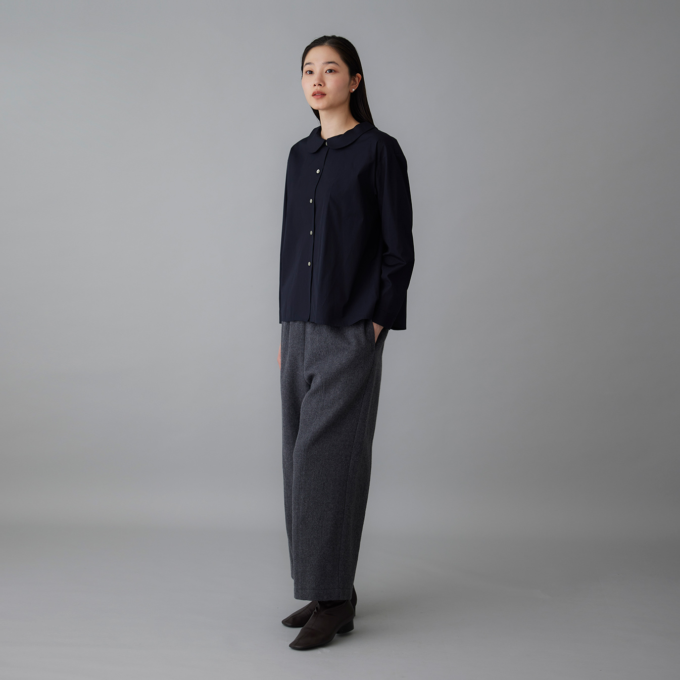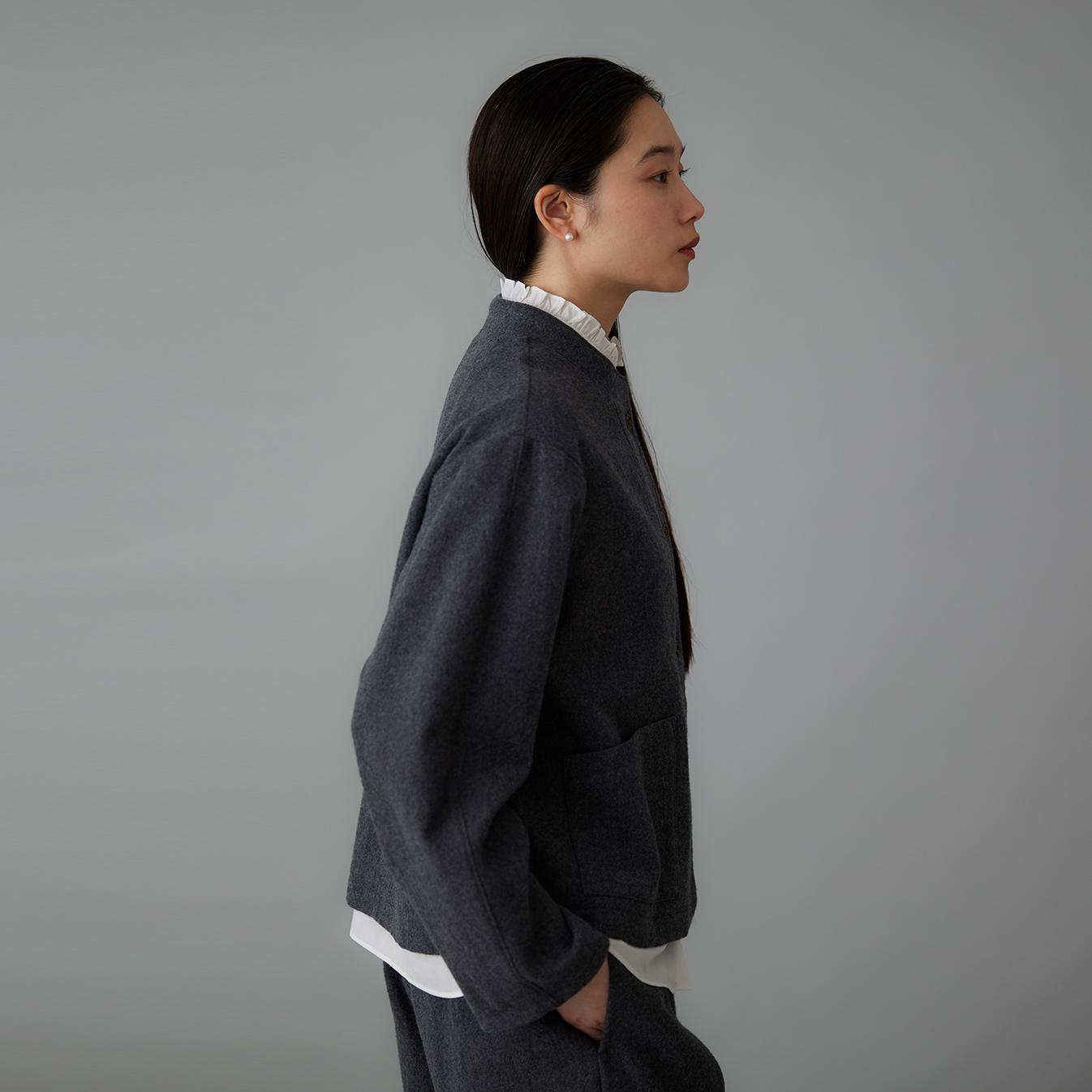 さらに、光を受けてほのかに艶めくウールの表情が、シンプルなデザインをぐっと洗練された印象へ。