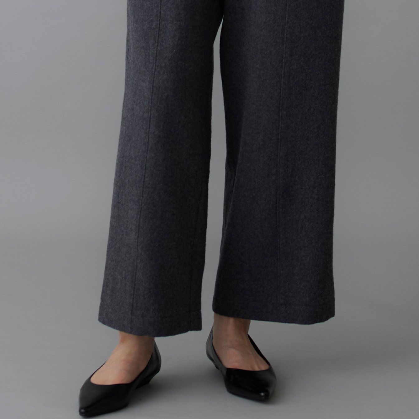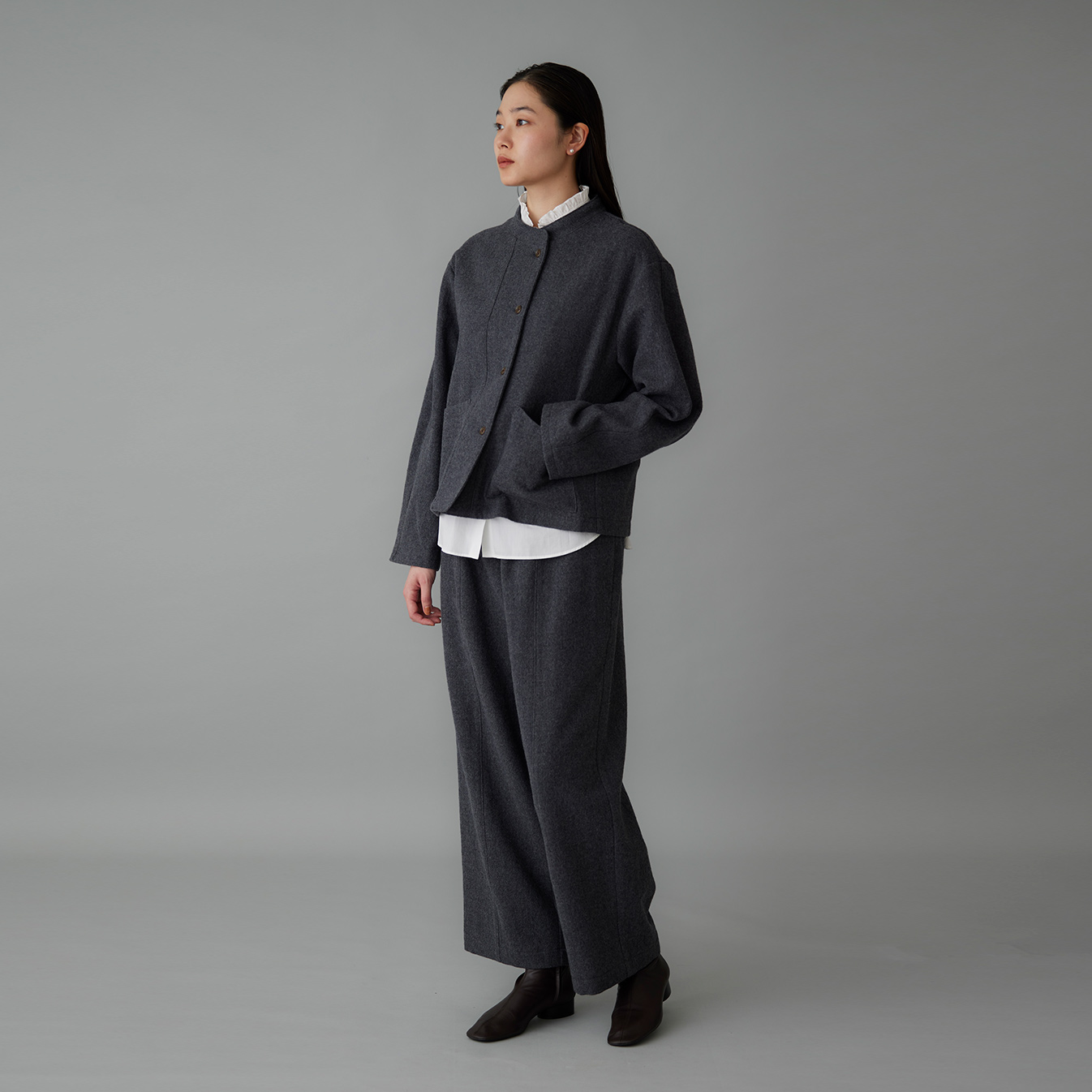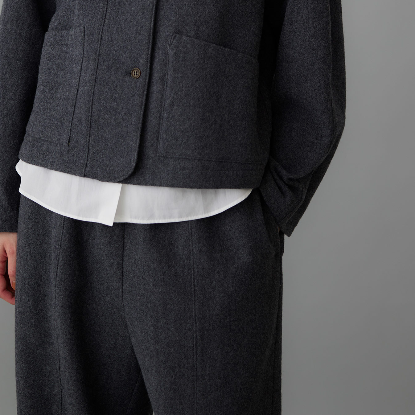フロントのセンターラインは、生地を丁寧につなぎ合わせた立体的な仕立てから生まれるもの。控えめながら表情があり、起毛感のある風合いが特徴です。