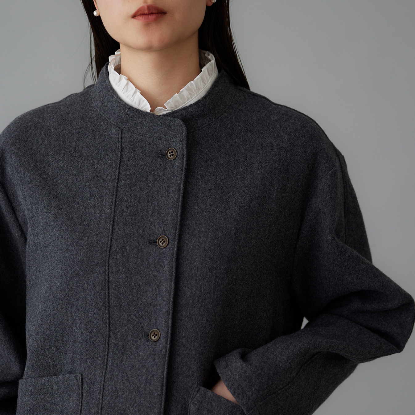 さっと羽織れてアウターとしても活躍する、スタンドカラーが映えるシンプルで上品な一着です。