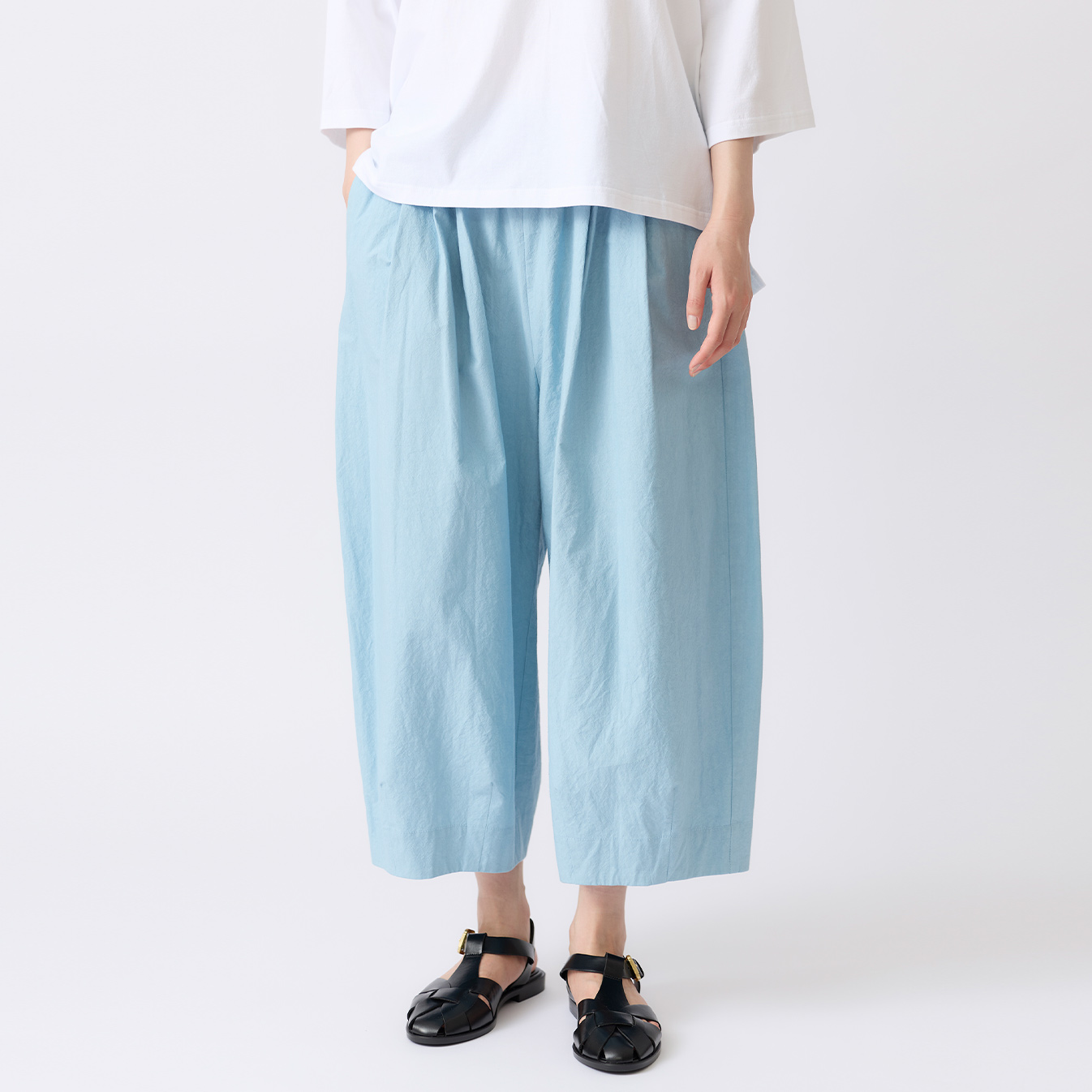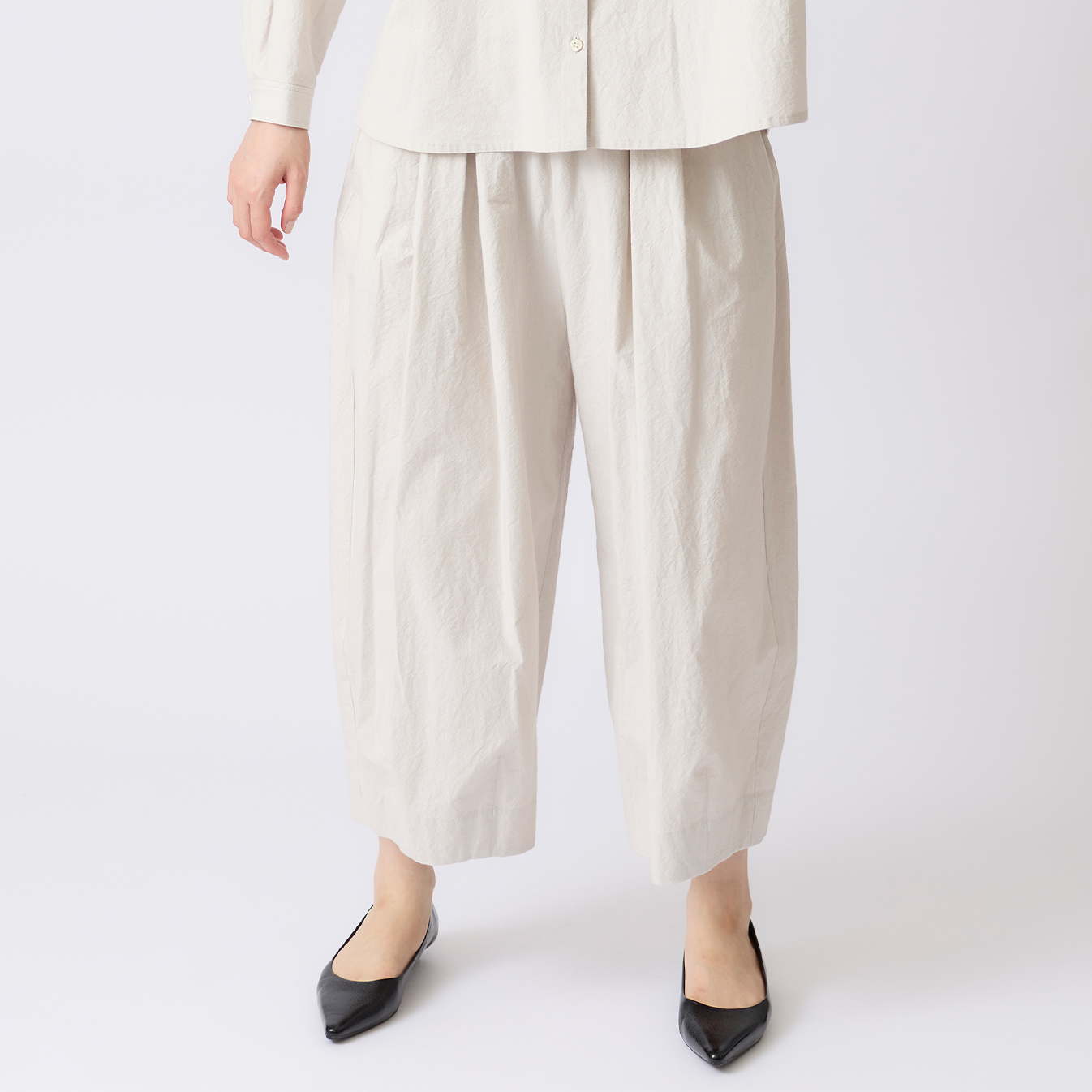 ウエスト左右に2本、裾には前後2本ずつダーツを入れ、ふんわりとしたコクーンシルエットに仕上げたパンツ。