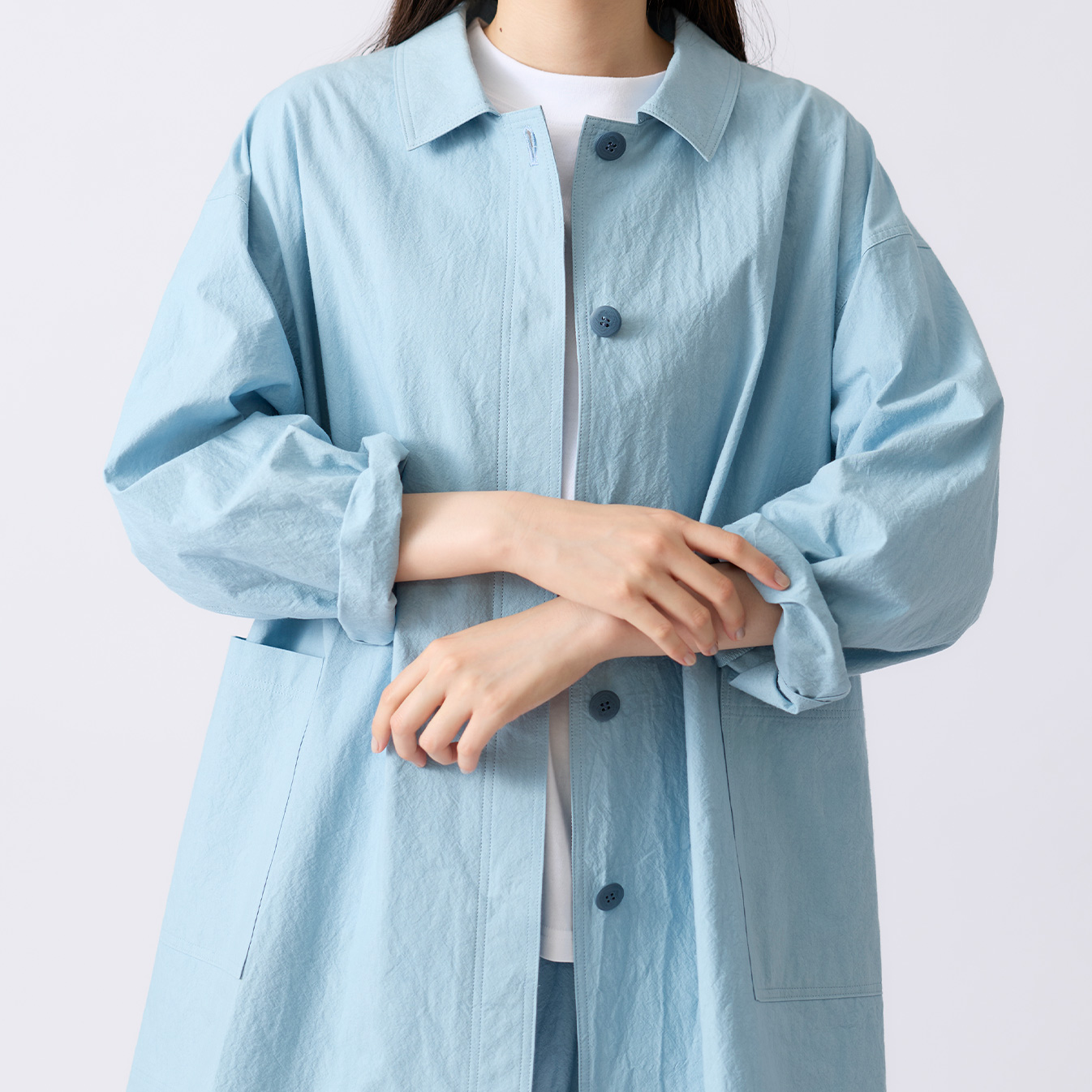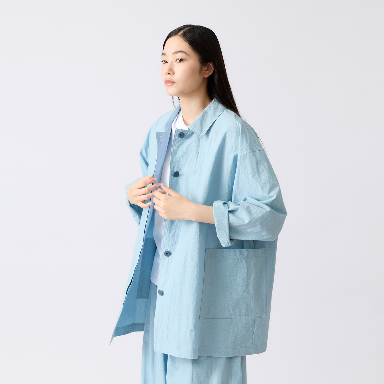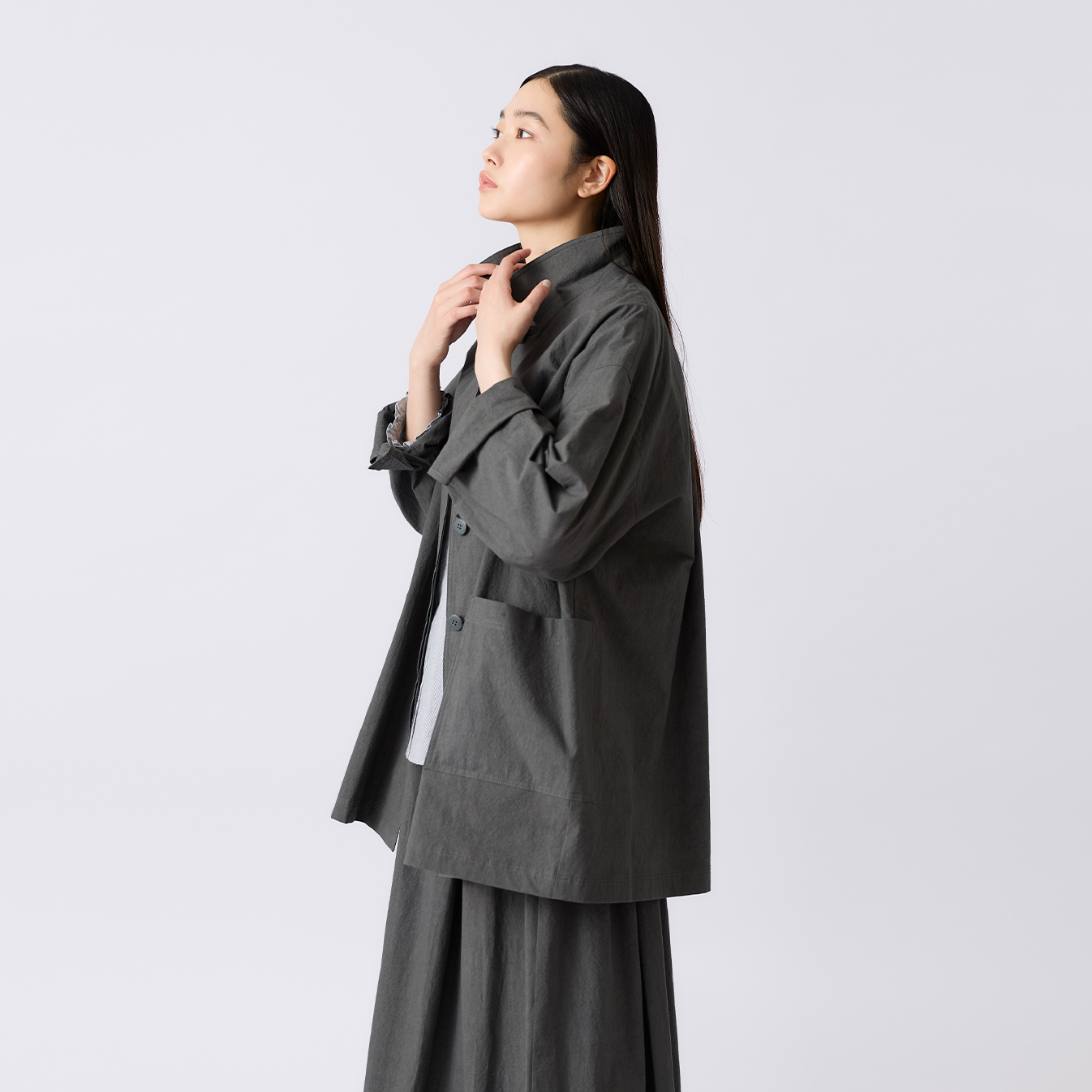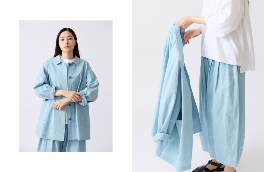 ハリのある生地だから、襟を立てたり、袖口をくるっと巻いたりとアレンジも自在。