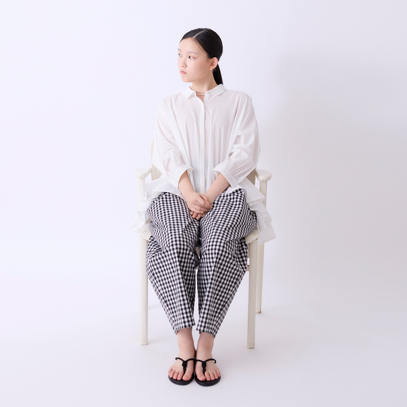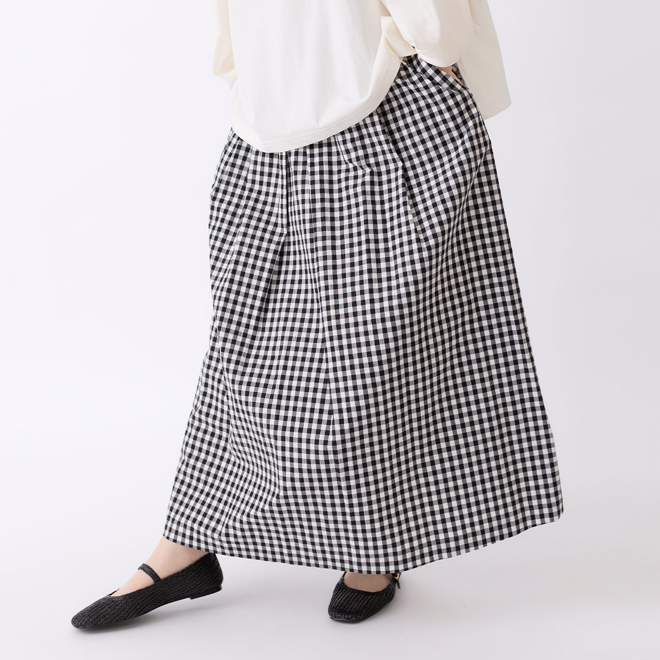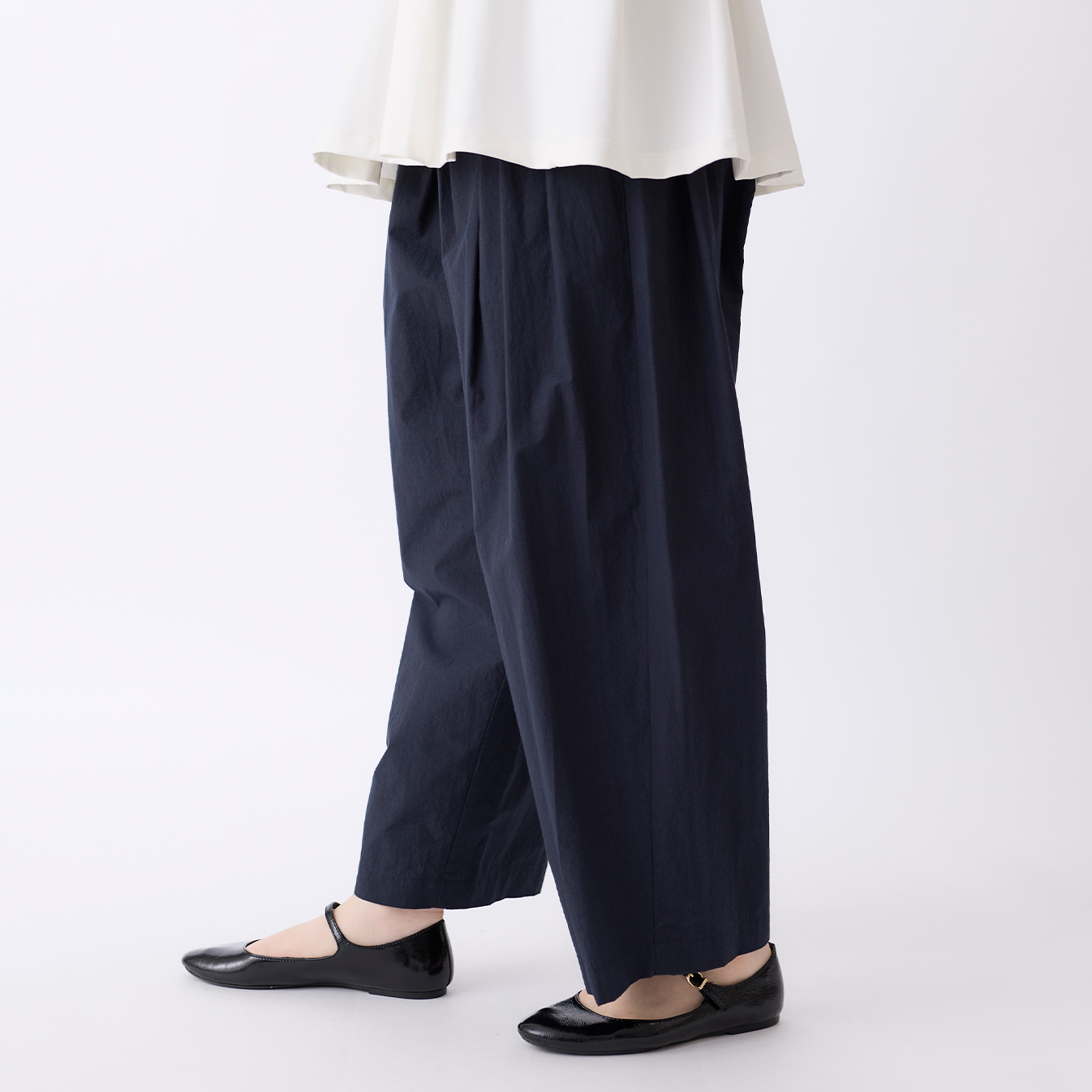 腰まわりにはタックを入れ、ゆとりを持たせたデザインに。