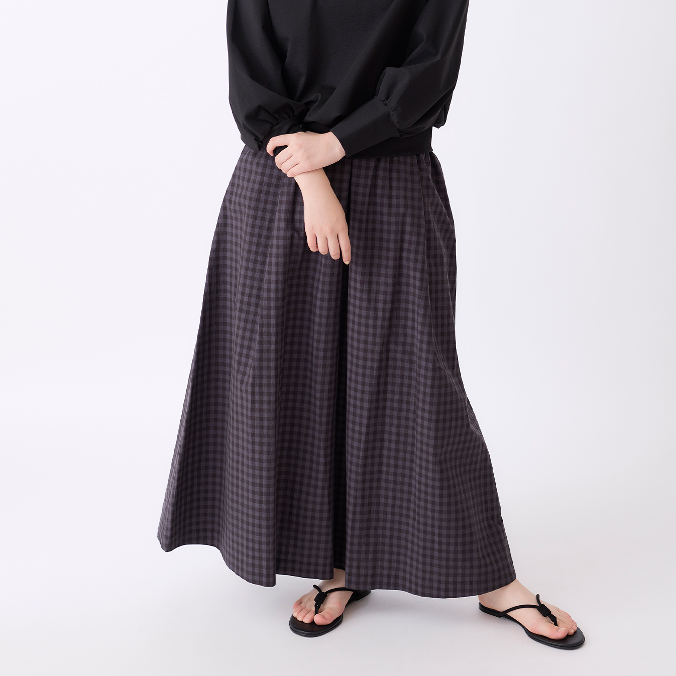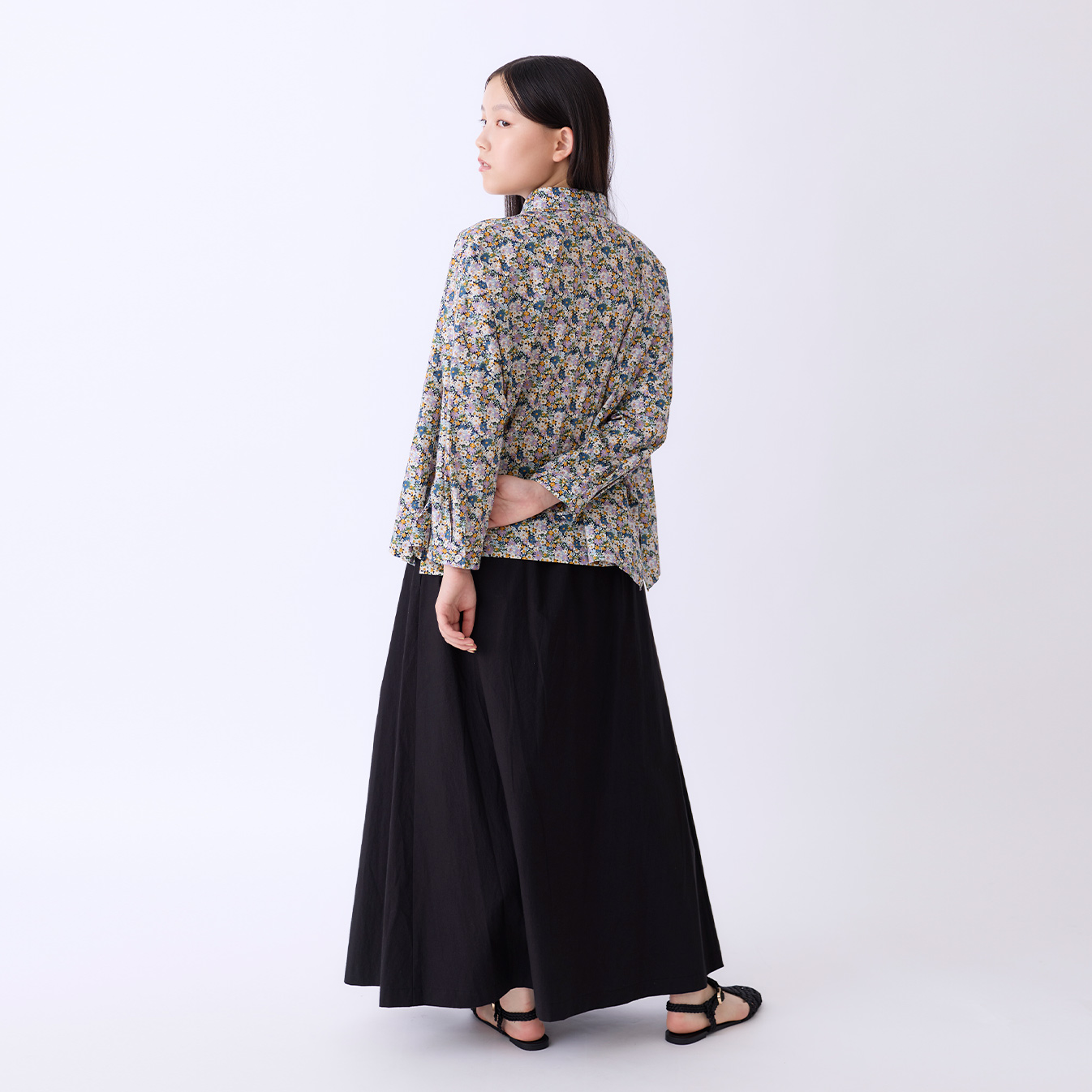 裾に向かってふんわりと広がるシルエットが、歩くたびに軽やかな動きを生み出します。