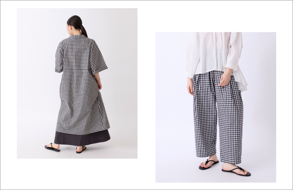 今回は、このタイプライター生地を使用したワンピースとボトムスをご紹介。