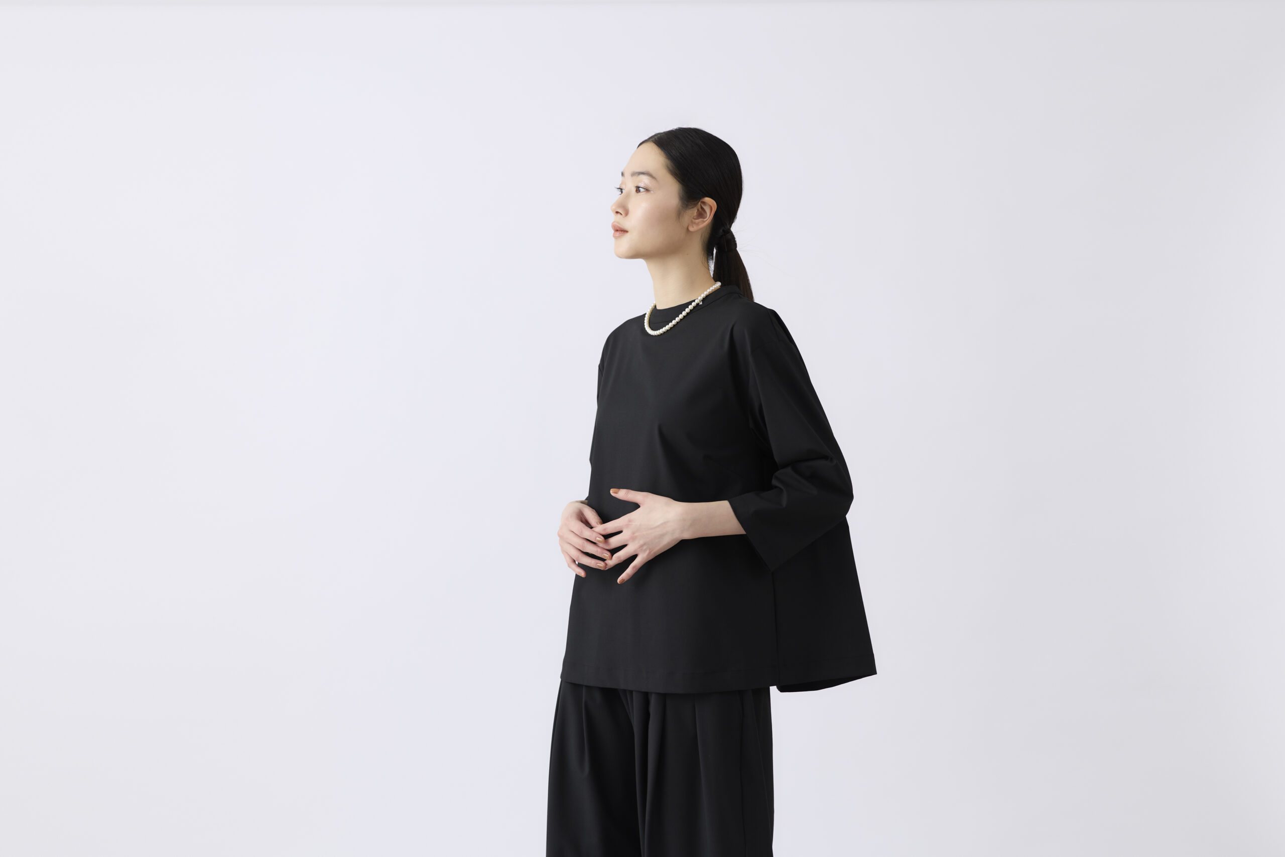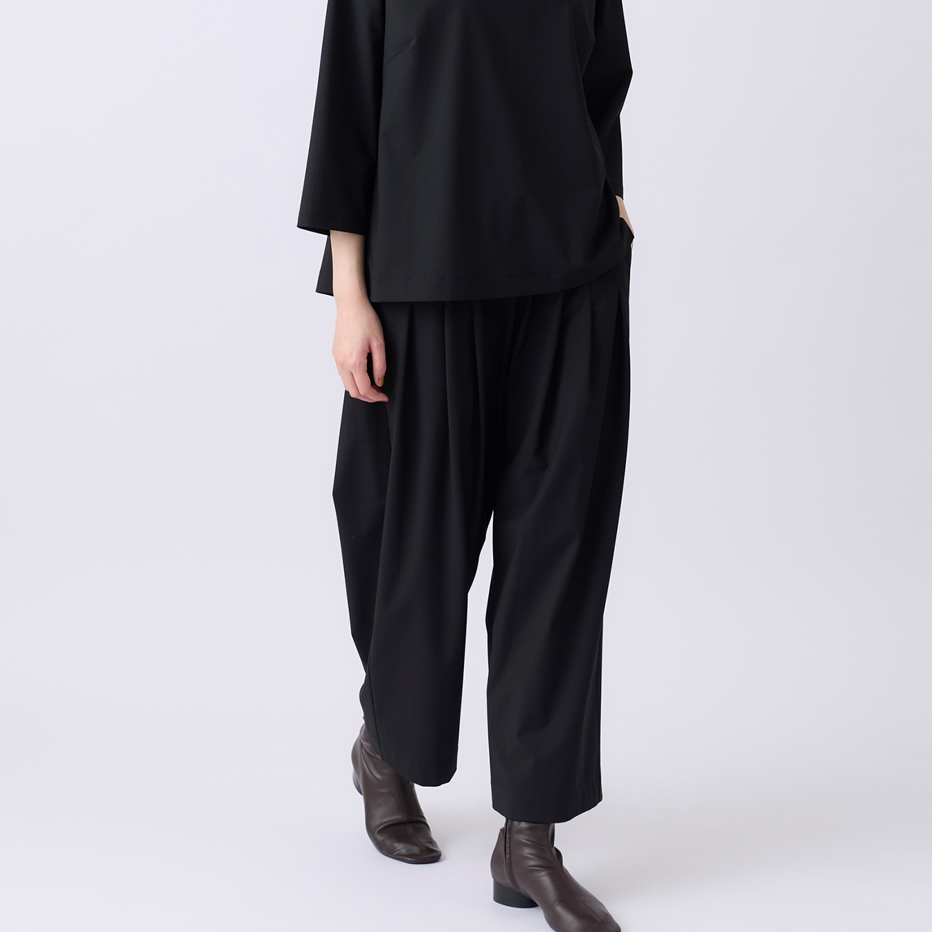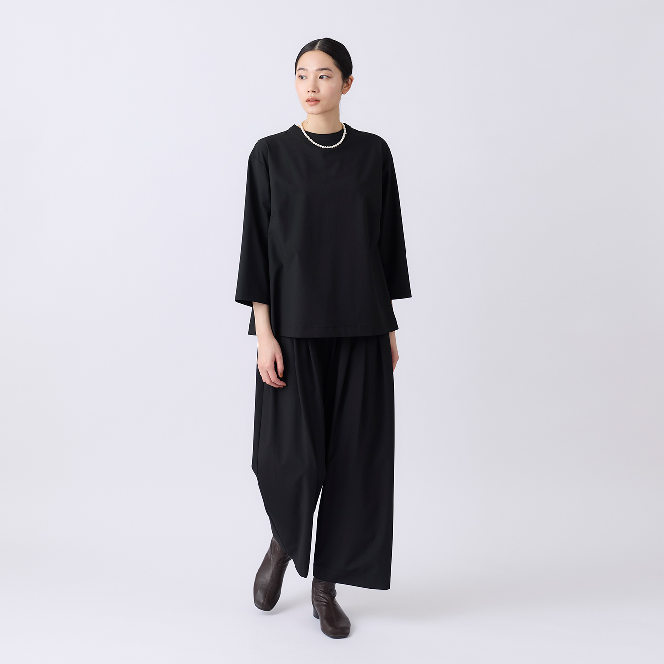落ち感のある素材が自然なドレープを生み、シンプルながらも奥行きのある表情をつくります。