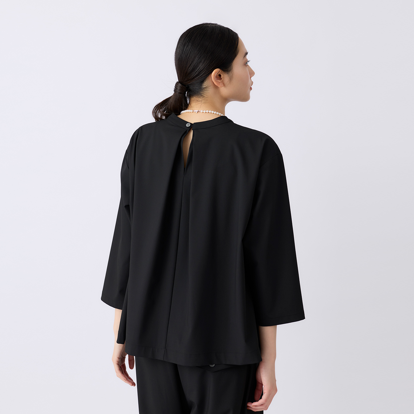 ノーカラーのミニマルなネックラインが顔まわりをすっきりと見せ、アクセサリーも映えるデザインです。