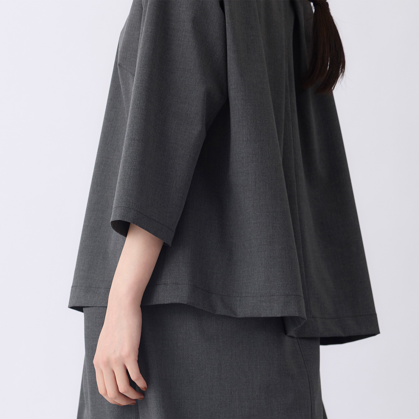 ほどよくゆとりのあるシルエットで、身体のラインを拾いすぎず、すっきりとした印象に。