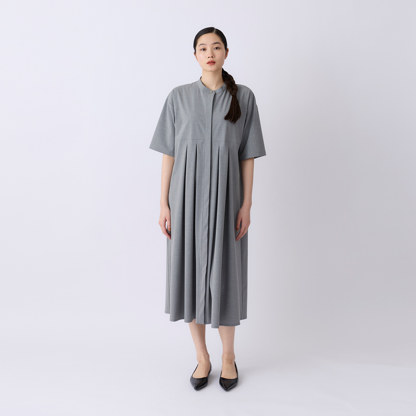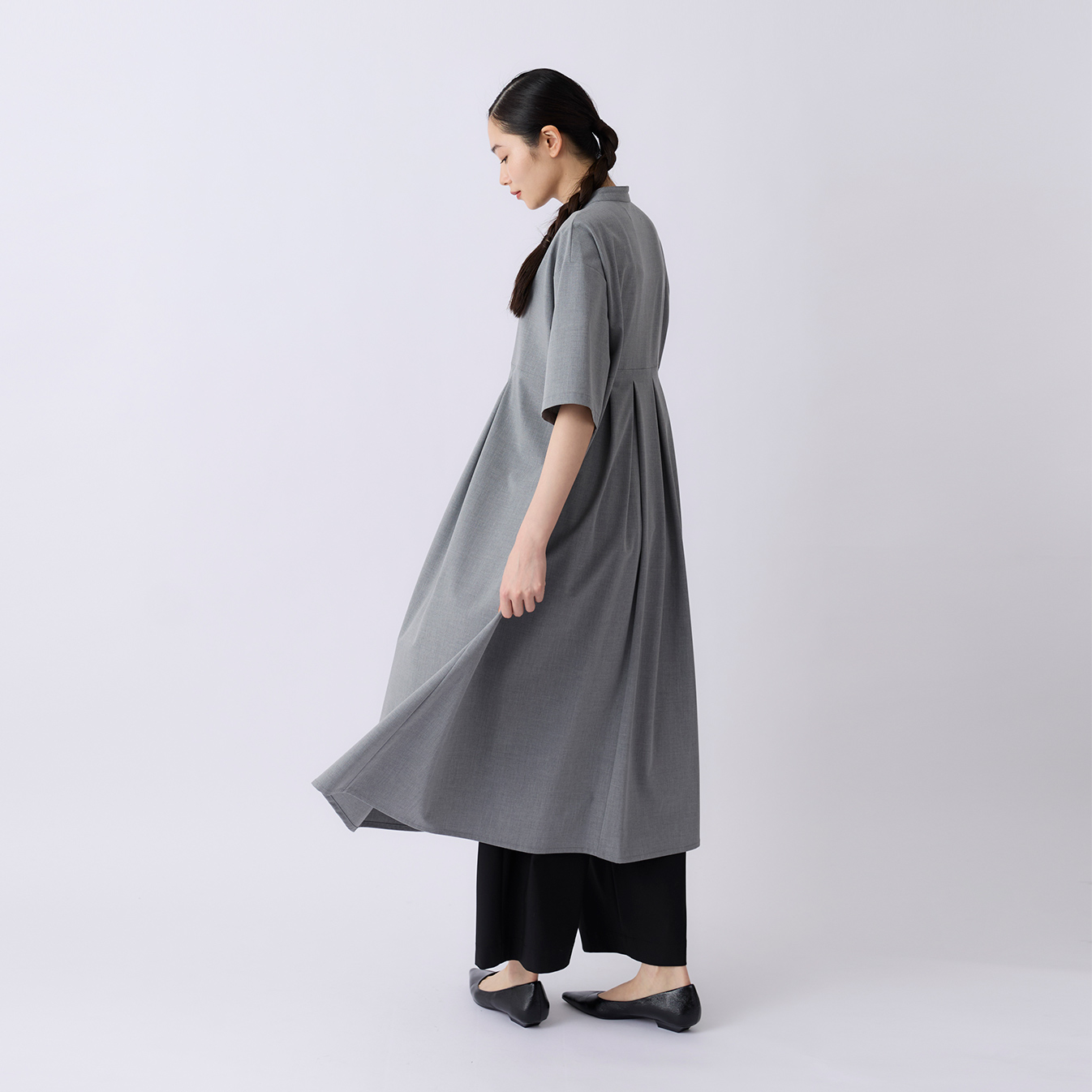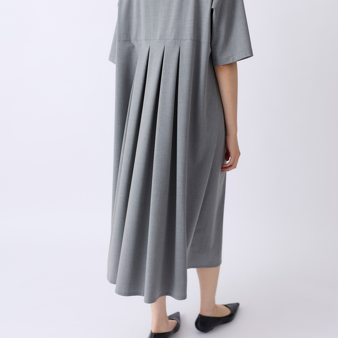 胸下から前後に施したプリーツが、広がりすぎず、動きに合わせてやわらかく揺れる立体的なシルエットに。